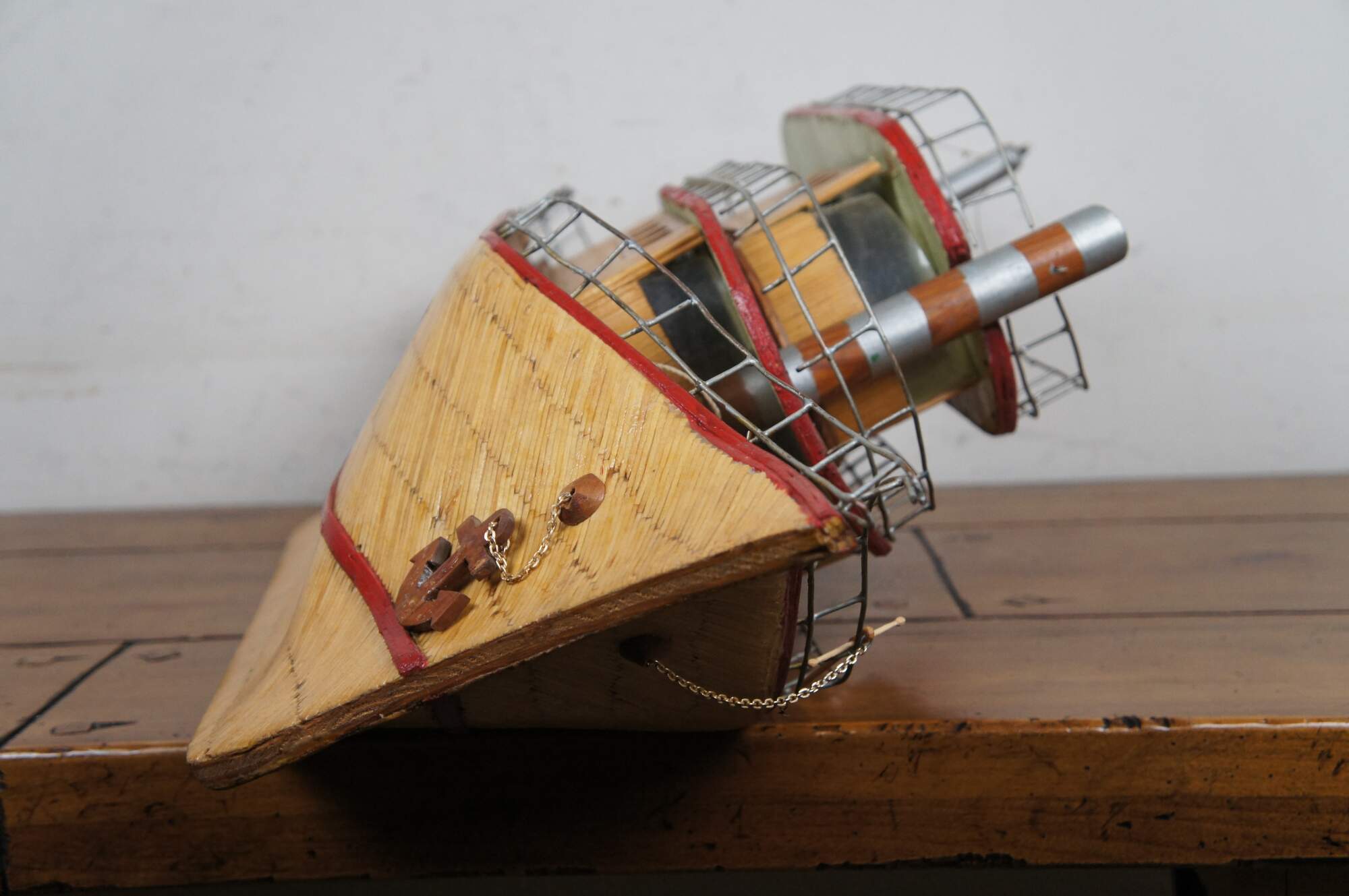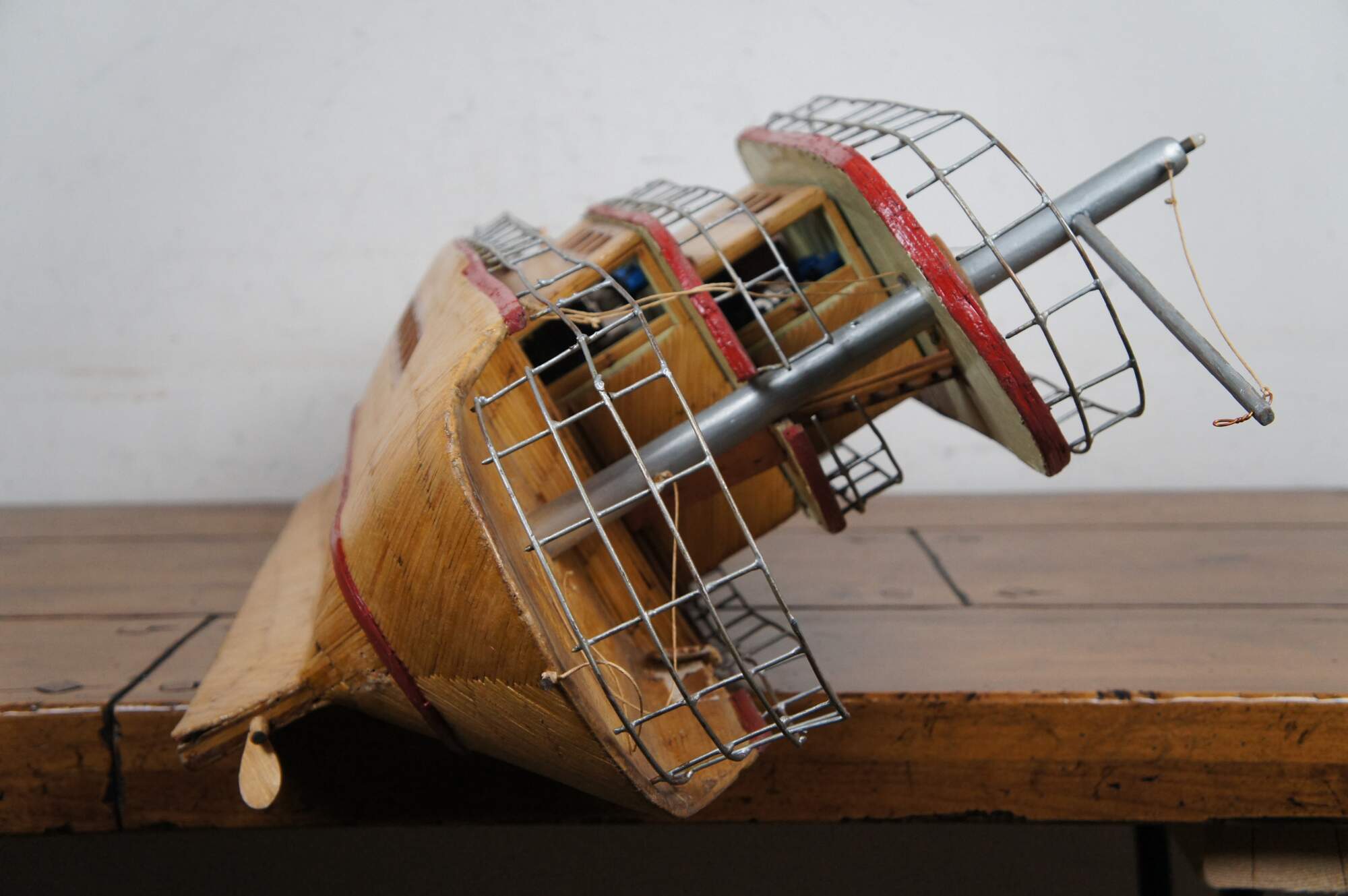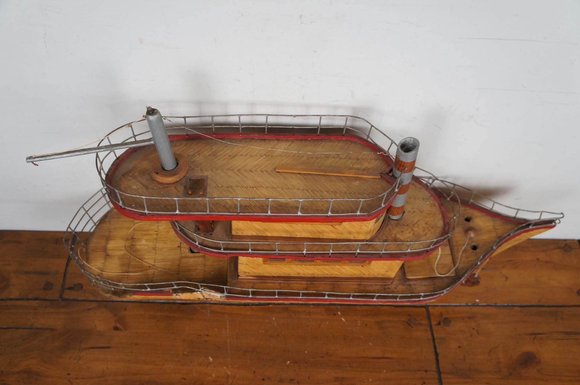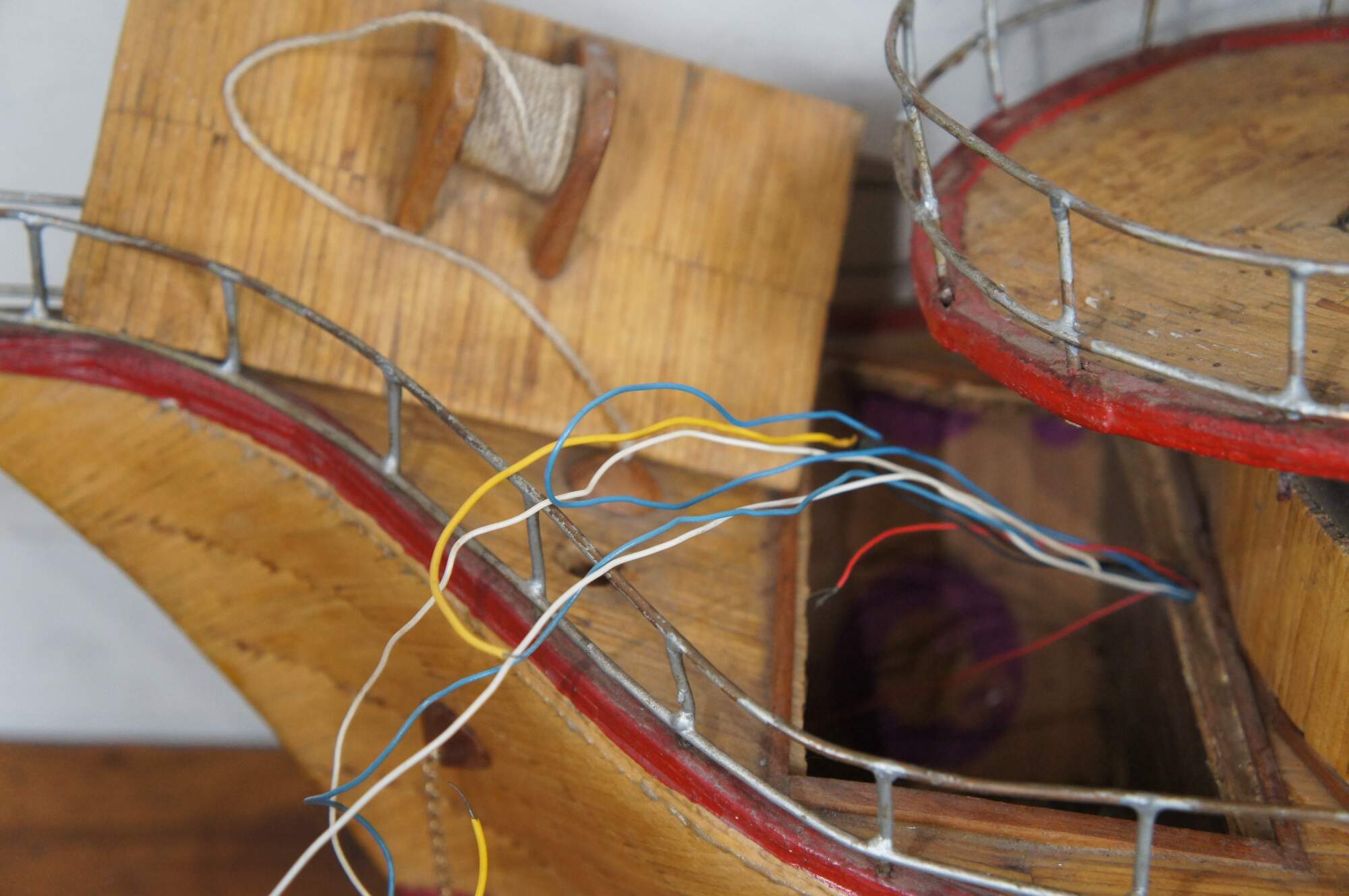 Mid century three tiered prison folk art / tramp art model steam boat sculpture. Upcycled cardboard framing structure, matchstick exterior with glossy finish, red trim, soldered wire railings, plastic windows. interior cabin spaces and hold are complete with seating, ship's wheel and light bulbs. Wiring for the lights is accessed through the cargo hold at the front of the ship under the rope spool (no power is currently wired in). Includes several detached / partially broken pieces as well as one half moon lobster cage and five blue and purple spools of rope.