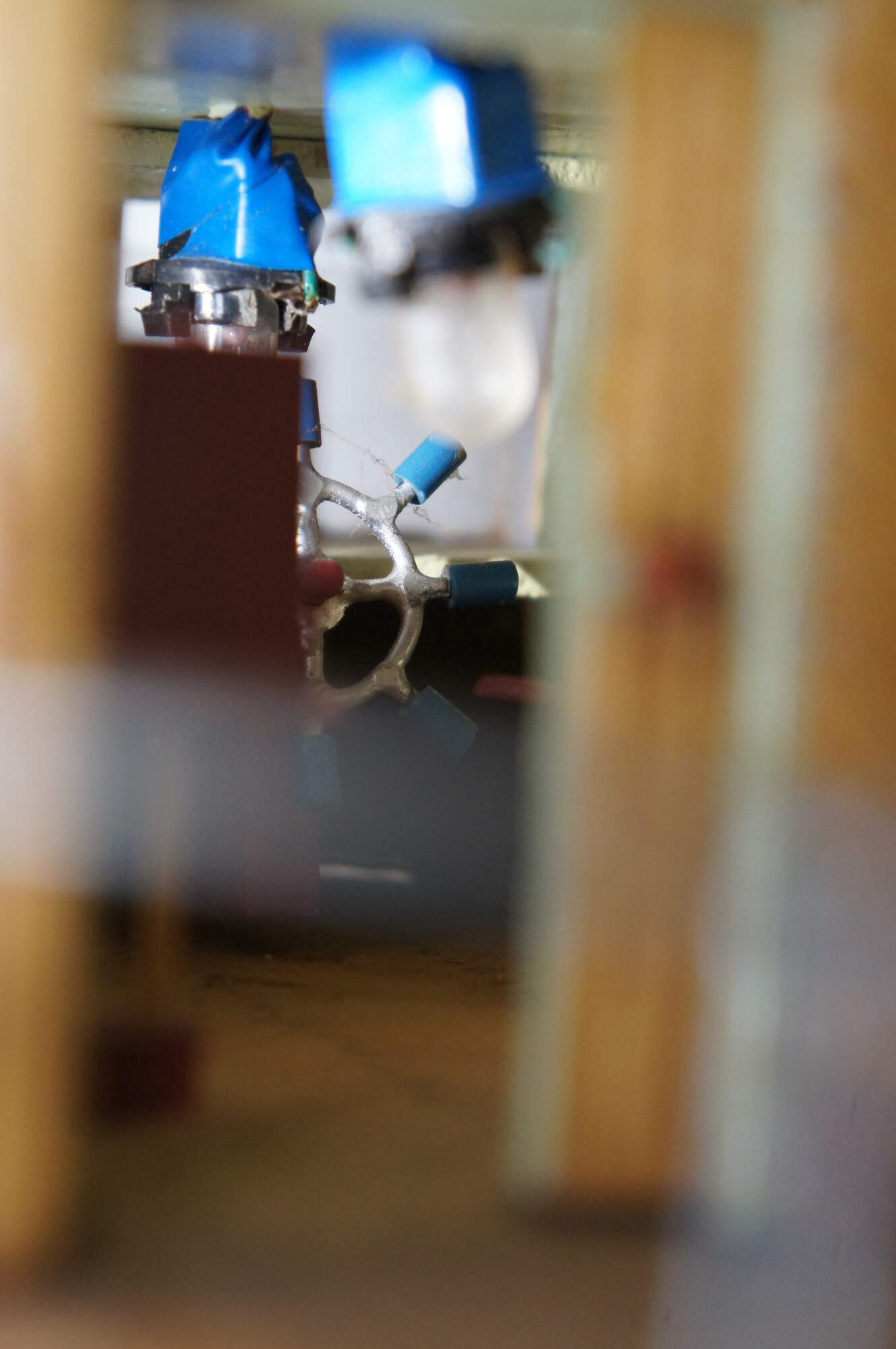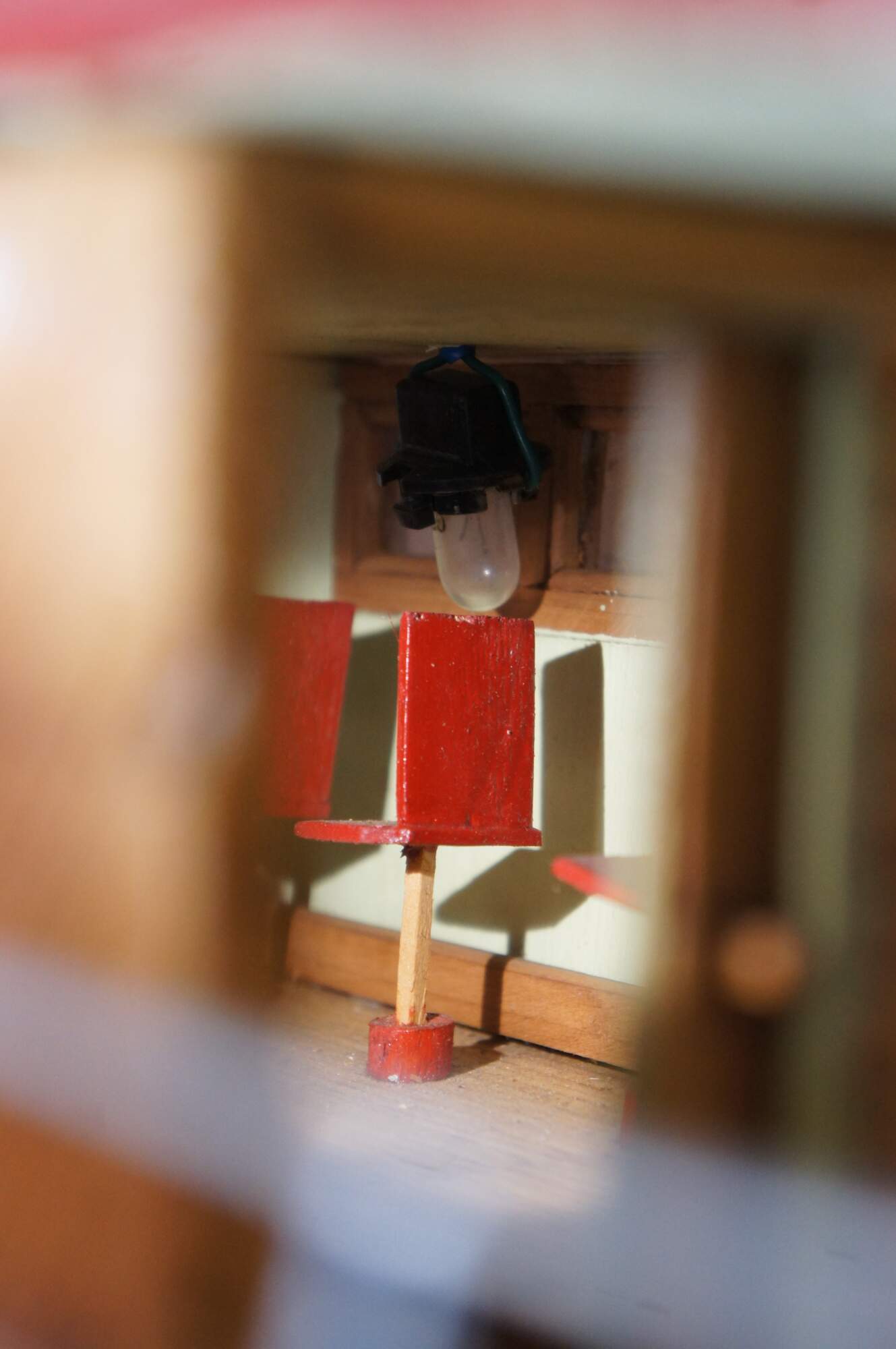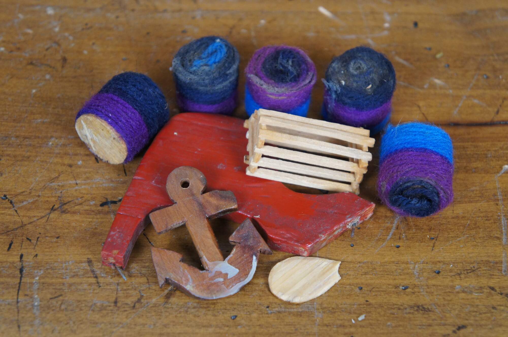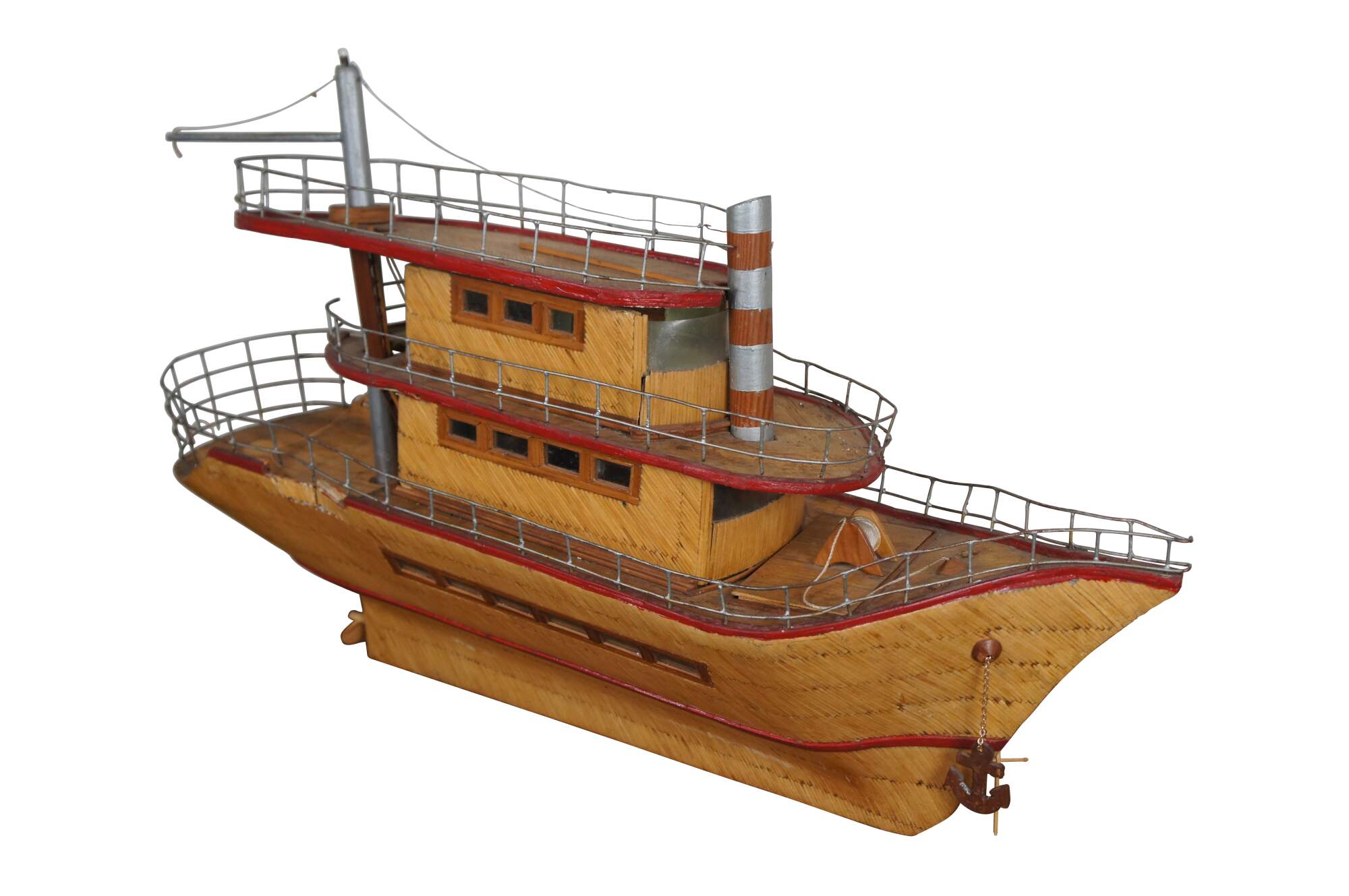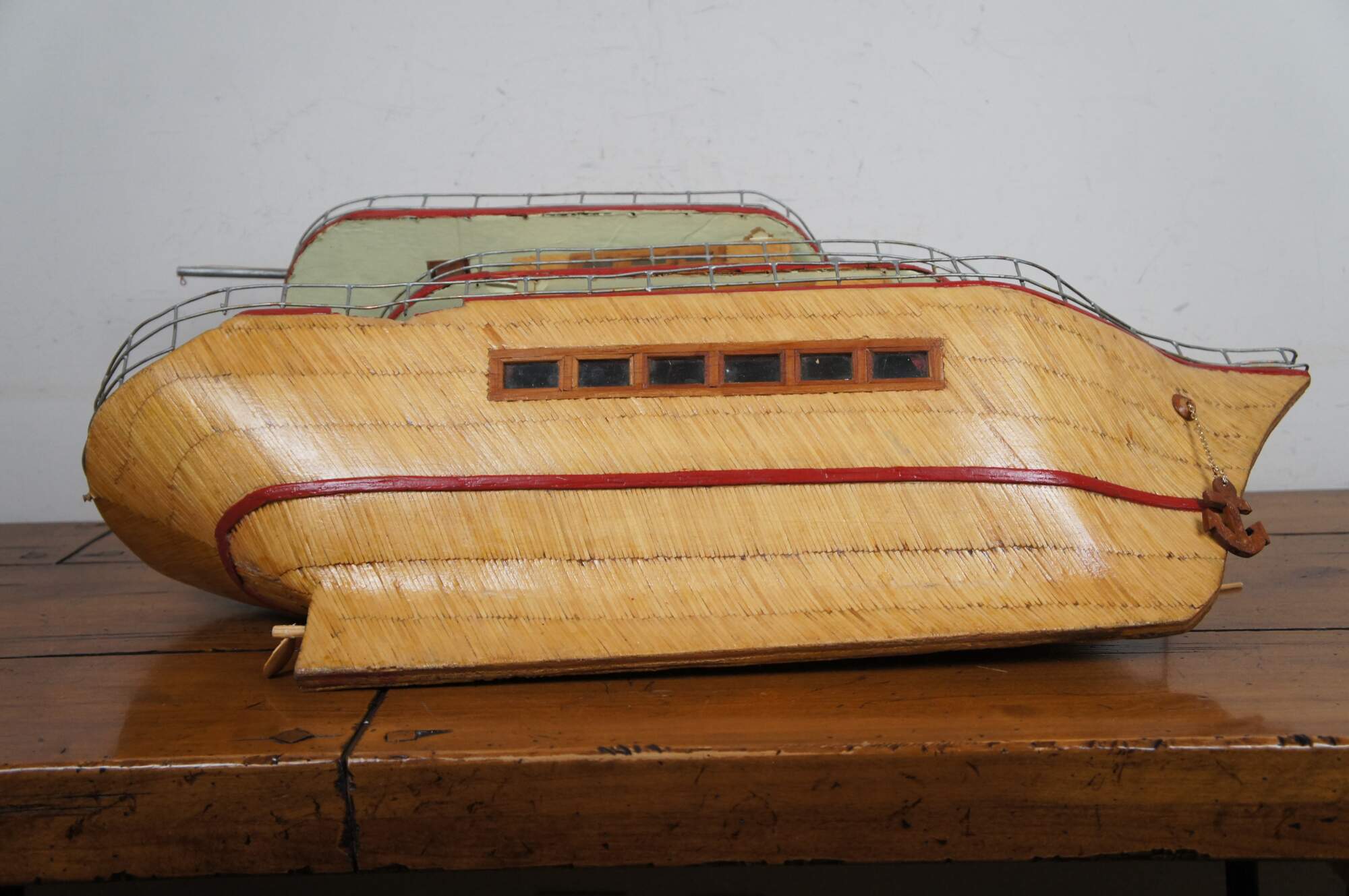 Mid century three tiered prison folk art / tramp art model steam boat sculpture. Upcycled cardboard framing structure, matchstick exterior with glossy finish, red trim, soldered wire railings, plastic windows. interior cabin spaces and hold are complete with seating, ship's wheel and light bulbs. Wiring for the lights is accessed through the cargo hold at the front of the ship under the rope spool (no power is currently wired in). Includes several detached / partially broken pieces as well as one half moon lobster cage and five blue and purple spools of rope.