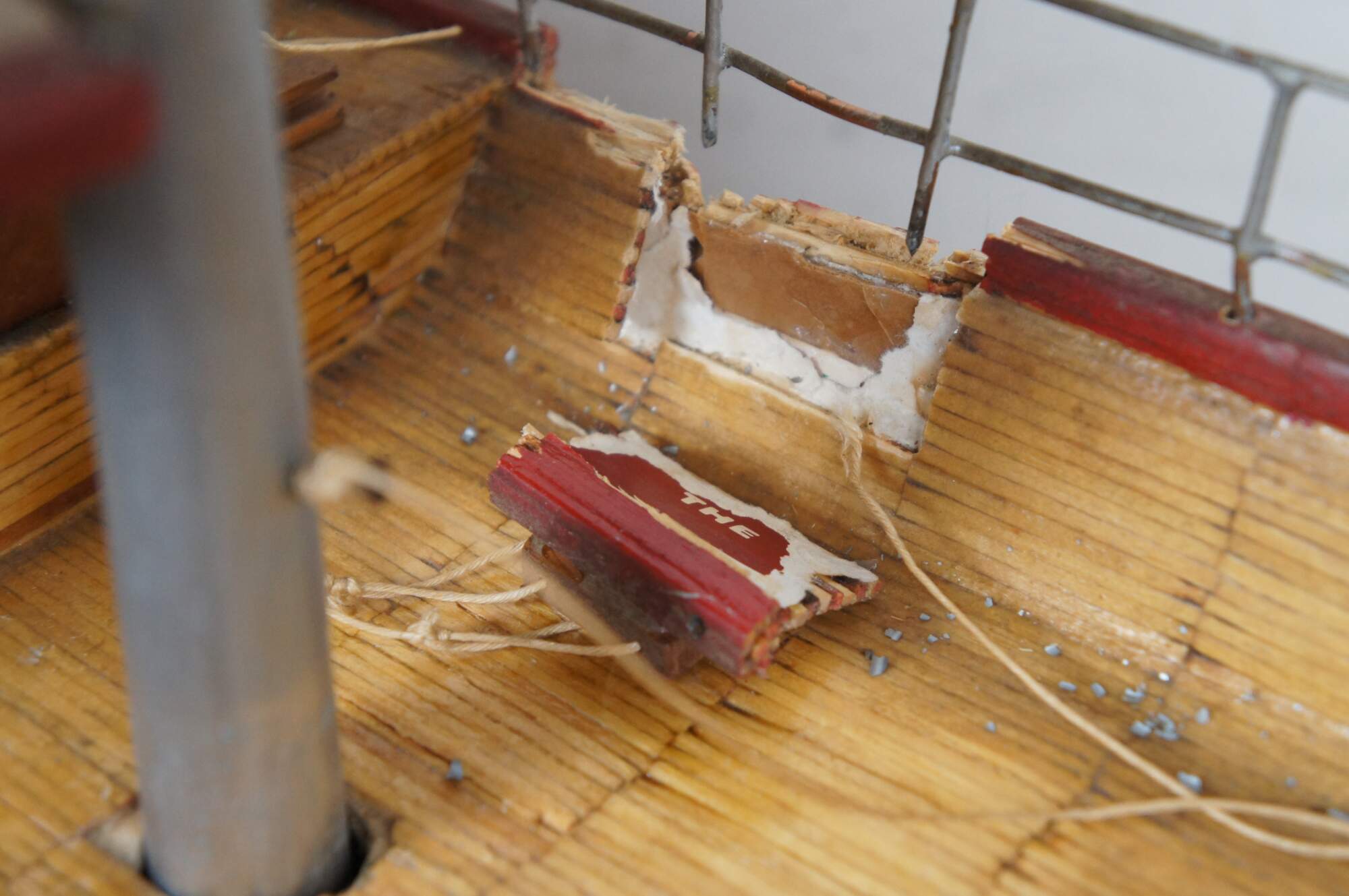 Fair Condition - Wear and distressing; wired for light but no power, not tested; several broken/detached pieces; oxidation to metal; railings partially detached from deck
