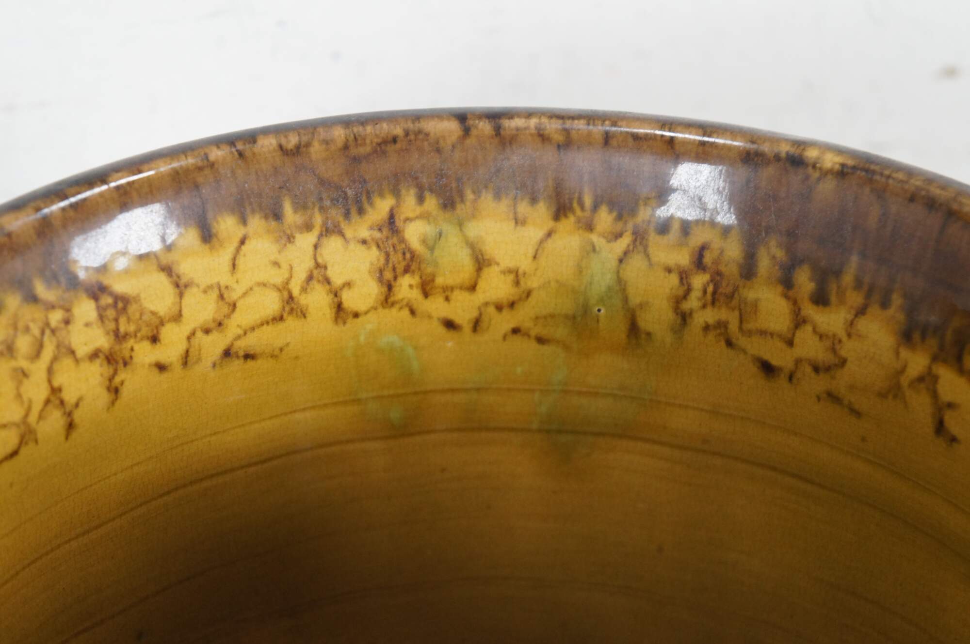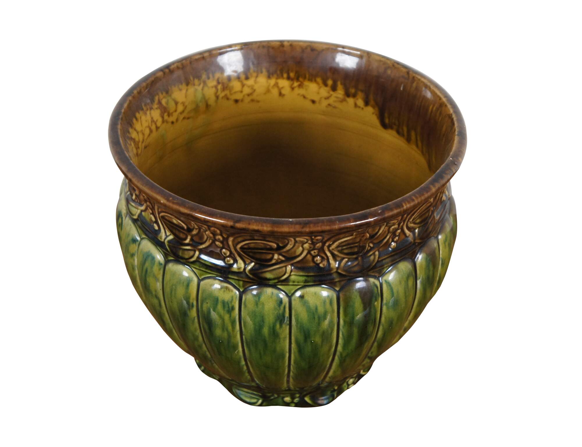 Antique green and brown glazed majolica art pottery planter / jardiniere. Features a a rounded shape with flared mouth and tapered base, decorated with bands of leaves and berries, and petal shaped fluting.