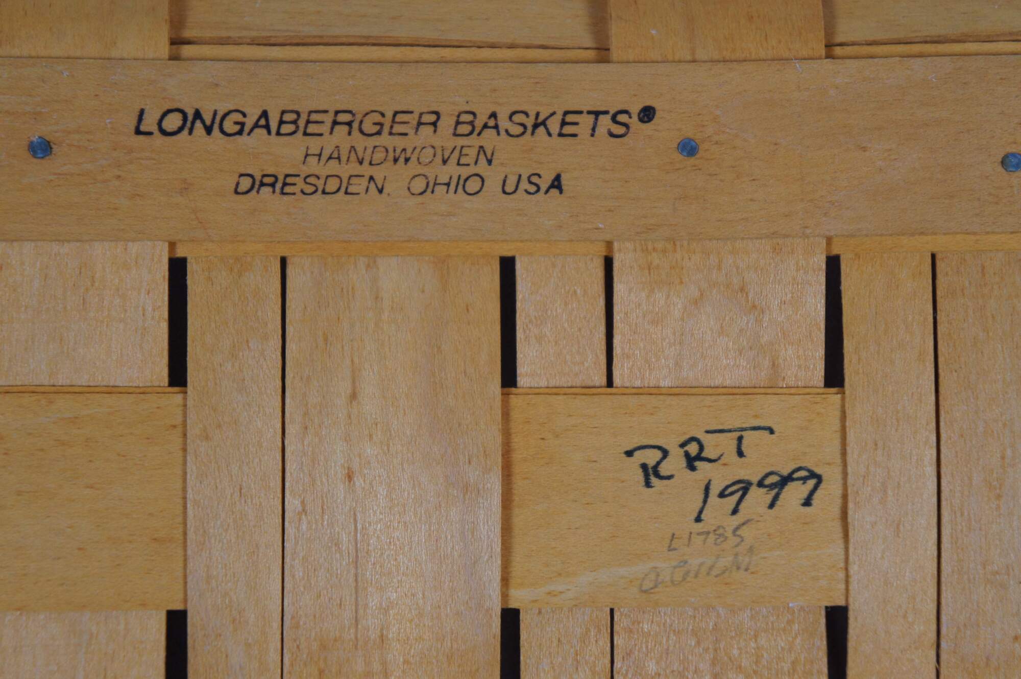 Vintage 1990s Longaberger Hostess Treasures harvest / gathering / picnic basket. Hand woven maple in a rectangular form with rotating bail hand;es and a pink and white striped cotton liner. Signed RRT 1999 / L1785 OCILM.
