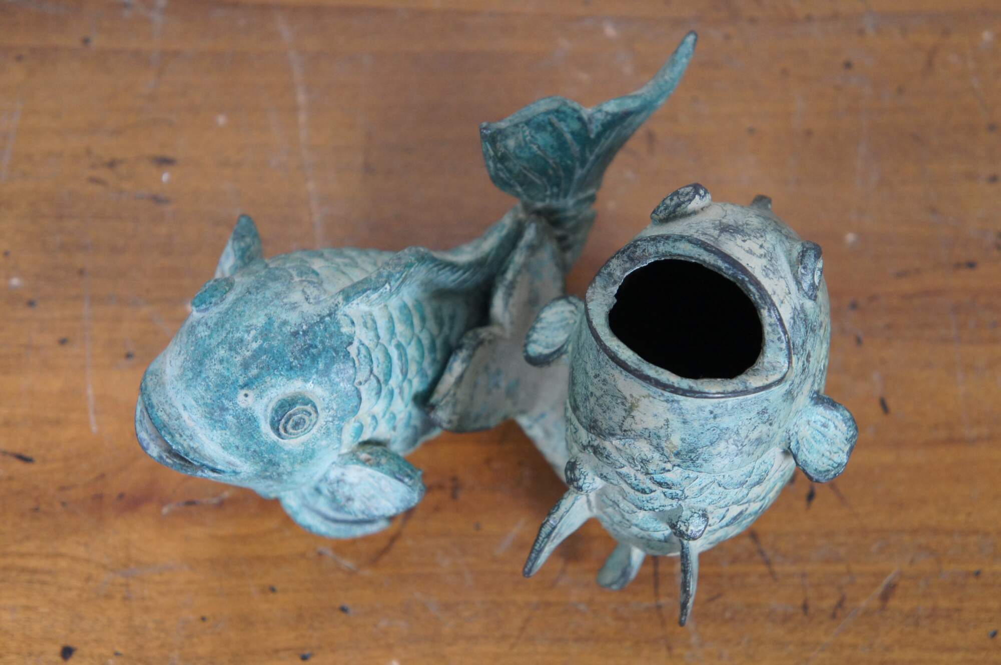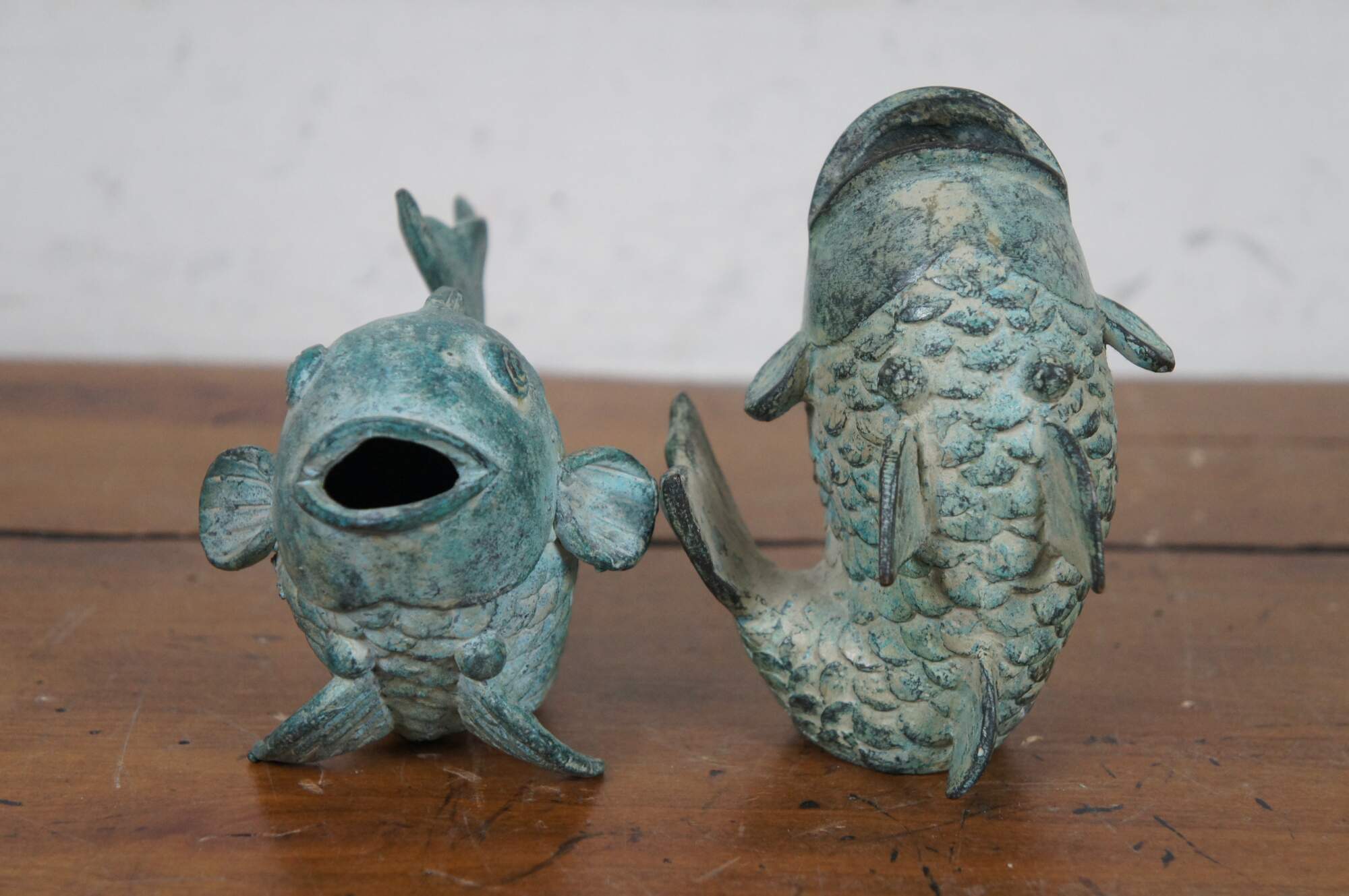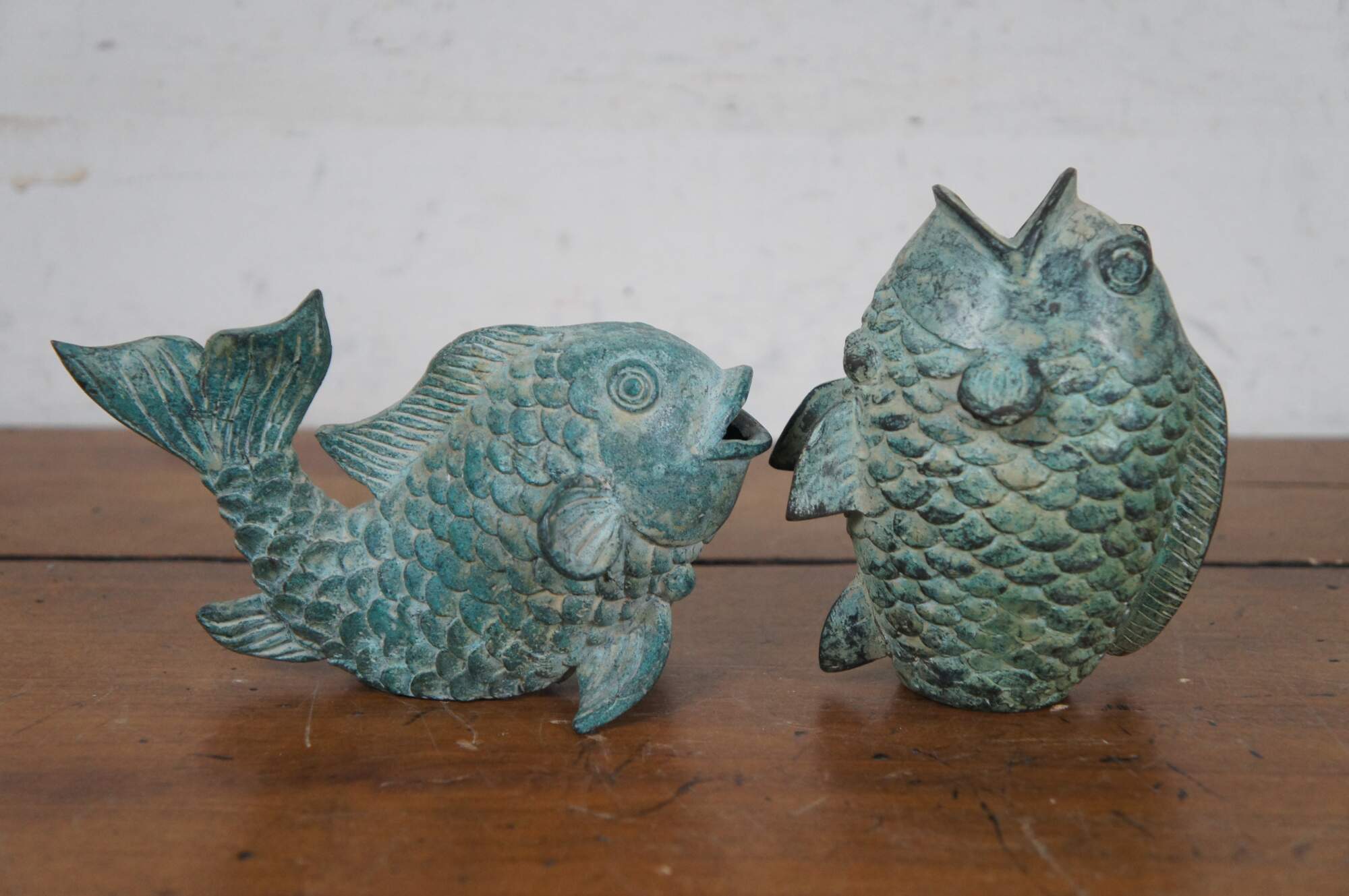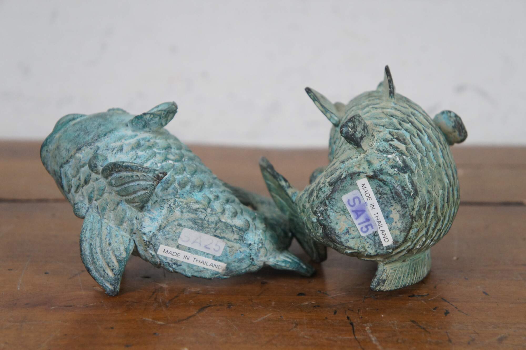 Pair of vintage cast metal figurines in the shape of koi fish, one perched on his belly, one upright on his tail. Made in Thailand. SA25