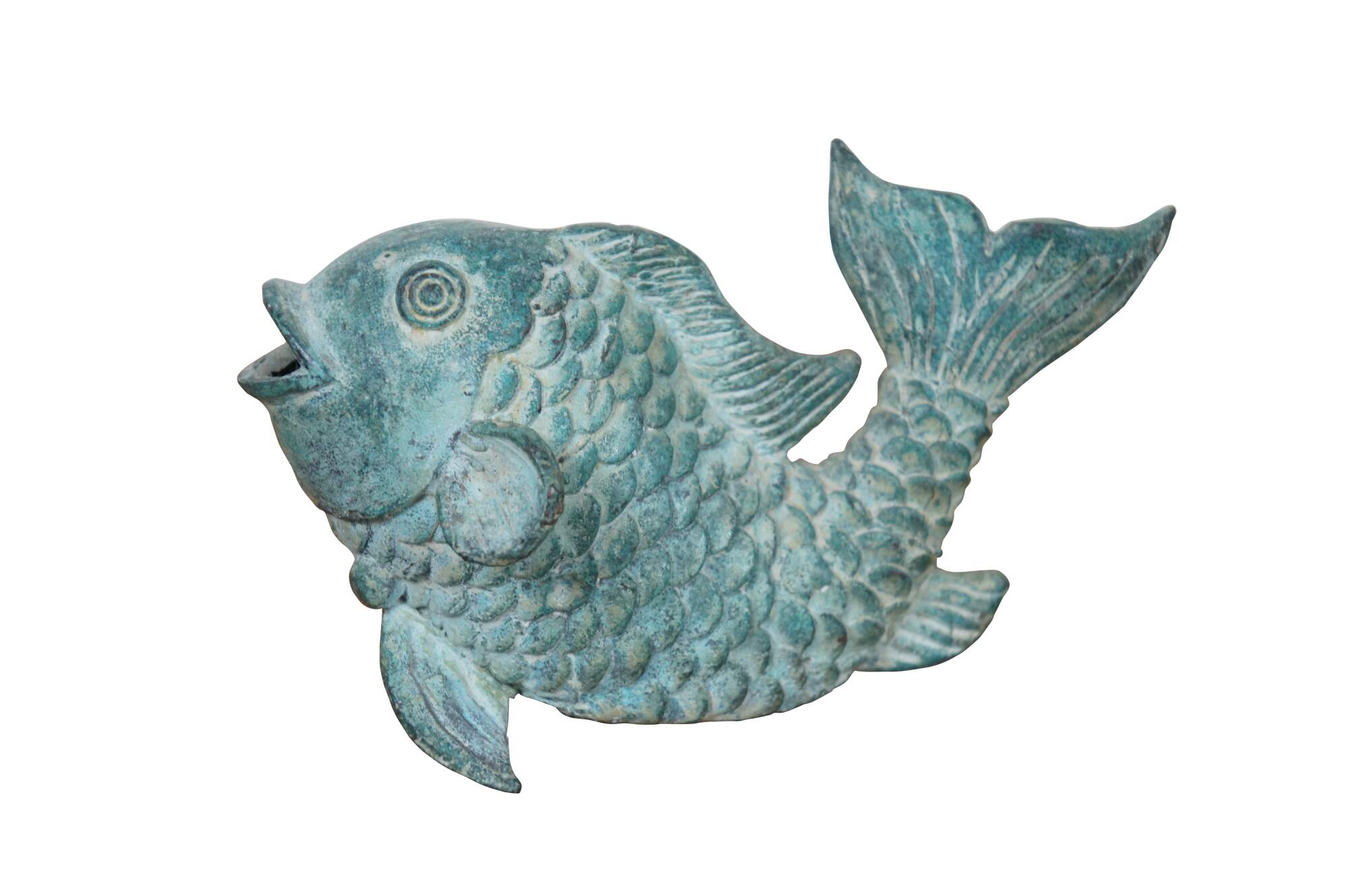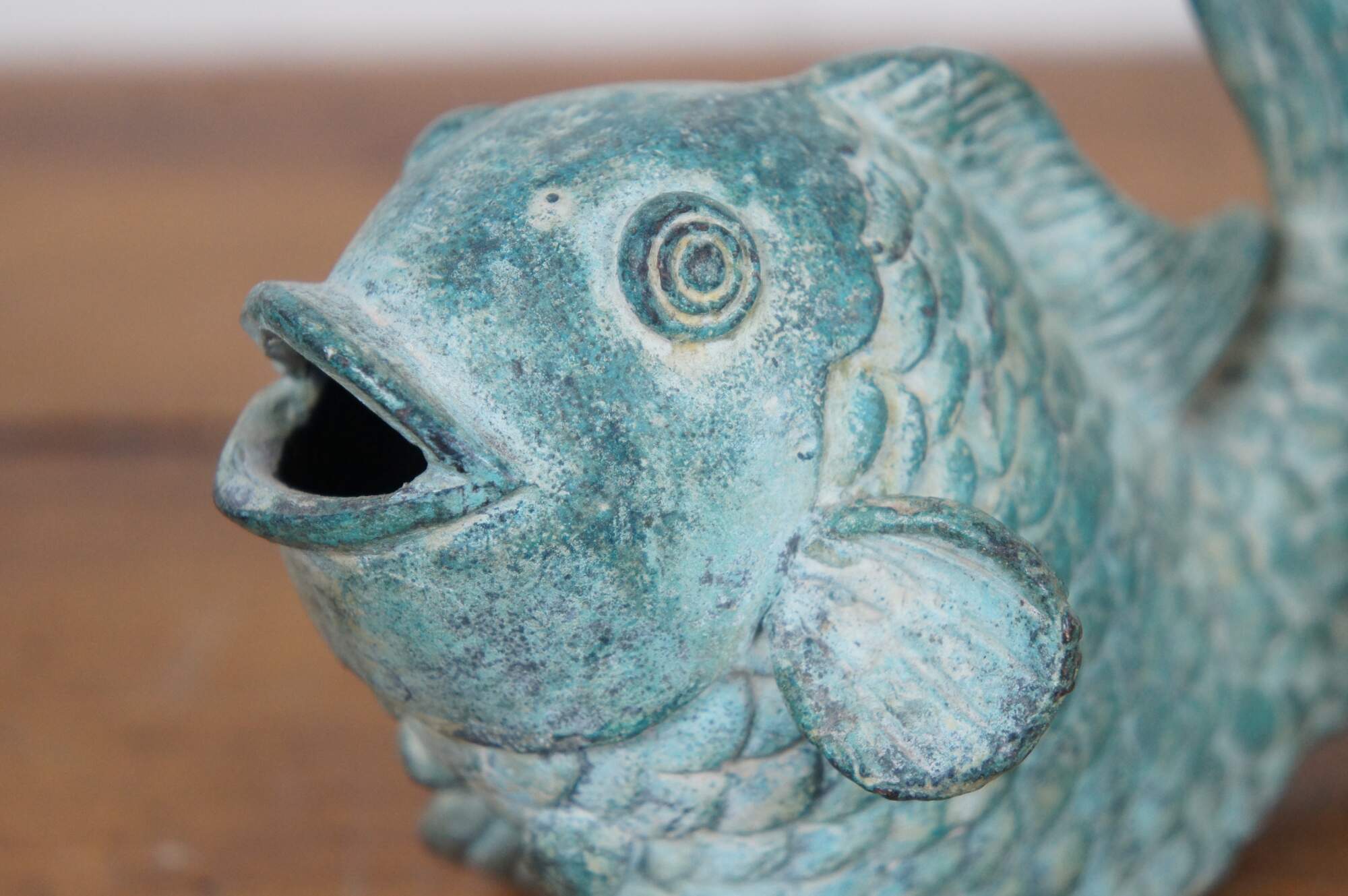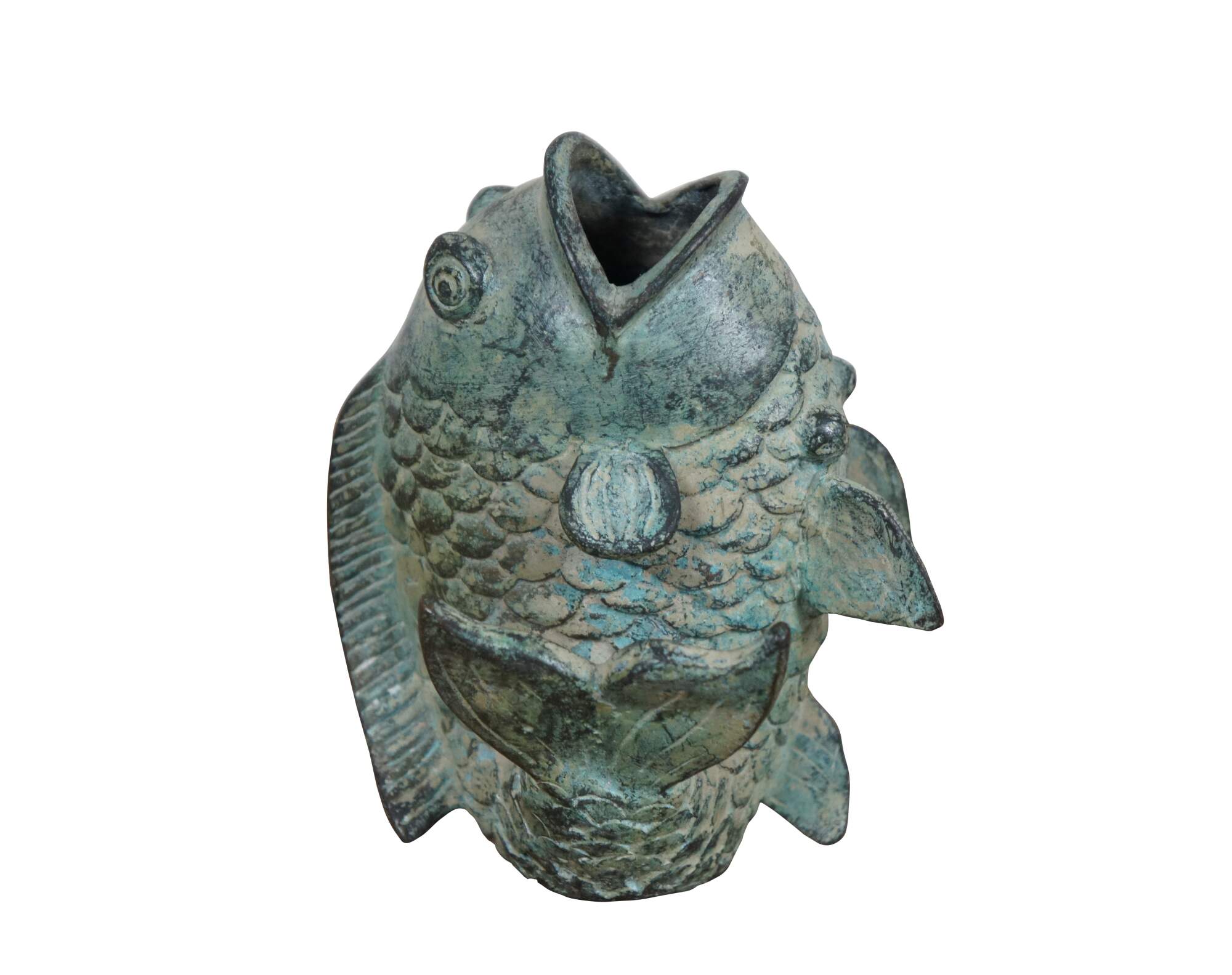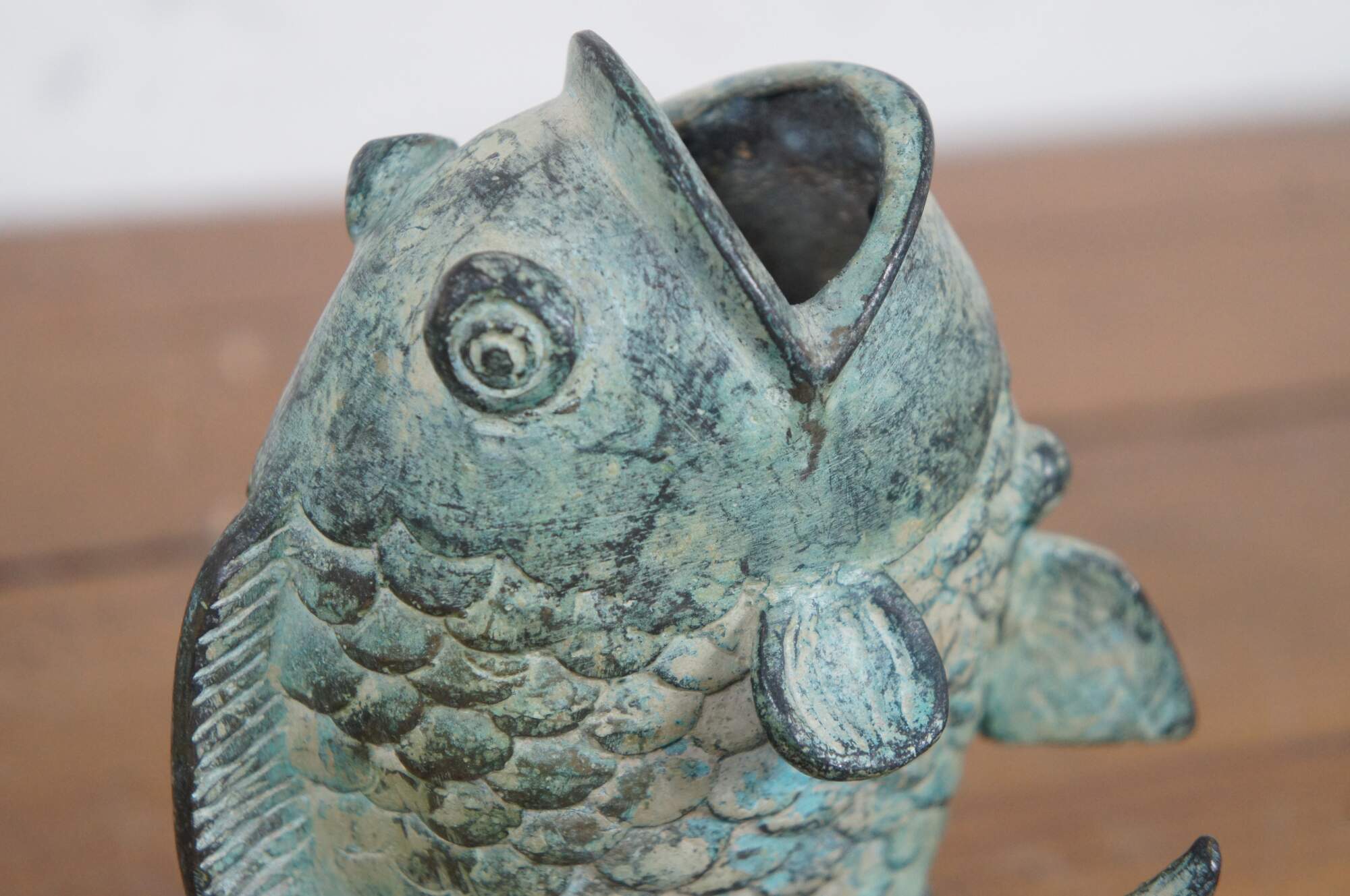 Pair of vintage cast metal figurines in the shape of koi fish, one perched on his belly, one upright on his tail. Made in Thailand. SA25