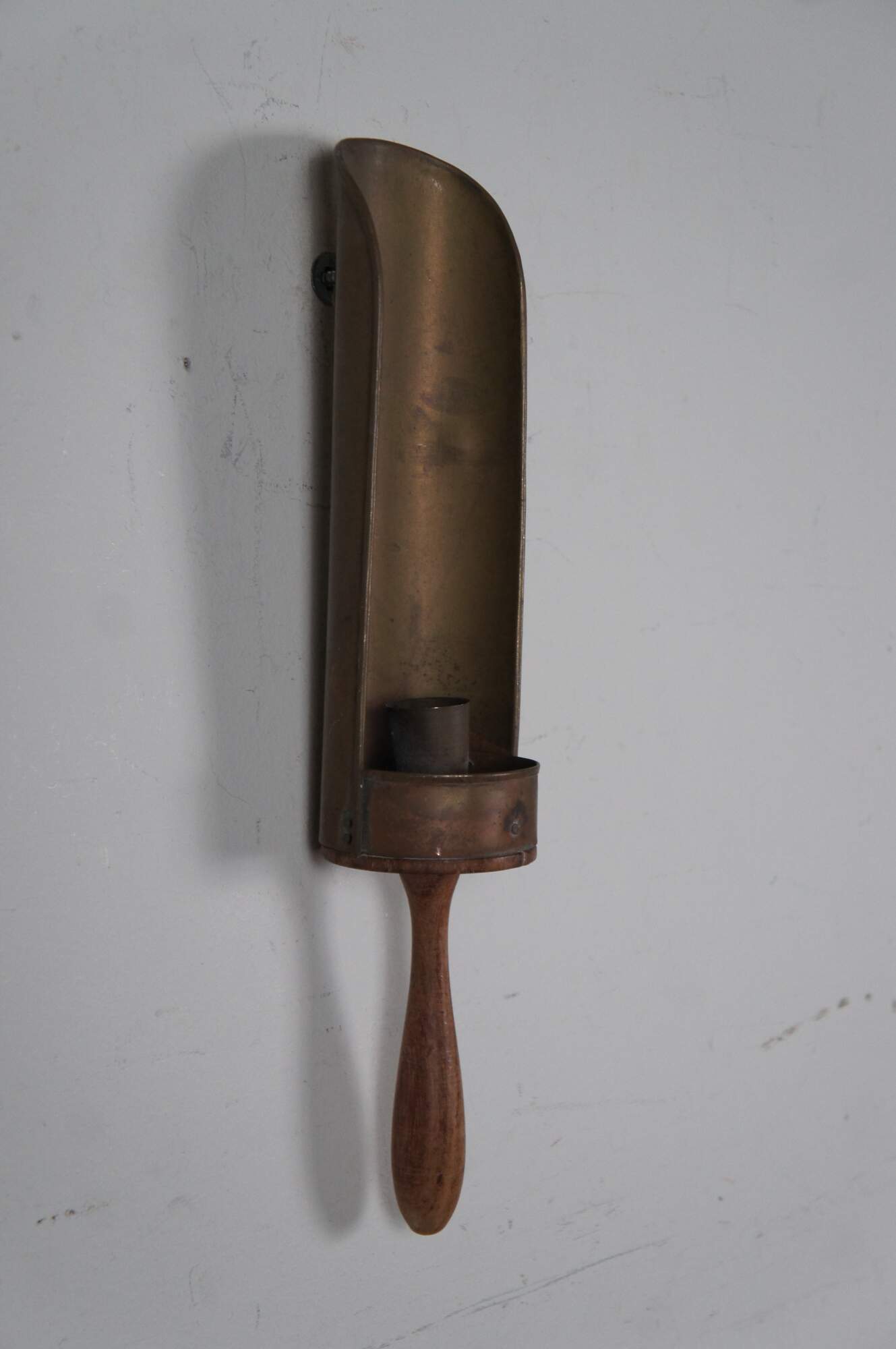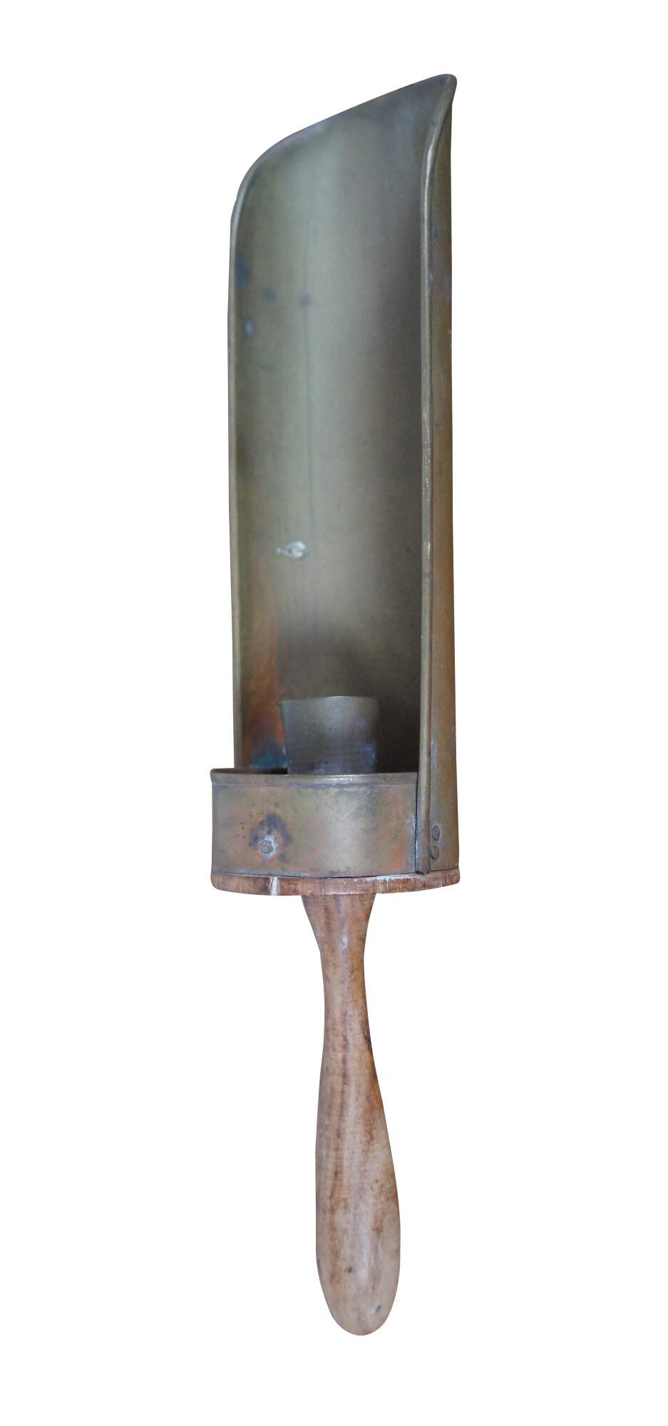 Vintage wall hanging candle holder crafted to resemble an antique brass grain scoop with turned wood handle. Single taper candle cup in base of scoop, which acts as a reflector. Hook on back for display. Made in India.