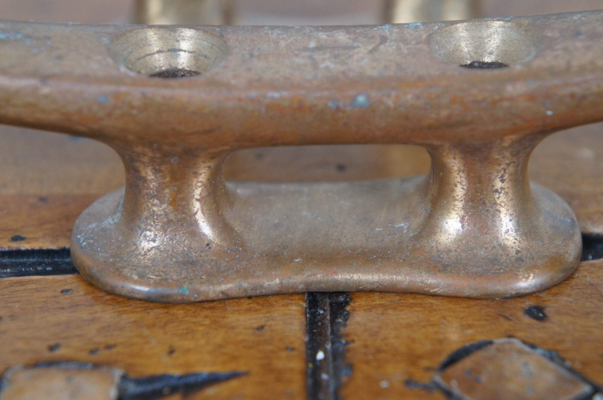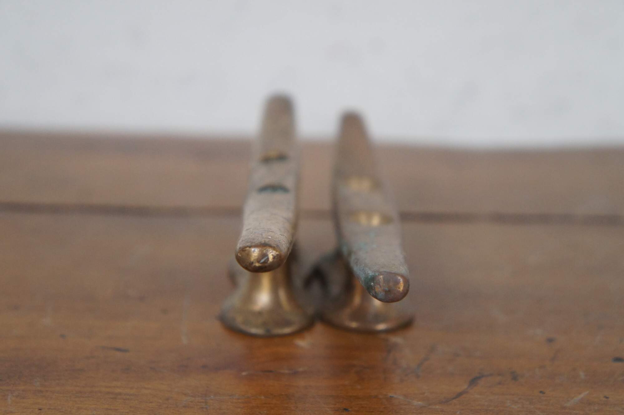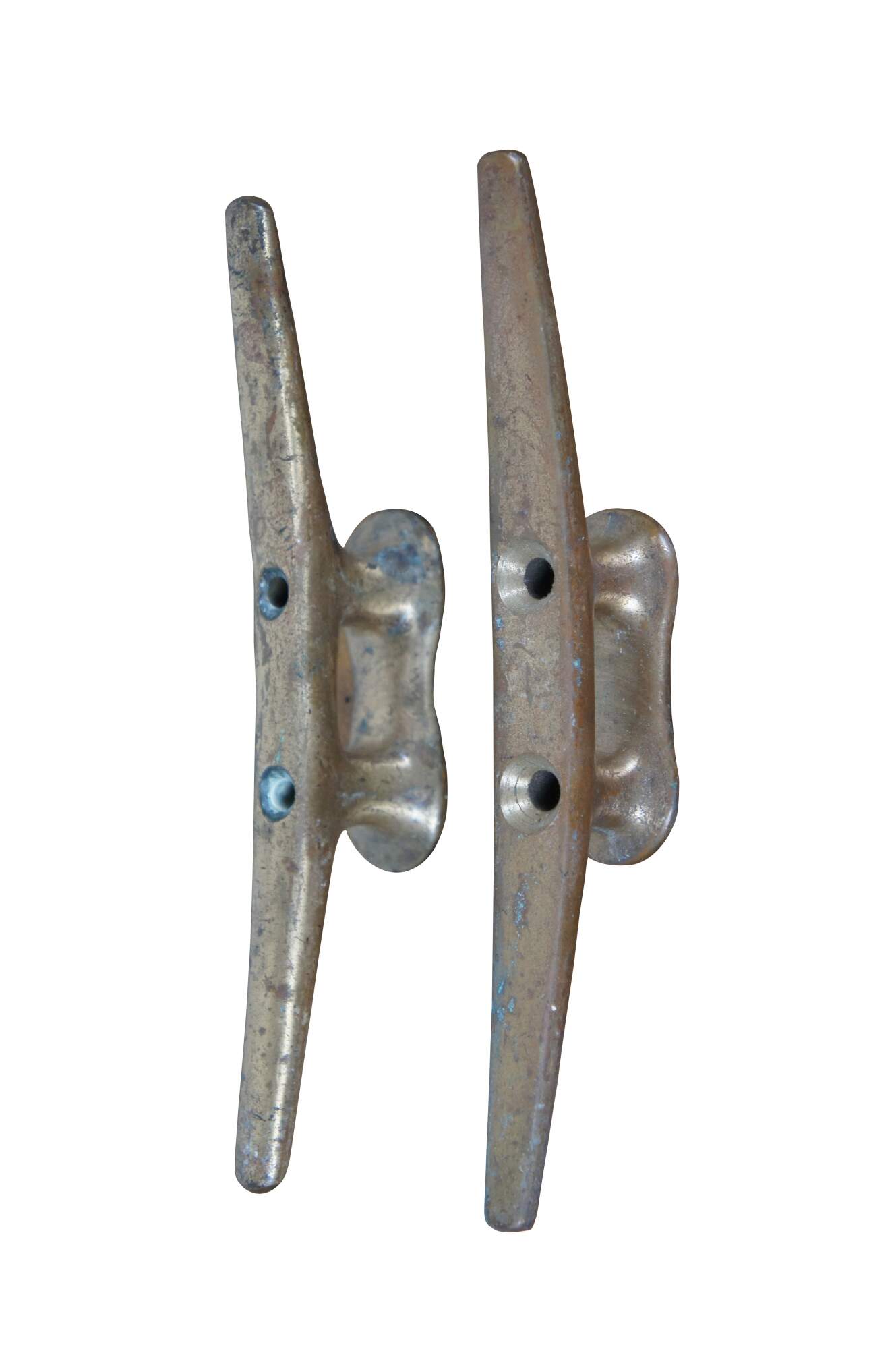 Pair of vintage brass horn cleat hooks, typically used as tie downs for nautical rope at docks and on boats. One marked 2054 on reverse.