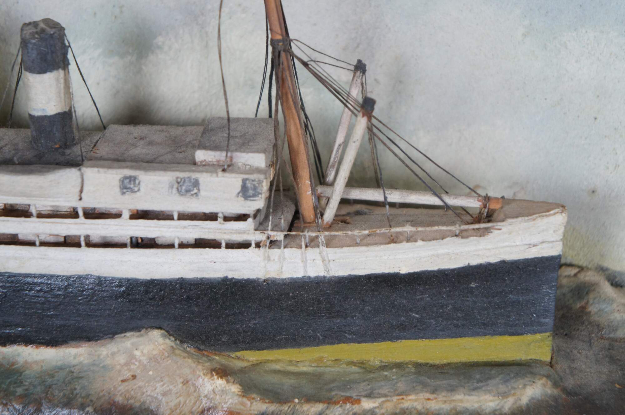 Antique three dimensional folk art diorama portraying a steam boat / oceanliner / ship on a choppy sea. The model is set in a rectangular shadowbox with white trim and brown wood frame with carved border.
