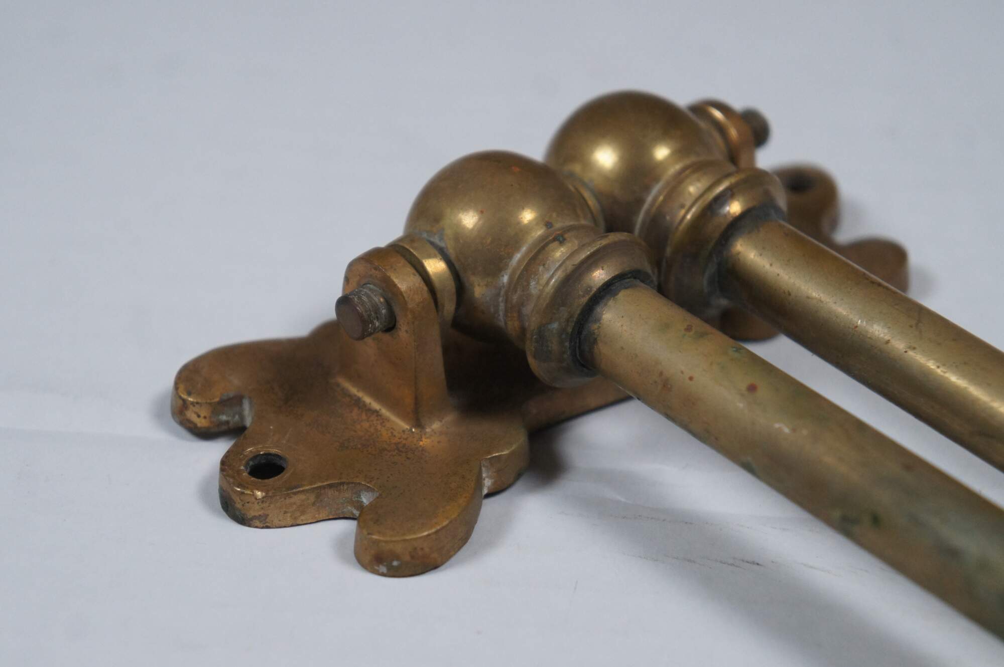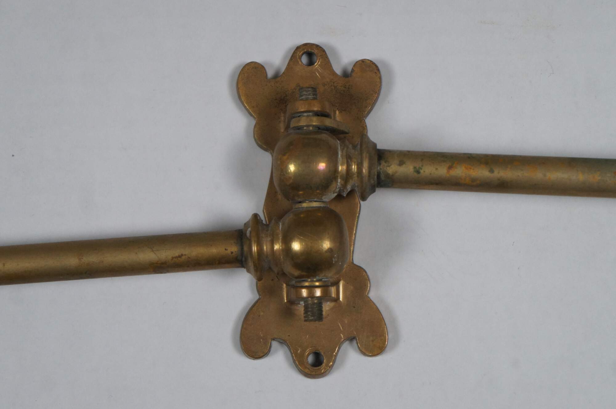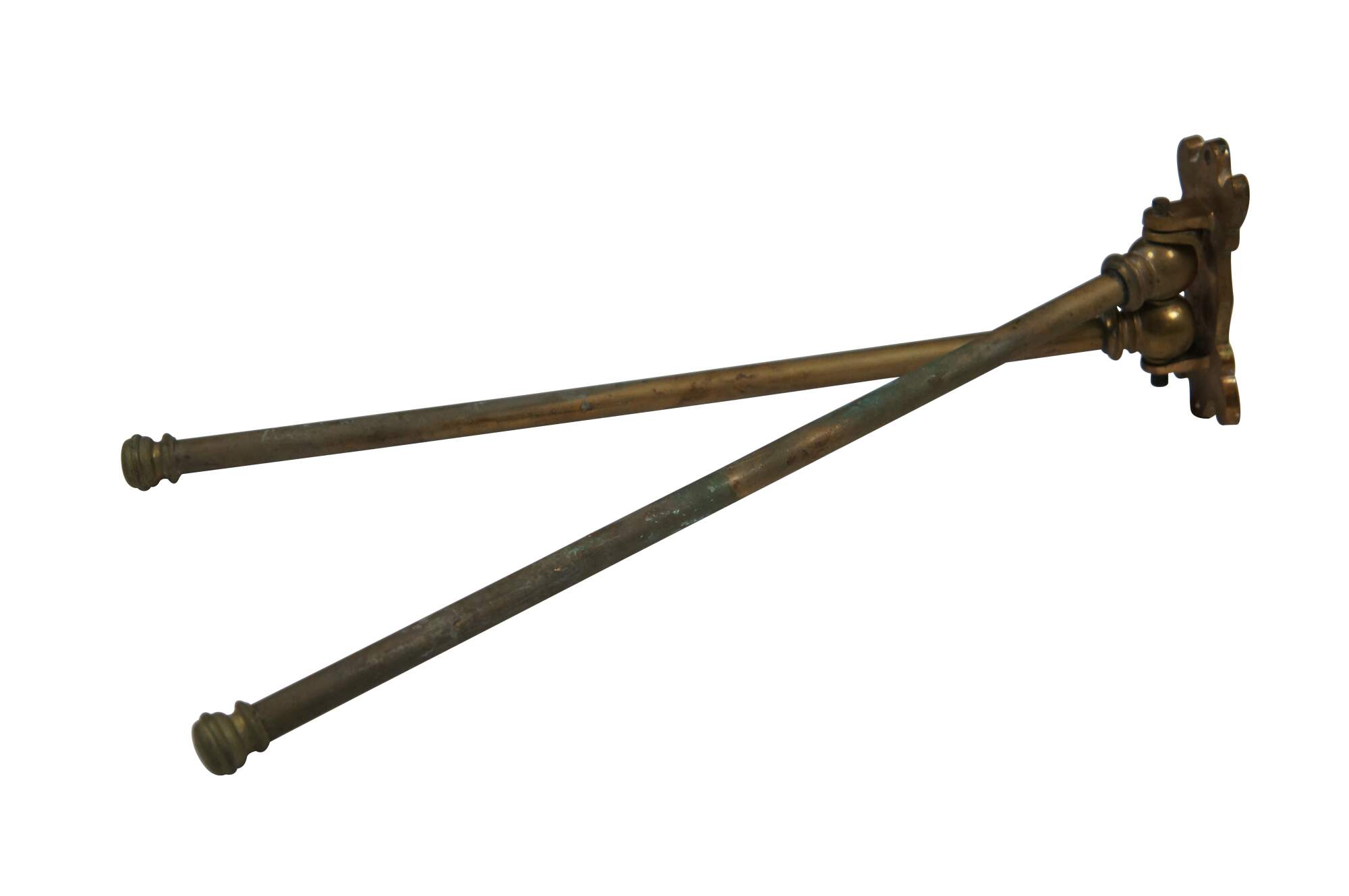 Antique drying rack / towel bar featuring a decorative scalloped edge wall mount and two swiveling arms with simply decorated caps.