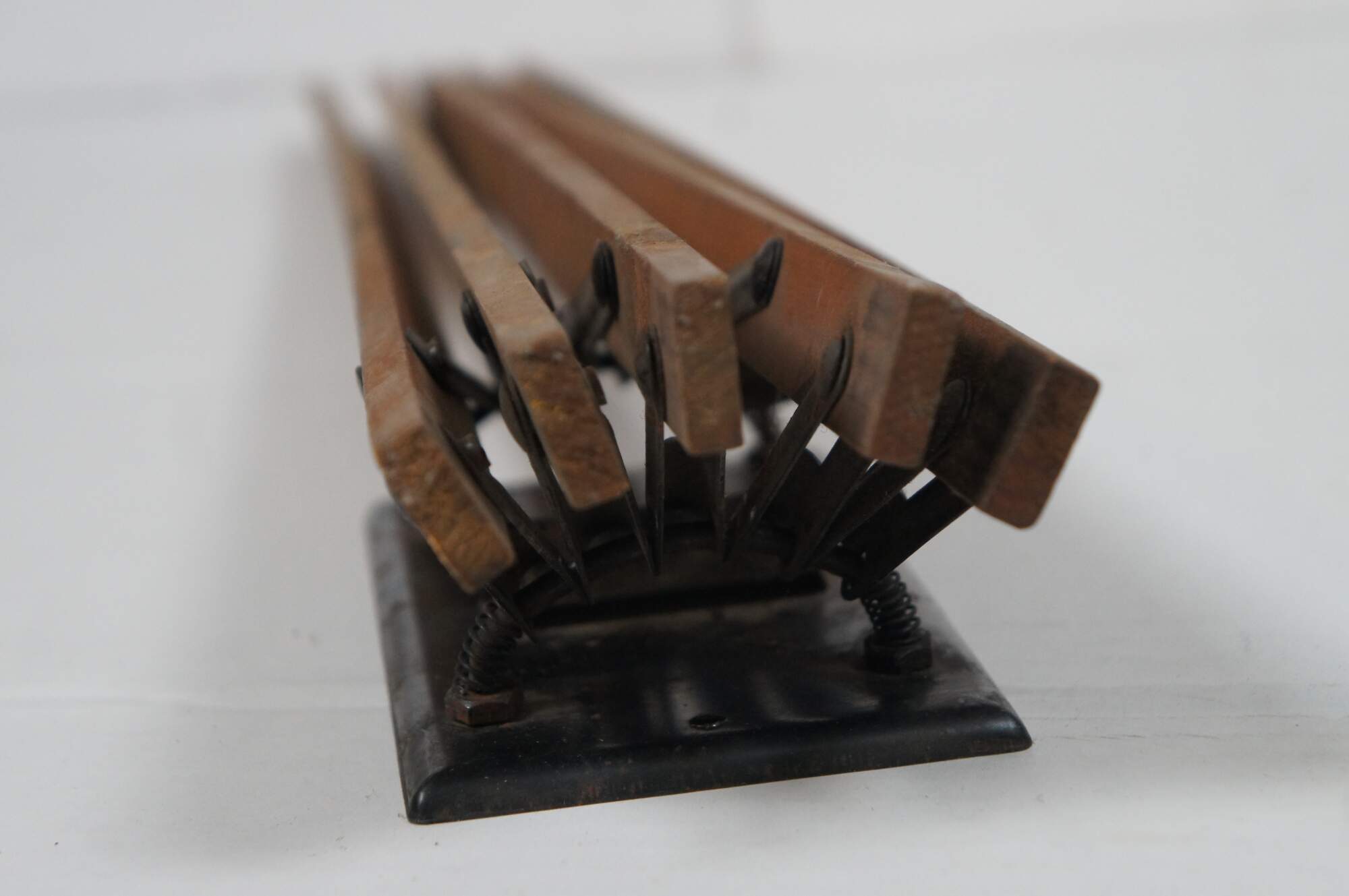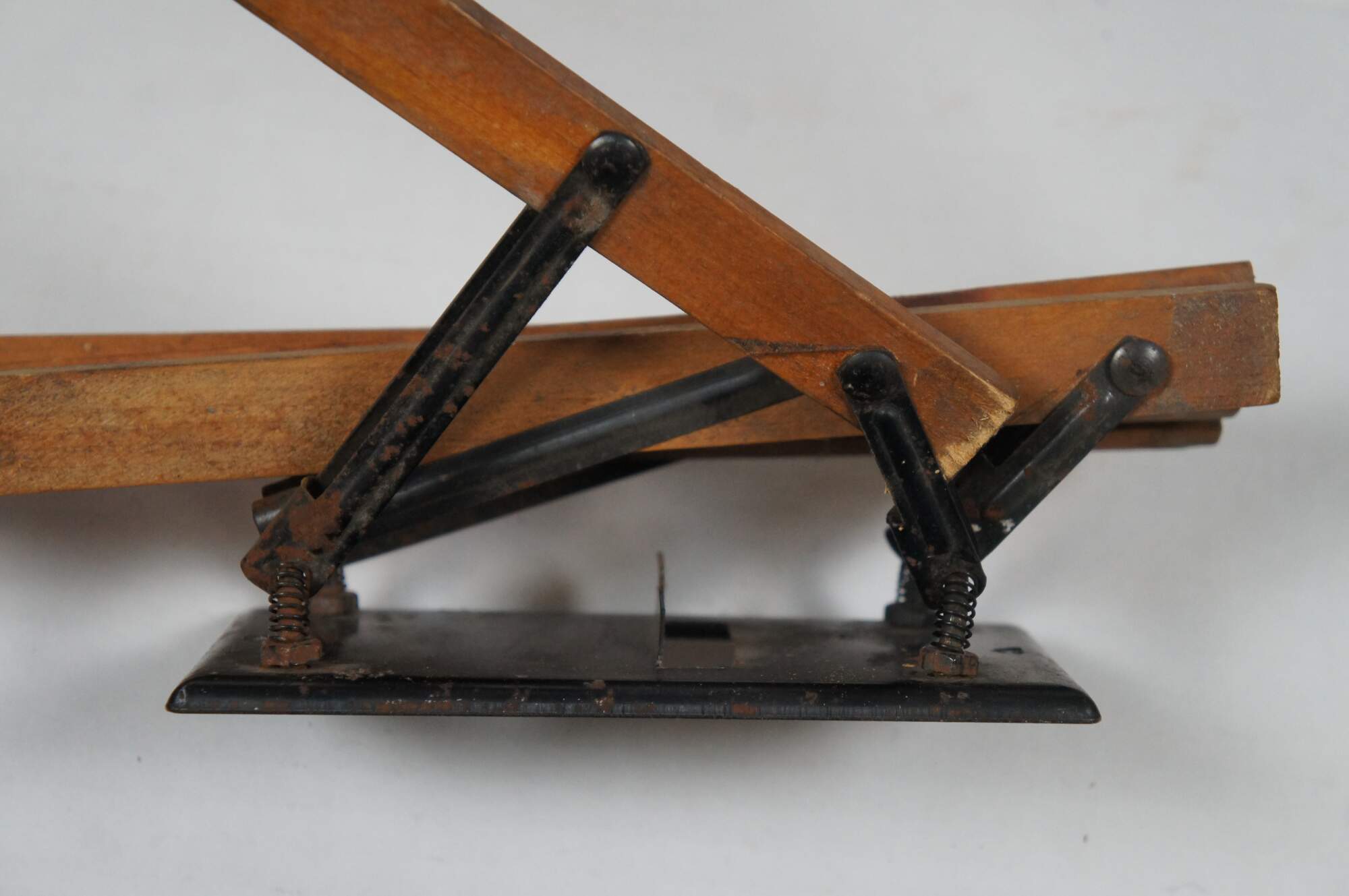Antique wall mounted drying rack featuring black metal hardware and five wooden arms that extend out in a fan shape or can be folded neatly against the wall via spring action mechanism.