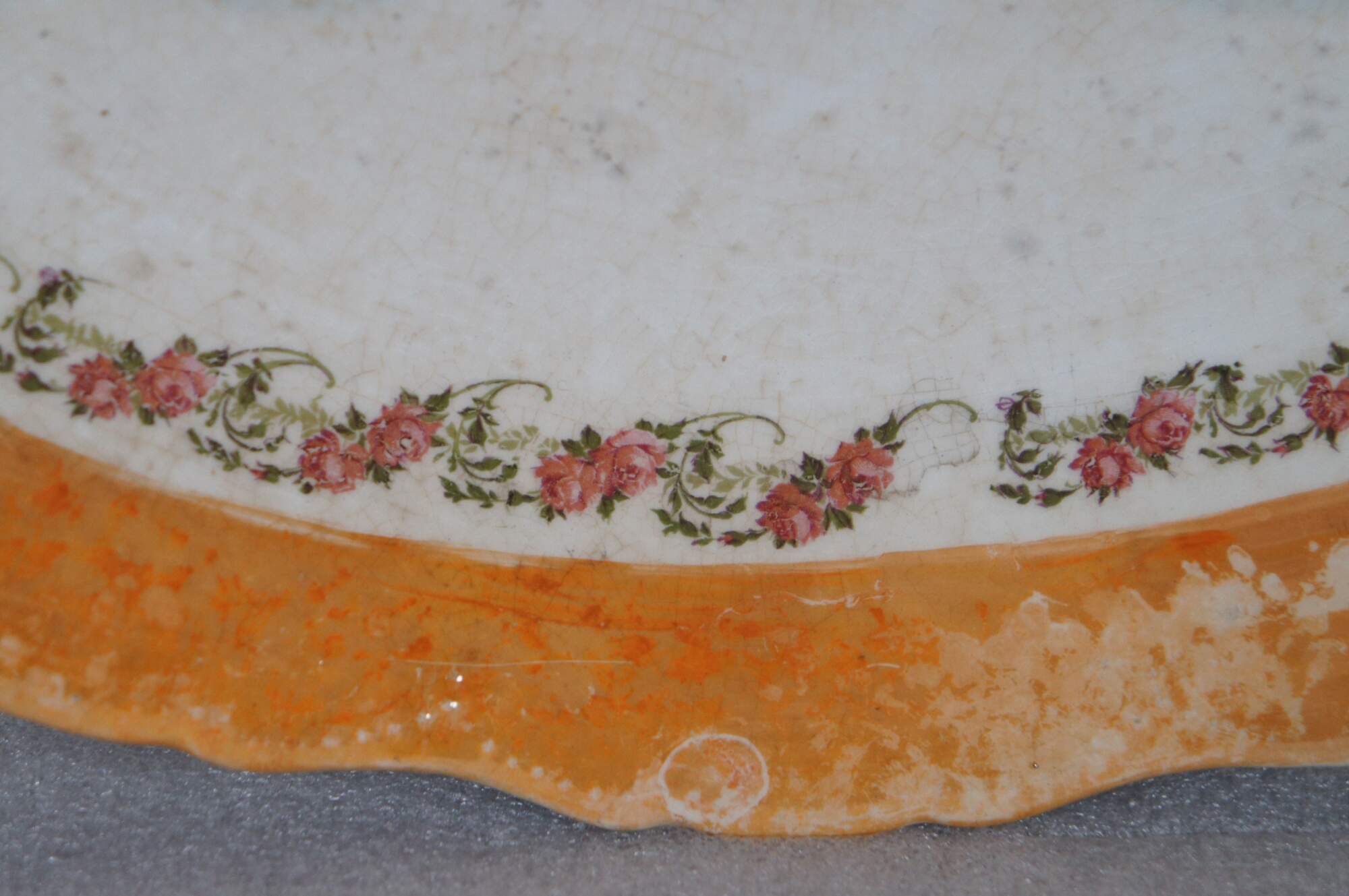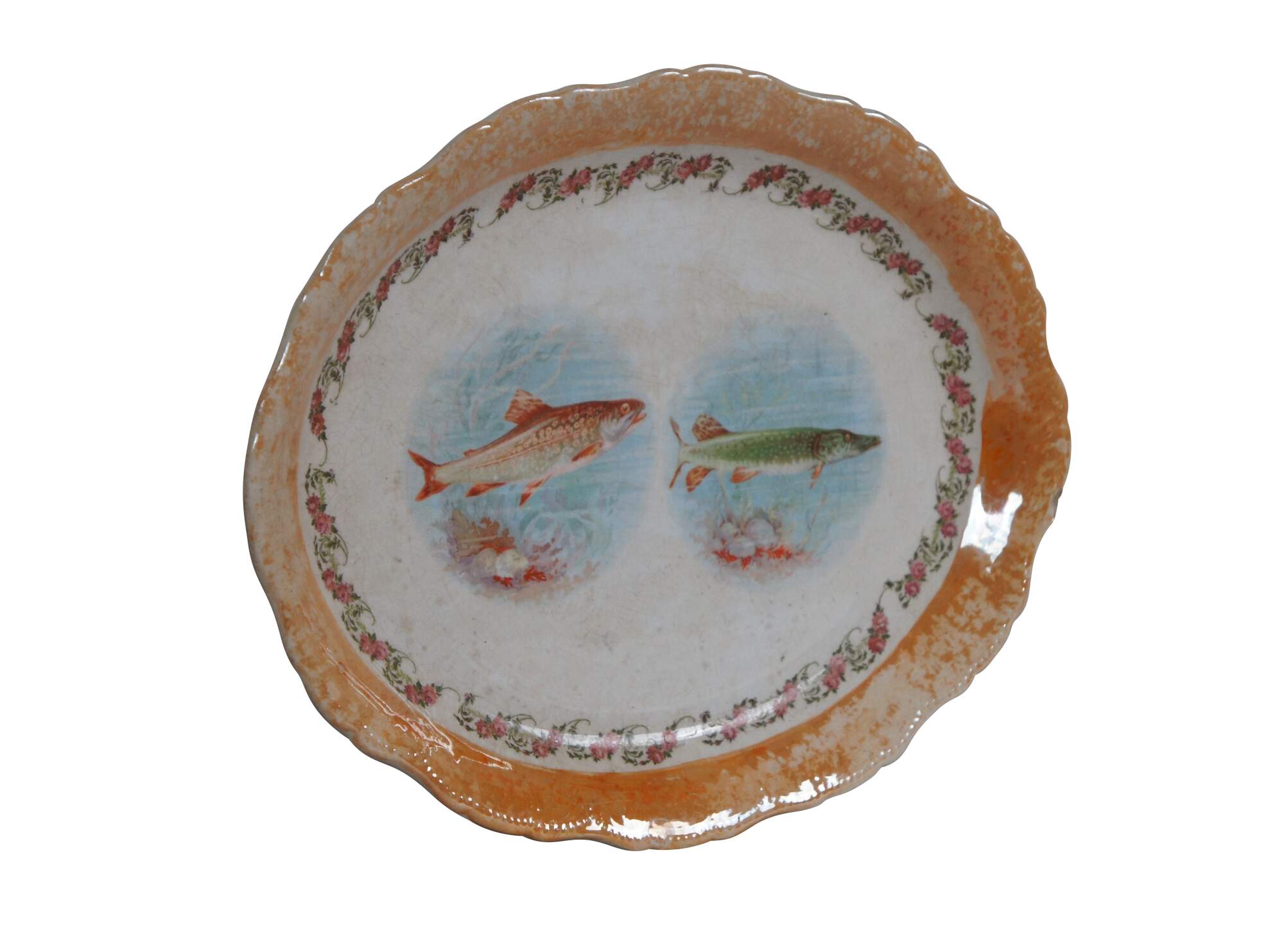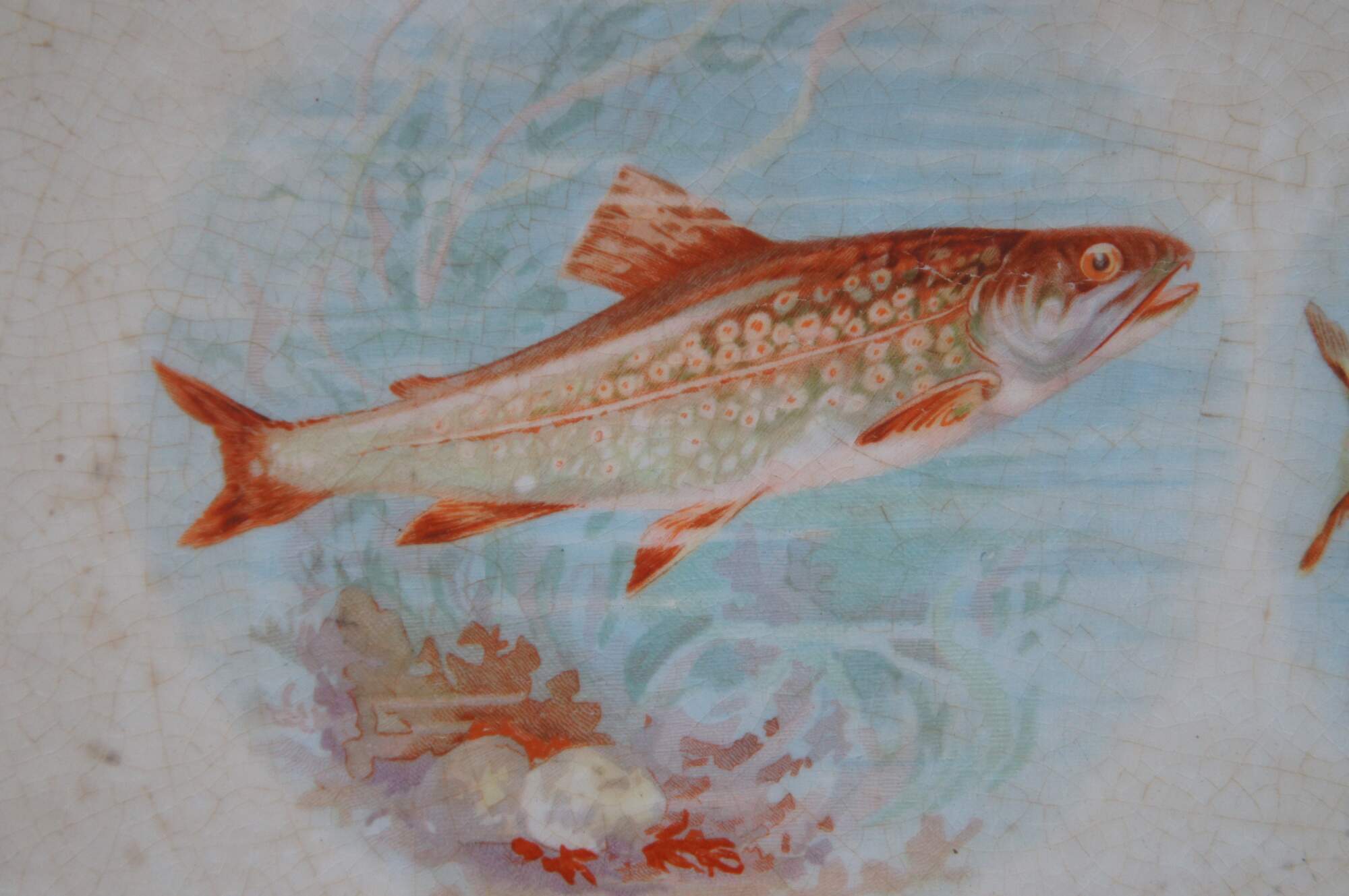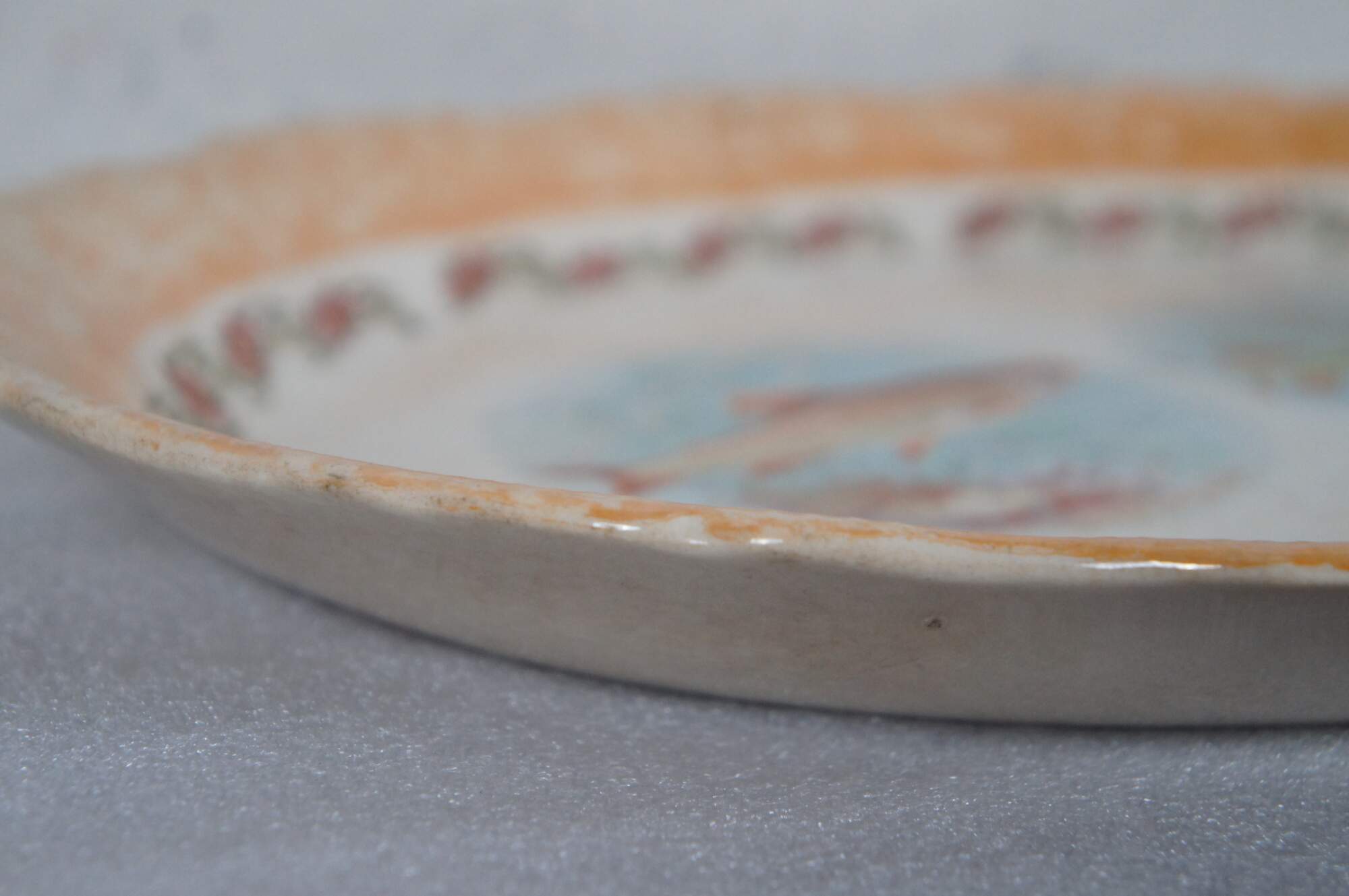 Late 19th - early 20th century semi-vitreous porcelain oval serving platter by Knowles, Taylor and Knowles. Features an iridescent orange border and transferware garland of roses around the images of a trout and a pike.