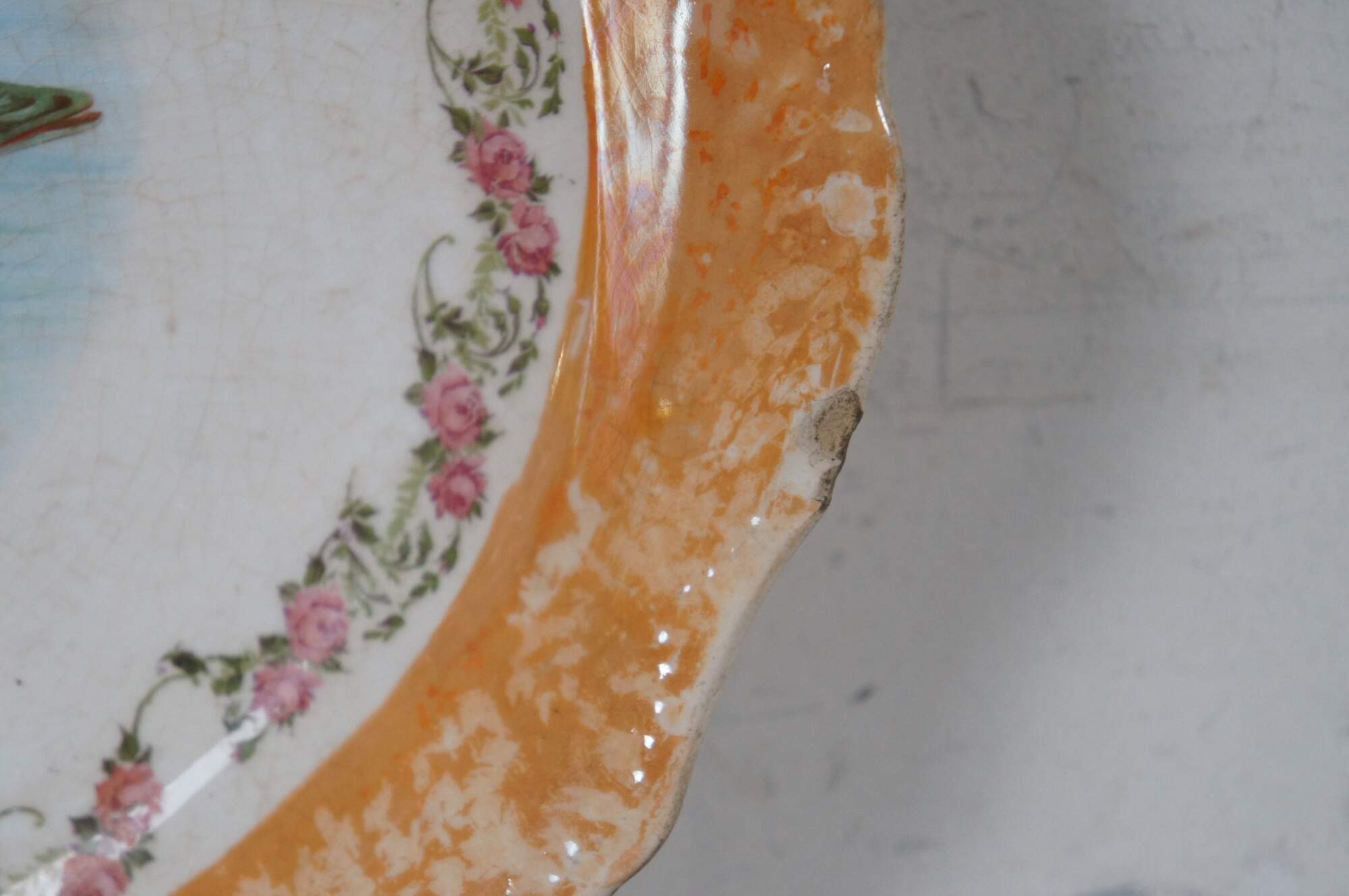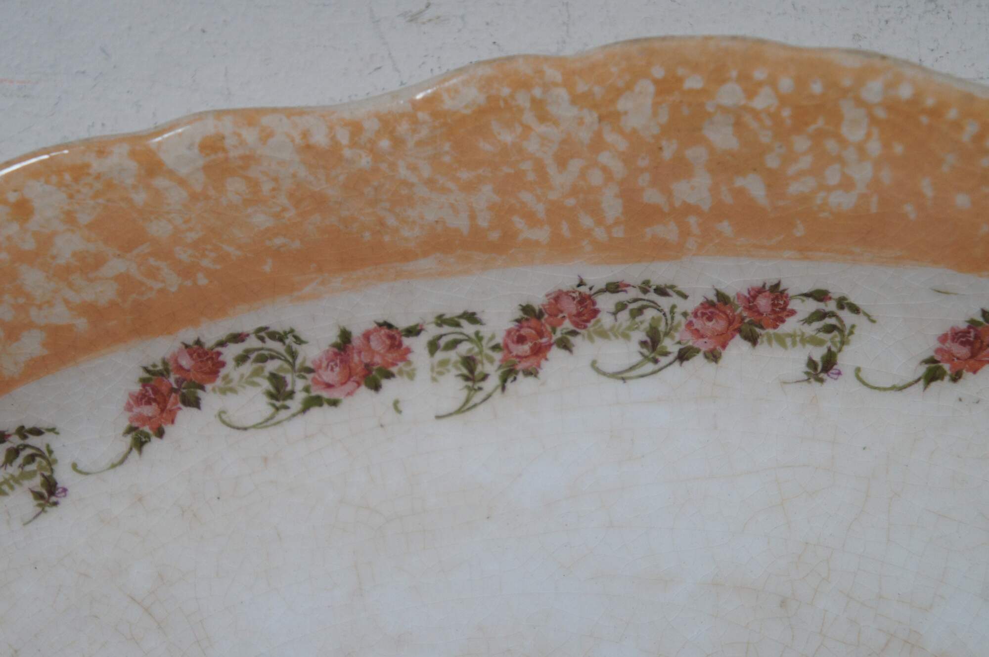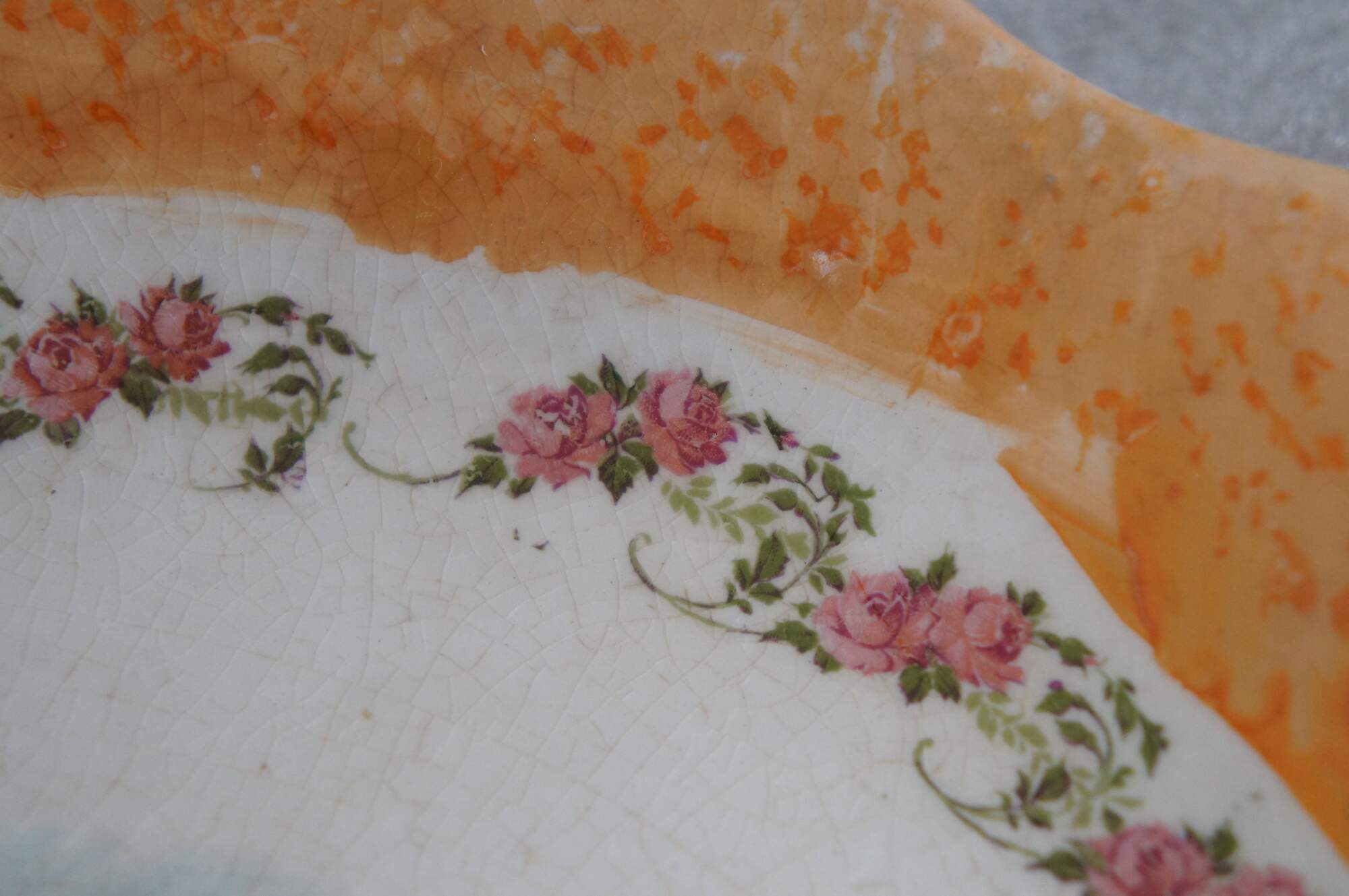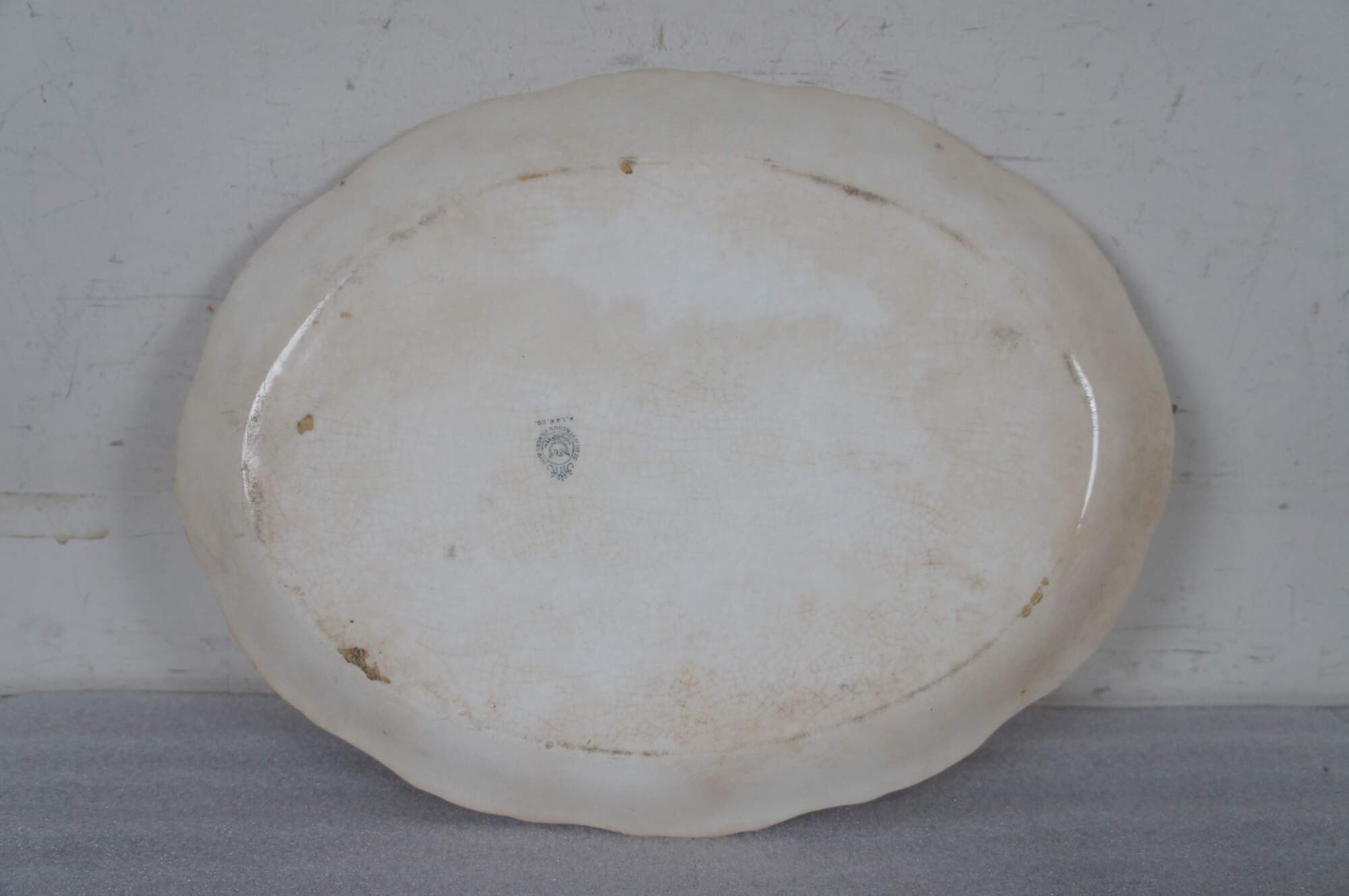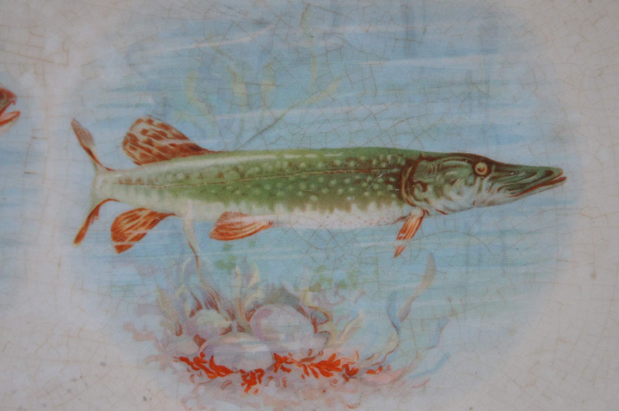 Late 19th - early 20th century semi-vitreous porcelain oval serving platter by Knowles, Taylor and Knowles. Features an iridescent orange border and transferware garland of roses around the images of a trout and a pike.