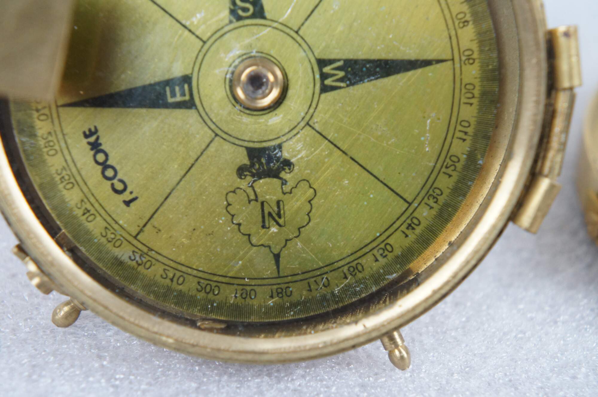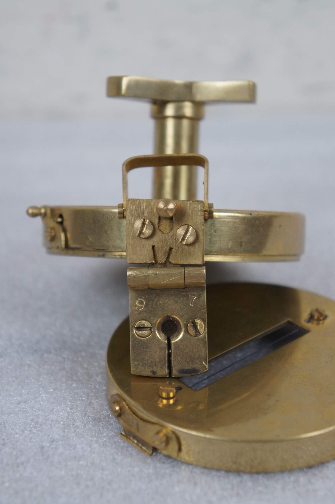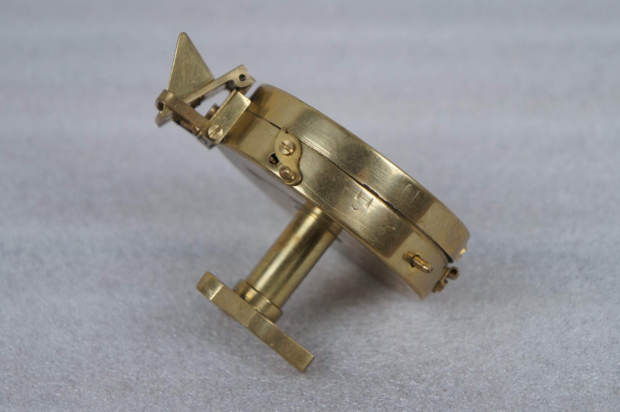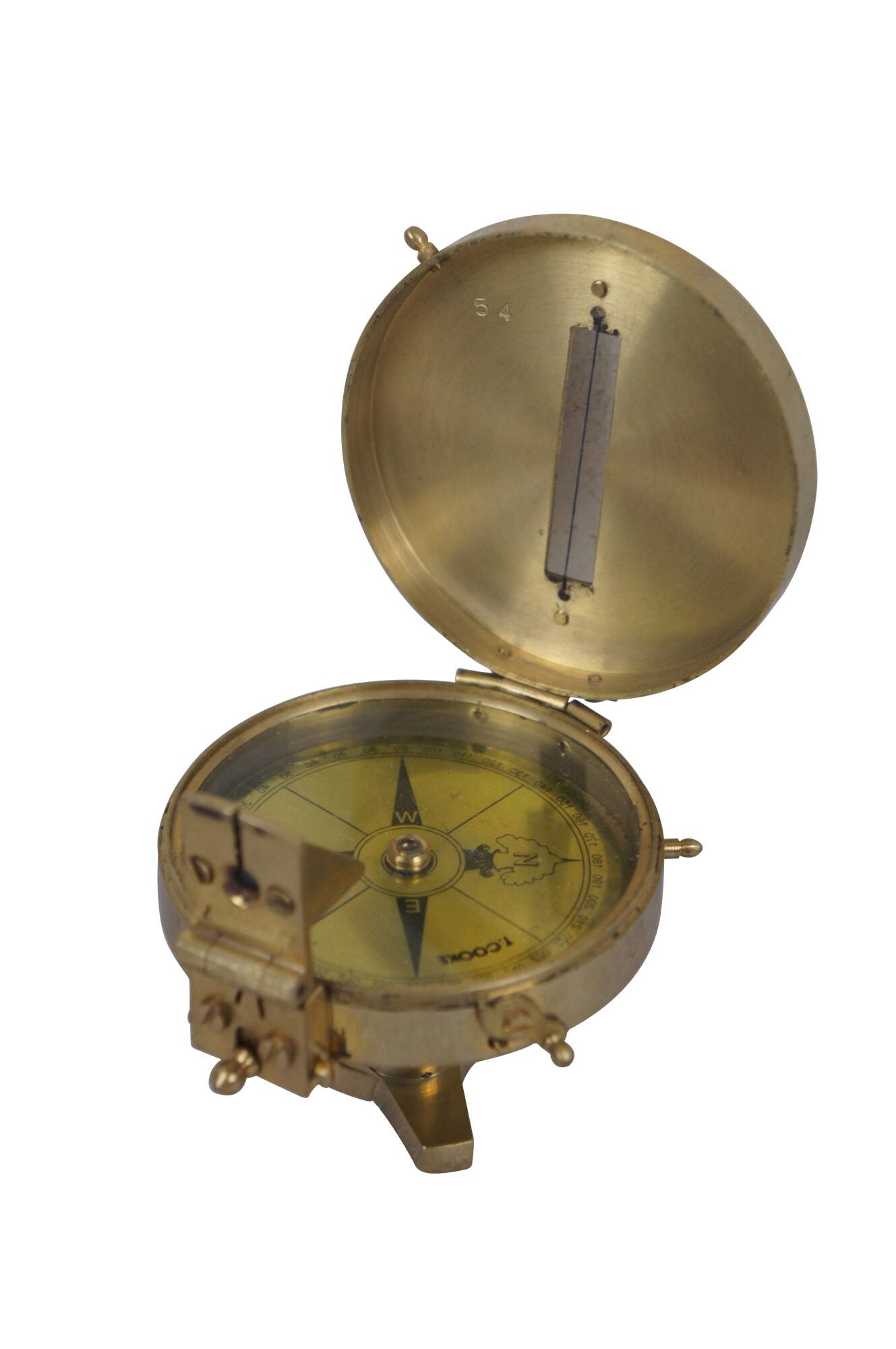 Vintage T. Cooke of London prismatic compass. Brass case with pierced sight line in the lid, folding prism, metallic gold tone face, and short stand able to be screwed onto a tripod for stabilization.