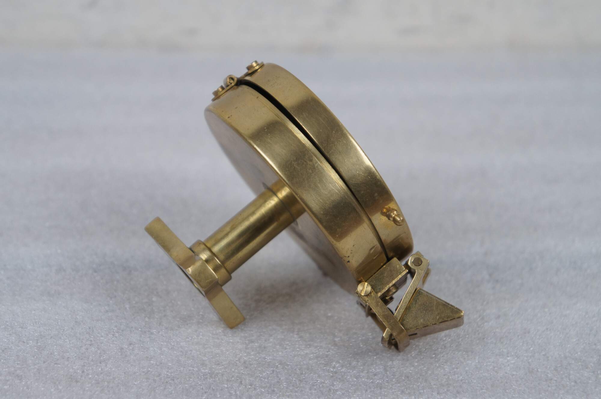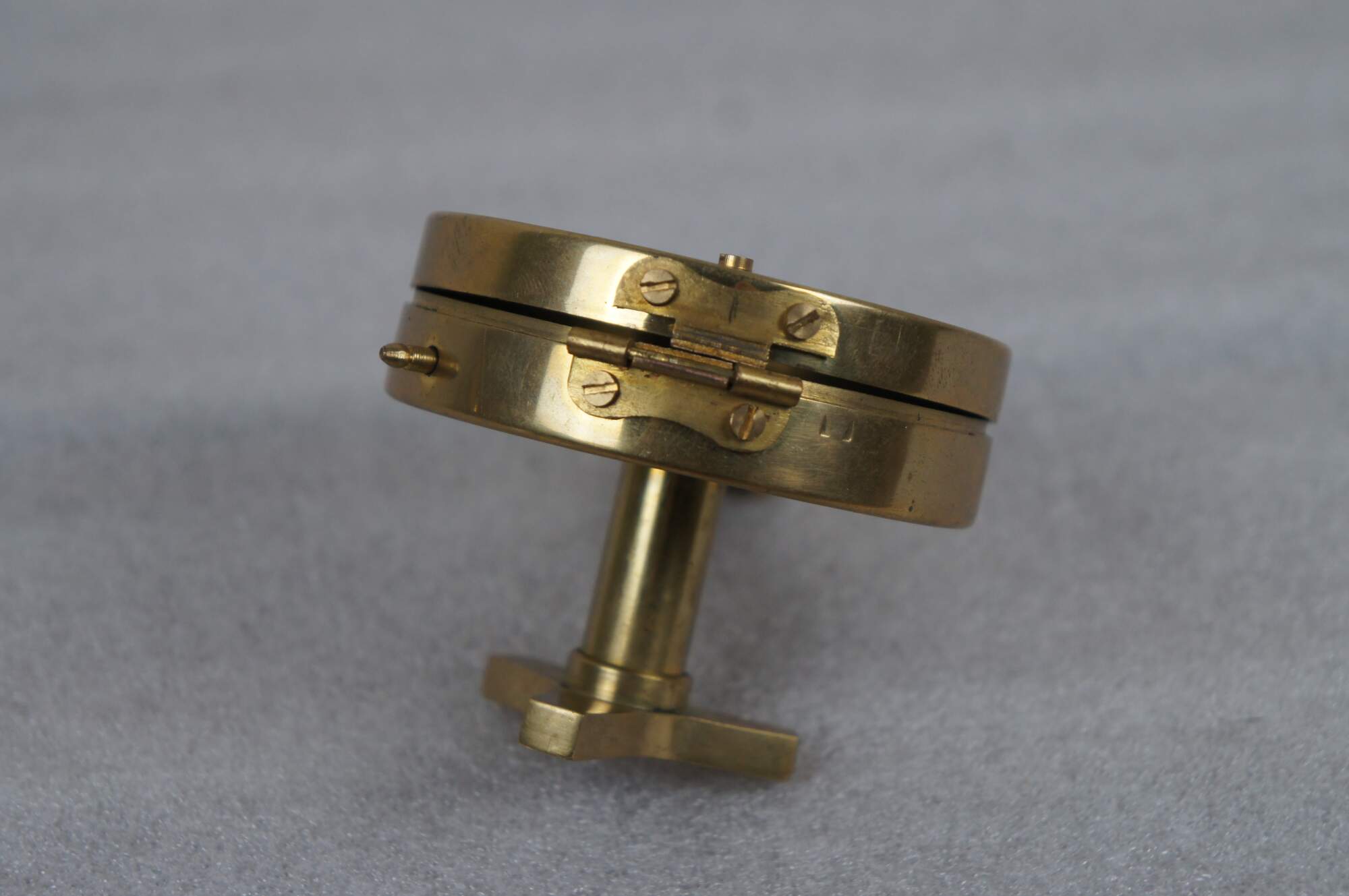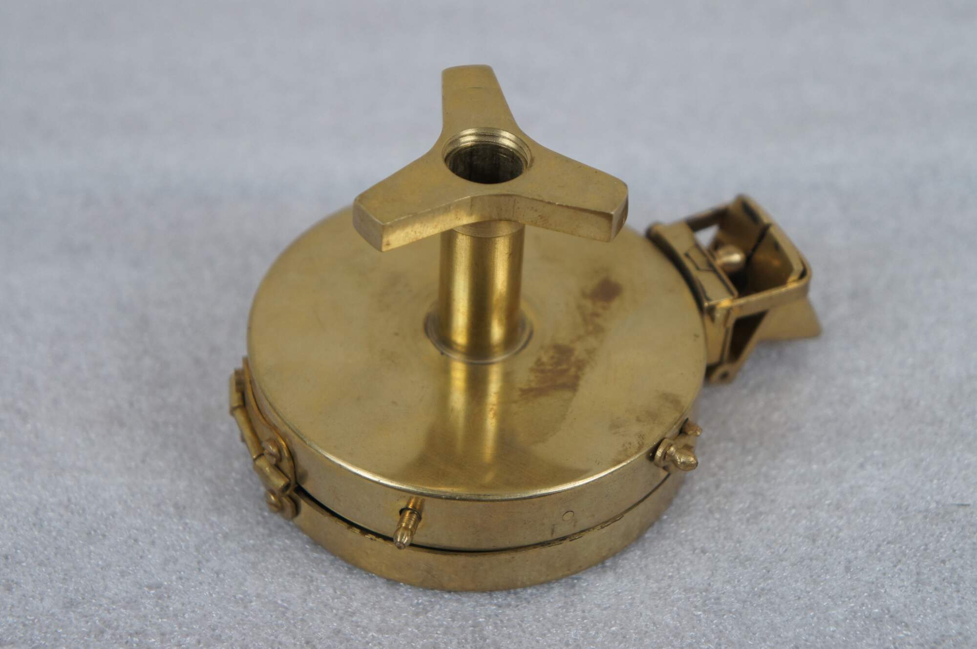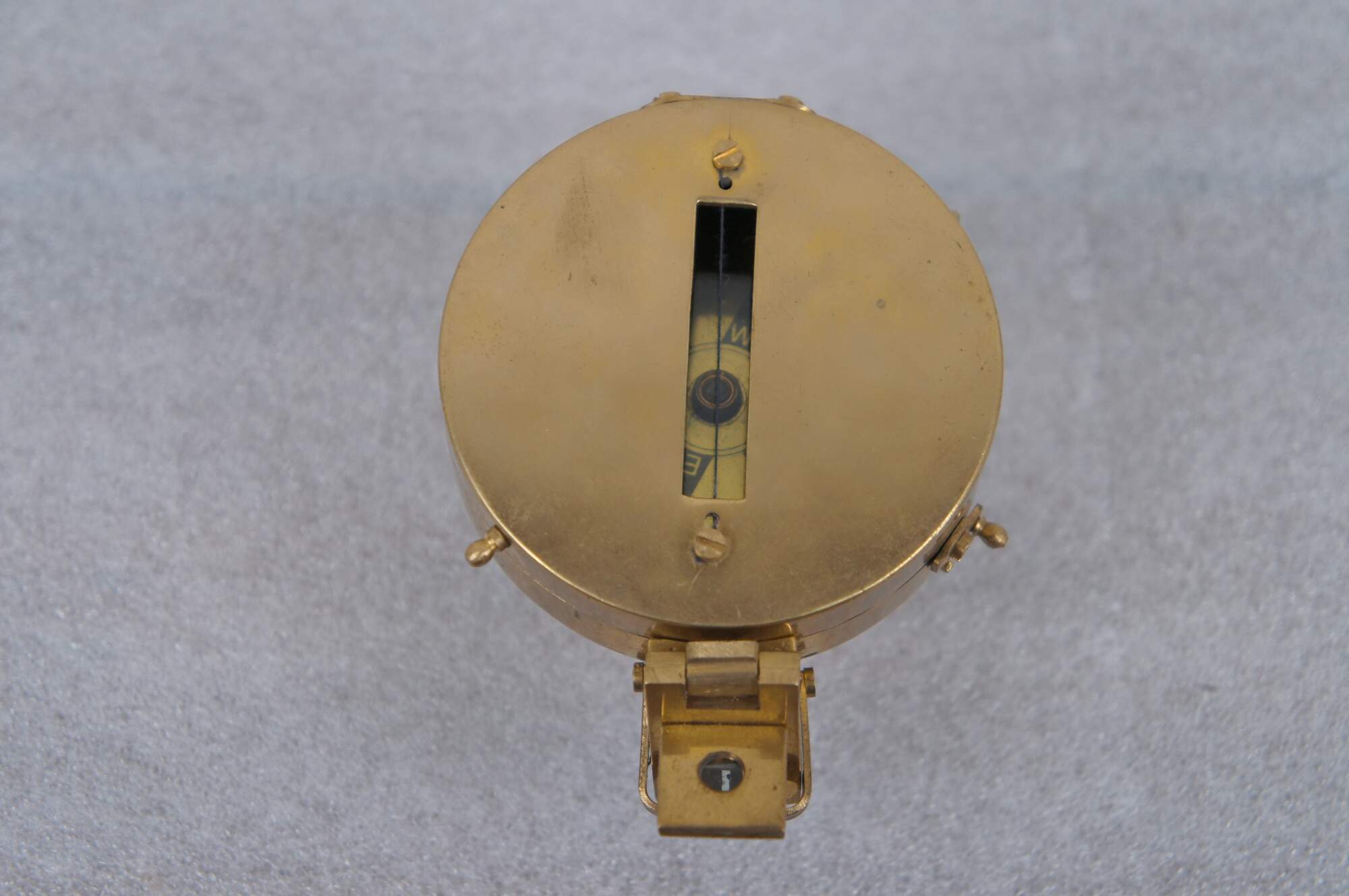 Vintage T. Cooke of London prismatic compass. Brass case with pierced sight line in the lid, folding prism, metallic gold tone face, and short stand able to be screwed onto a tripod for stabilization.