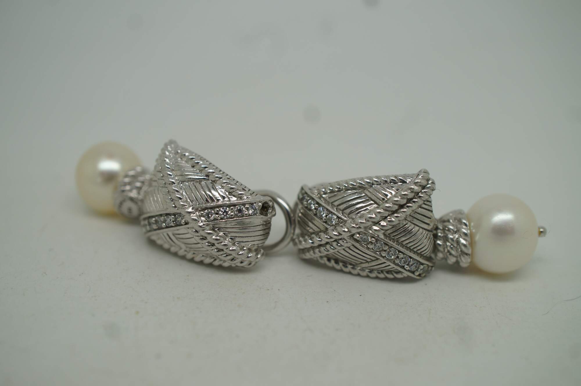 Set of four vintage pieces of jewelry by designer Judith Ripka. Set includes one sterling silver toggle clasp, chain linked bracelet featuring rope twisted accents and alternating white cubic zirconia and pale green, almond shaped, swirl carved gems; pair of clip on sterling silver earrings with crossed rope twist pattern accented with white cubic zirconia and cultured pearl dangles; and a sterling silver and 18K gold cocktail ring featuring a beaded band set with a large pink gem flanked by pale yellow gems, accented at the corners with golden hearts with white cubic zirconia.