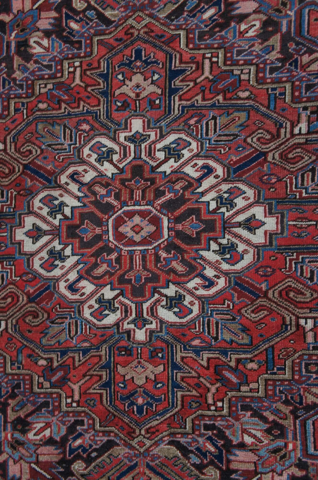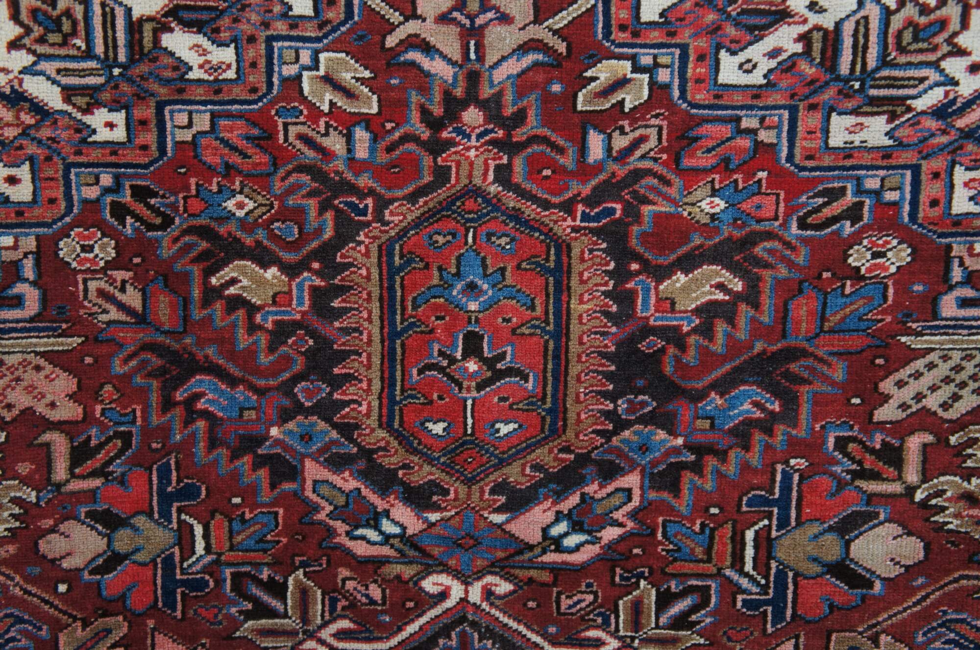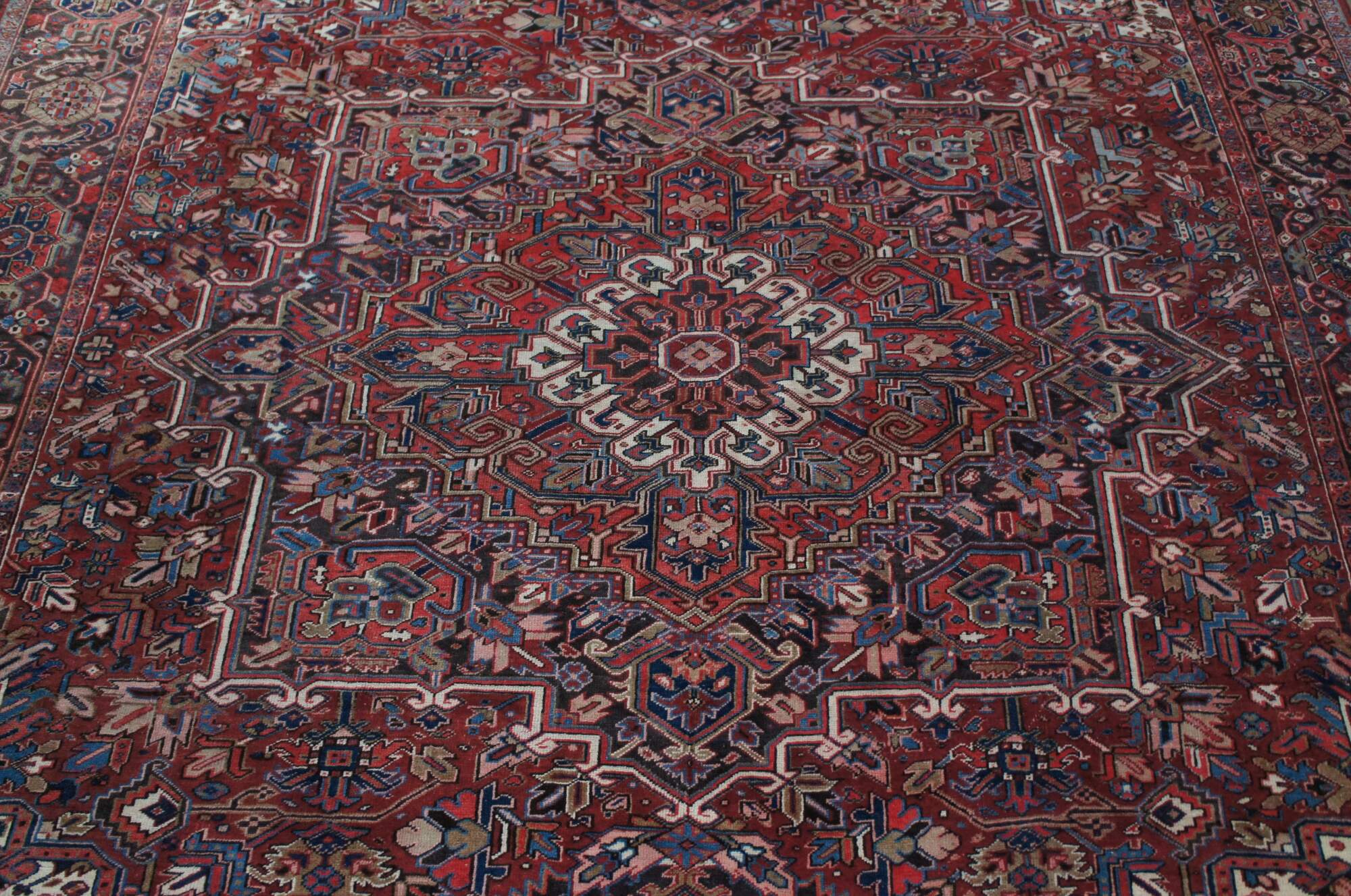 Heriz rug weavers often make them in geometric, bold patterns with a large medallion dominating the field. Such designs are traditional and often woven from memory.