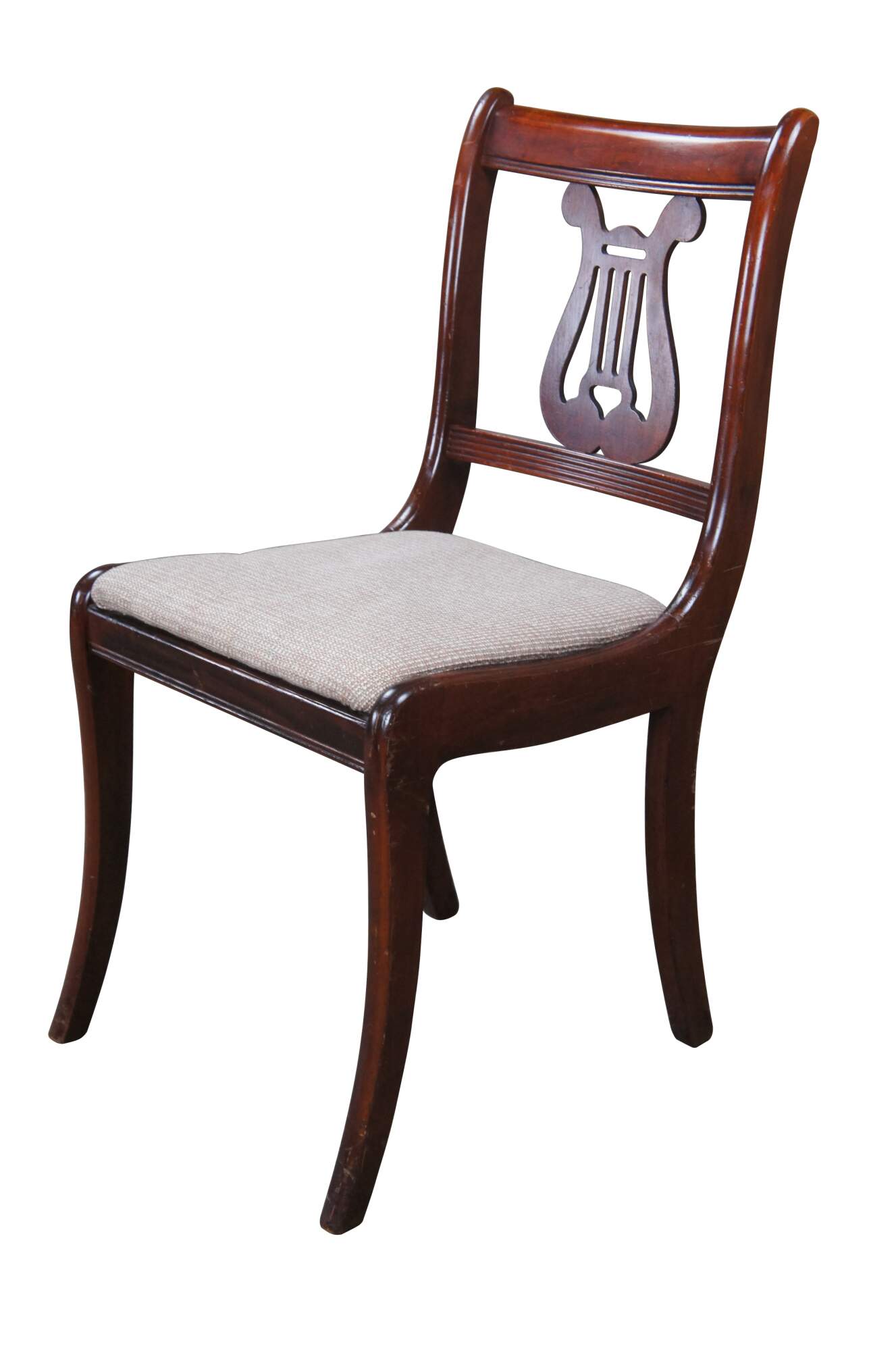 1940s Duncan Phyfe / Regency Style dining side chair. Made from mahogany with a harp / lyre back. Features an upholstered seat and saber legs.