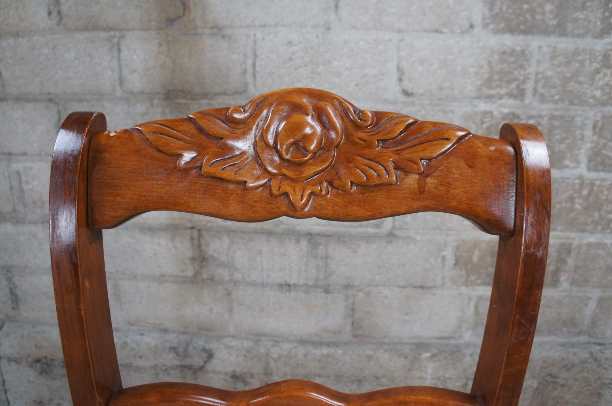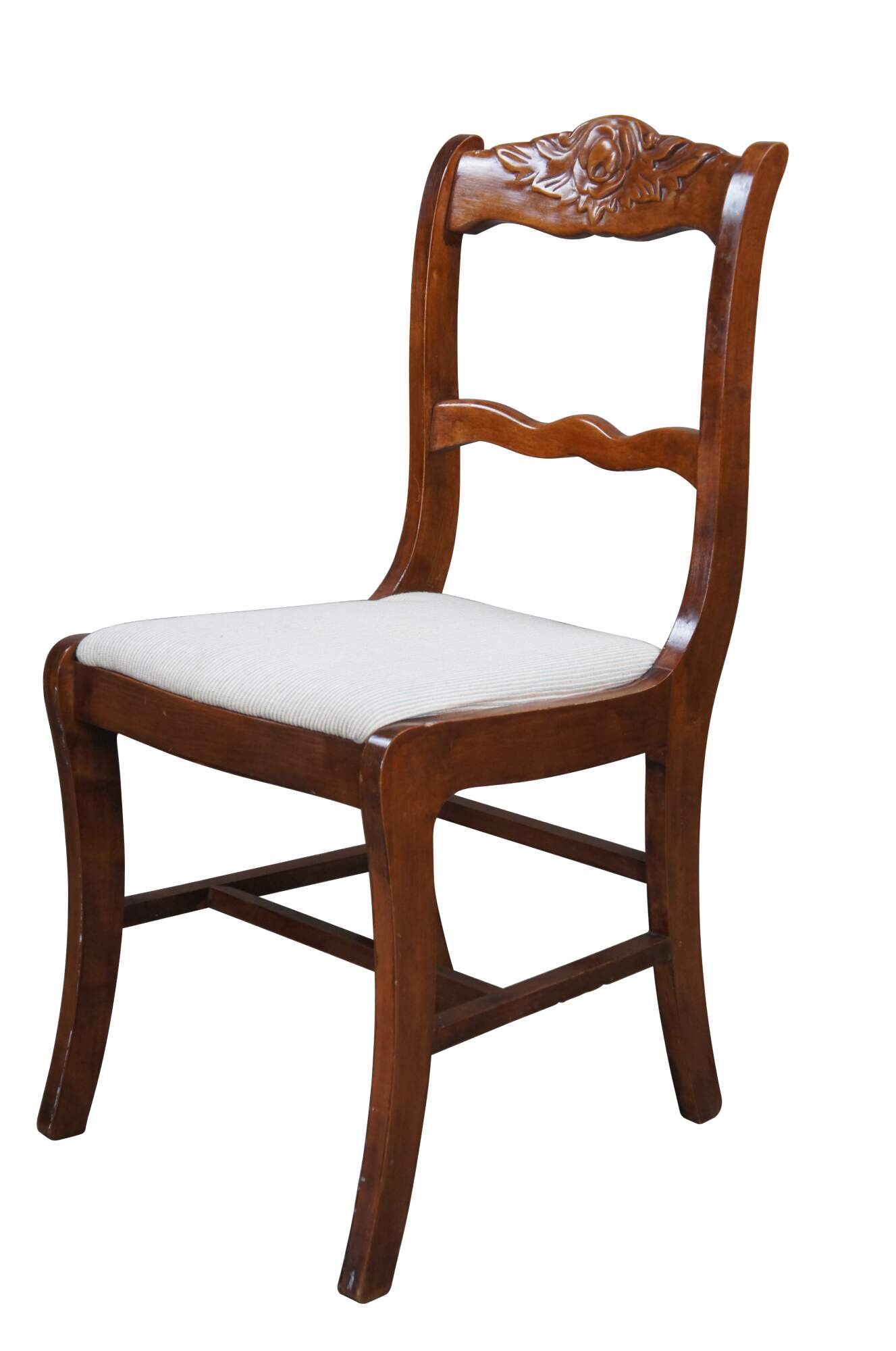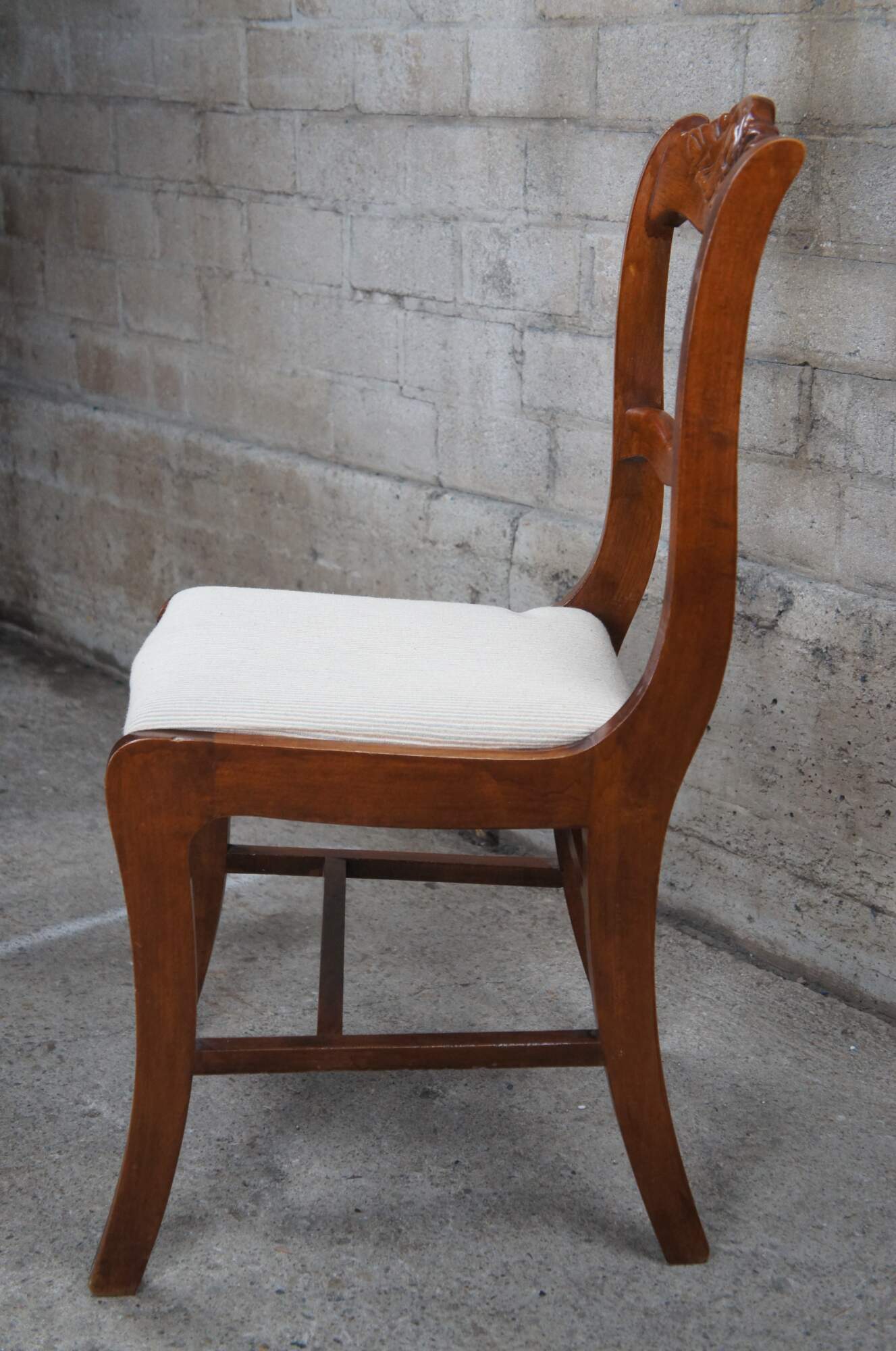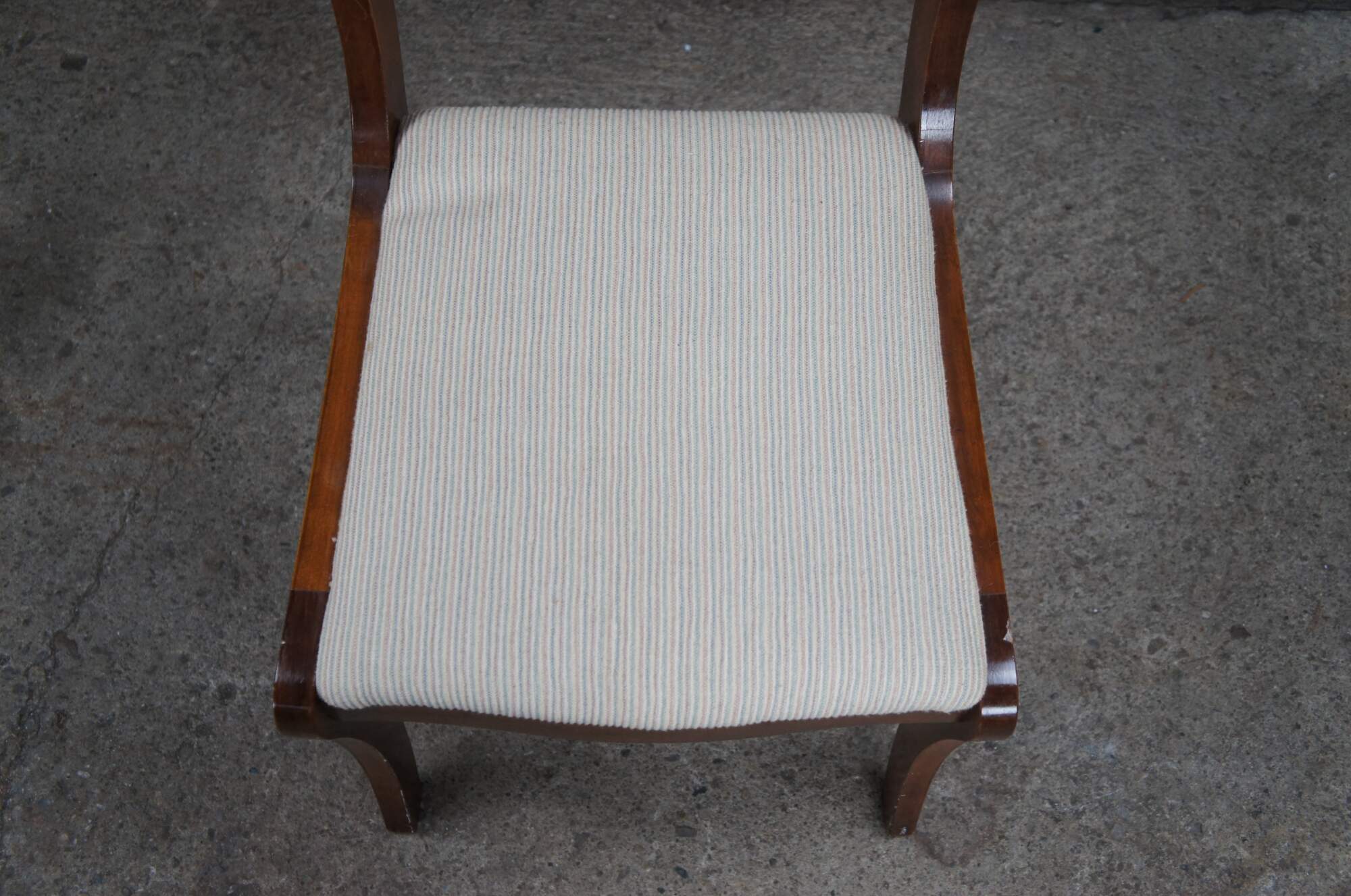 1940s Duncan Phyfe / Regency Style dining side chair. Made from mahogany with a rose carved crest rail. Features an upholstered seat with striped pattern. Front and rear legs are saber shaped and connected by an H stretcher.