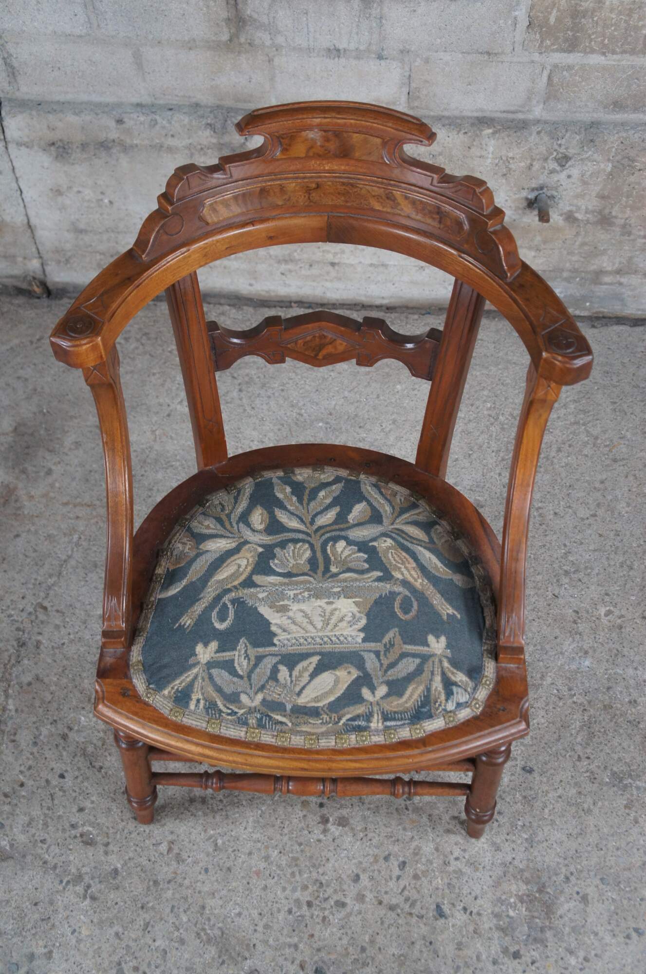 A quaint late 19th century Renaissance Revival side chair. Made from walnut with burled panels. Features a curved back with downswept arms and embroidered seat. Seat features a scene of birds and flowers with ornate metal fasteners on the cording. The chair is supported by turned legs along the front with turned stretchers.