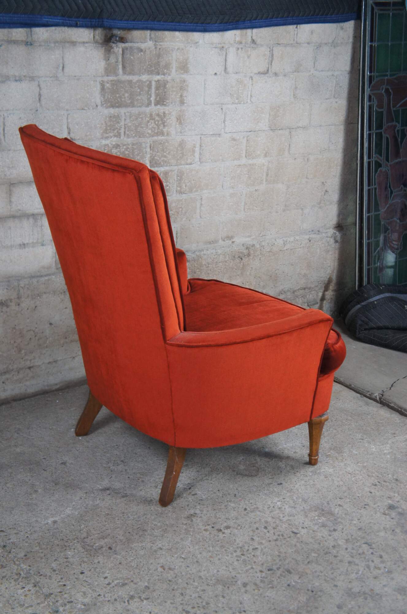 Red velvet highback lounge chair. Features a high padded back and low arms over distressed walnut turned feet.