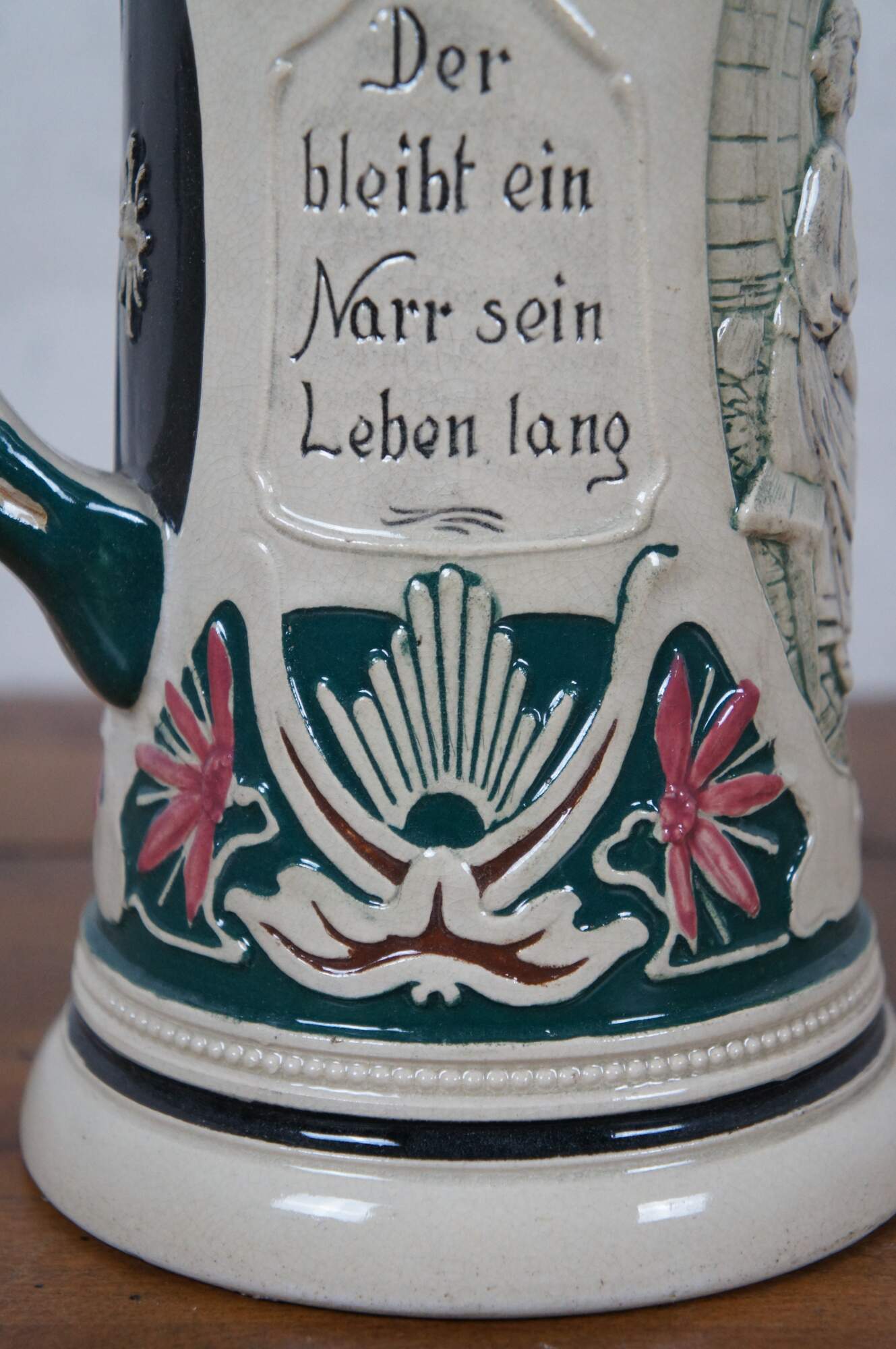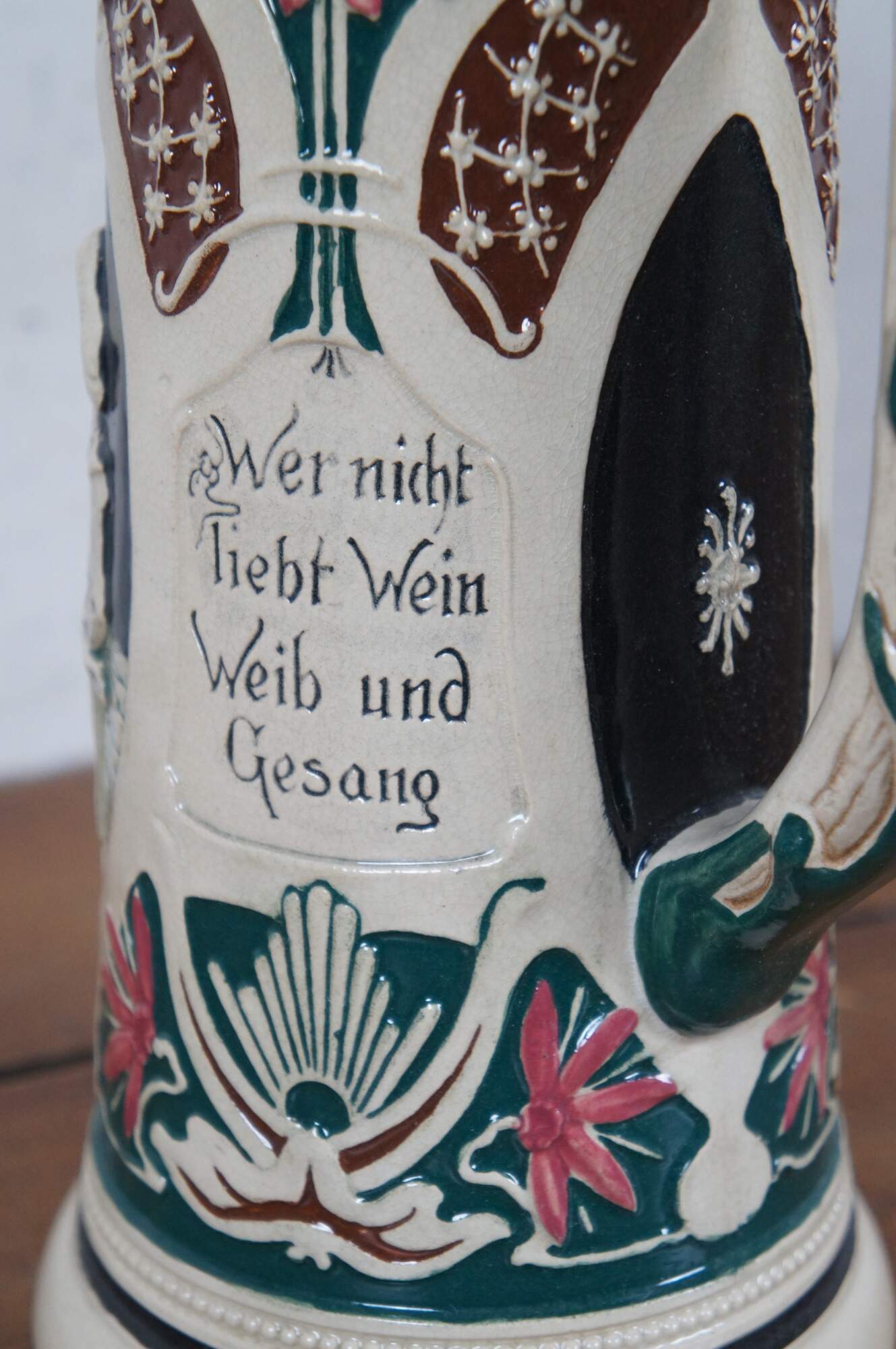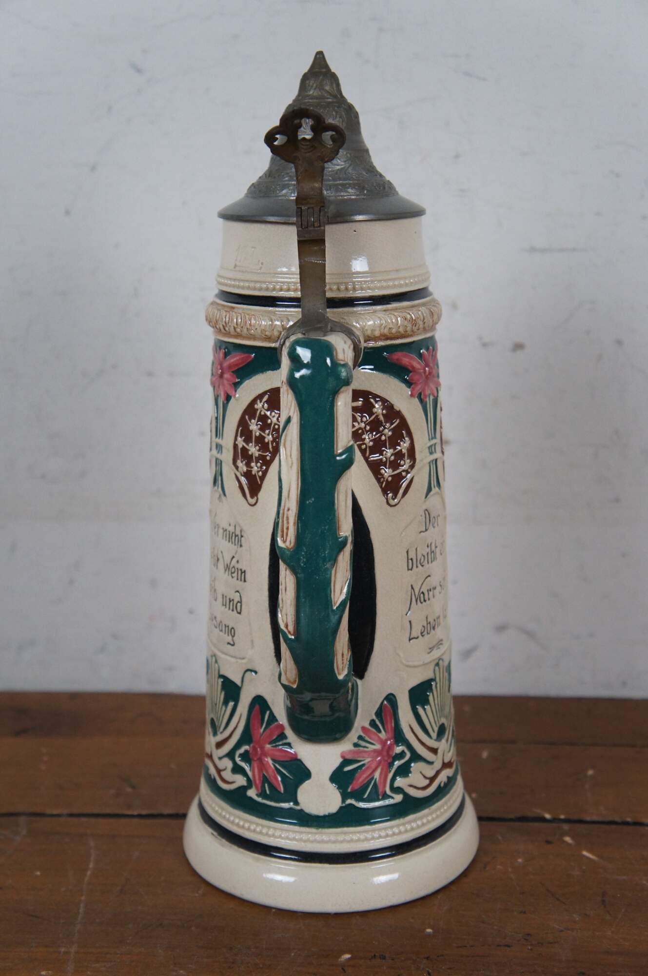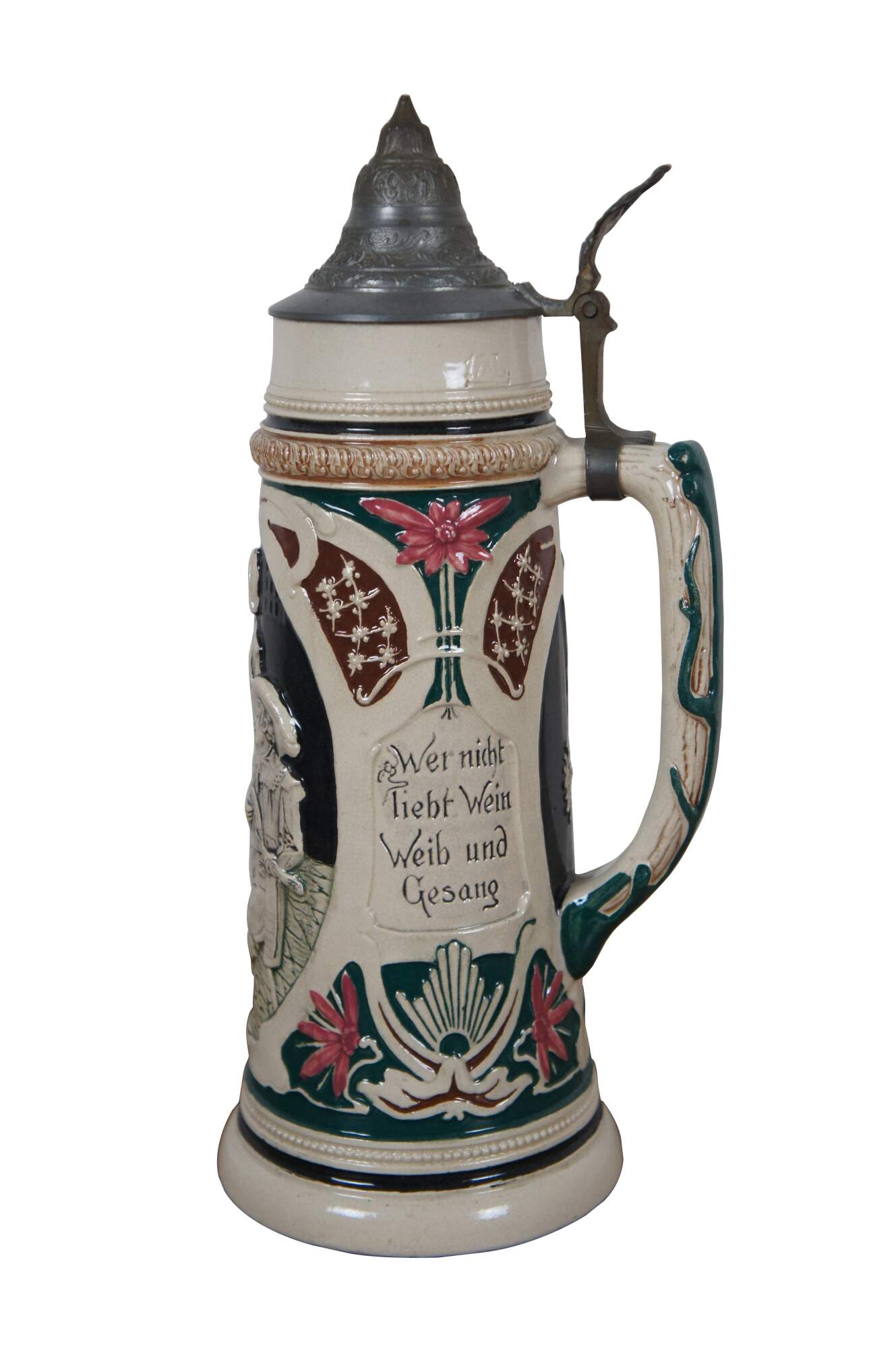 Circa mid 20th century 1 1/2 liter German stoneware stein decorated in green, brown, pink and black with flowers and figures seated at a tavern table, one playing a mandolin. Panels on either side read "Der bleiht ein Narr sein Leben lang" (He'll be a fool all his life) and "Wer nicht leibt Wein Weib un Gesang" (Who doesn't love wine, women and singing). Marked "Germany" on base. Patterned tin lid. Marked Germany on base.