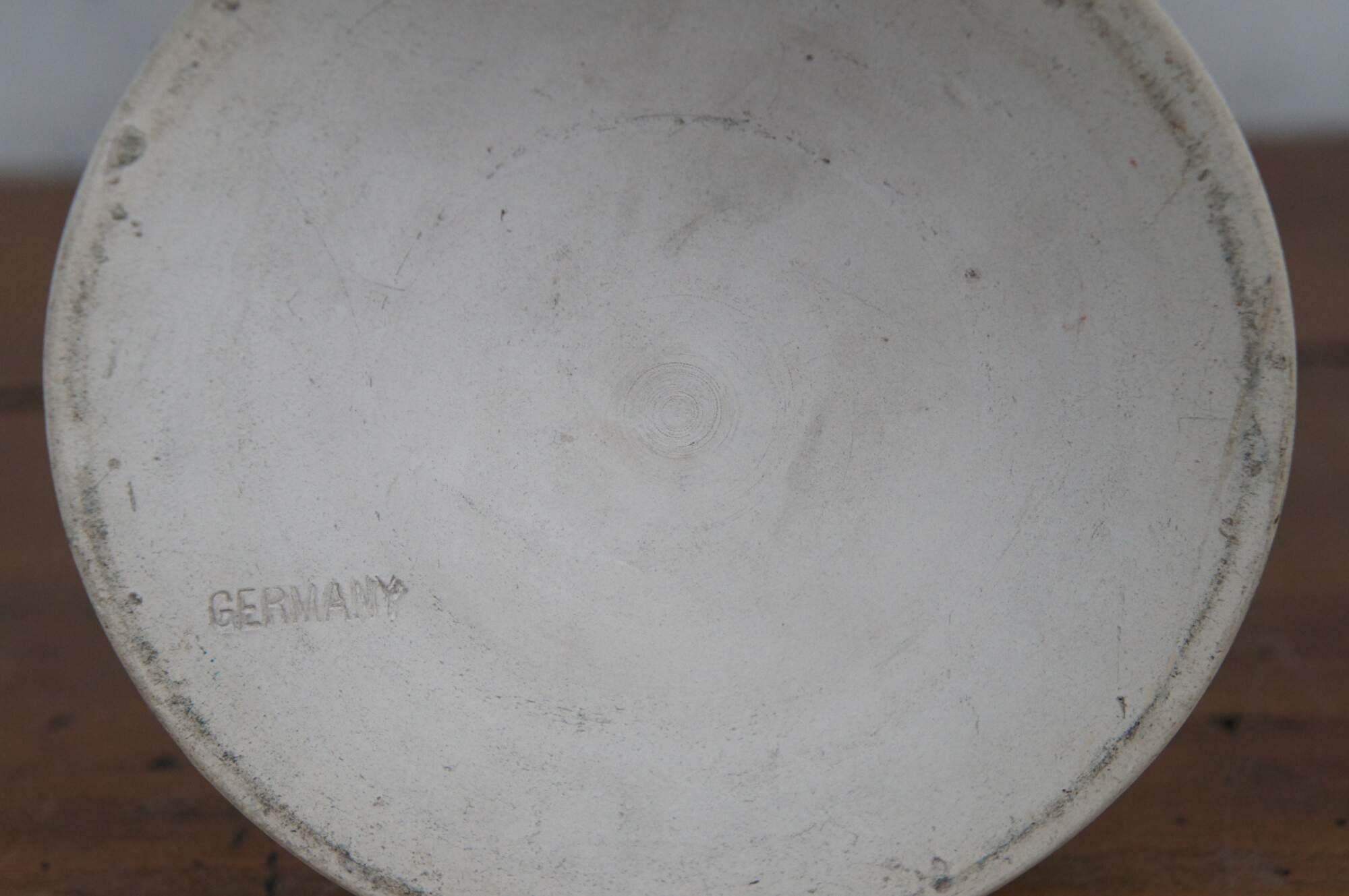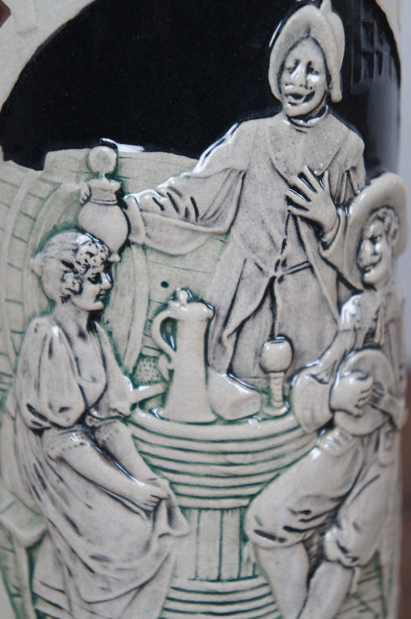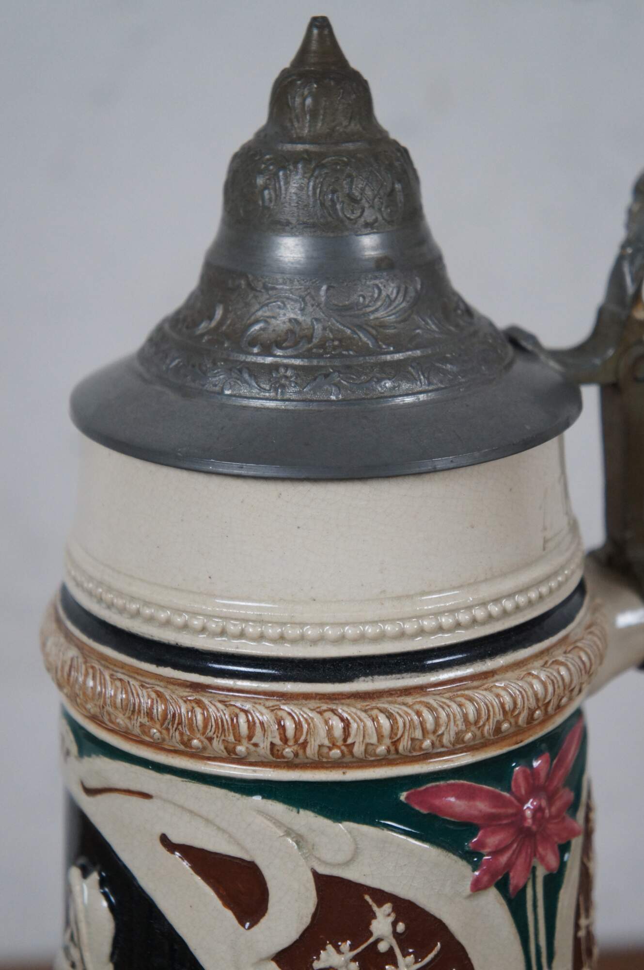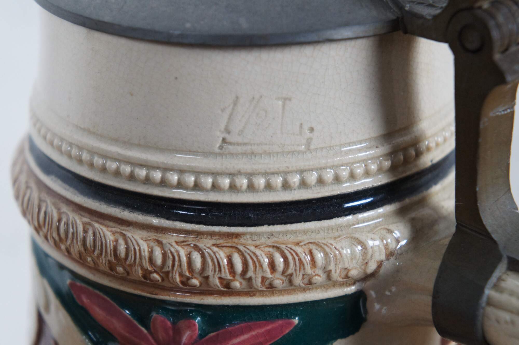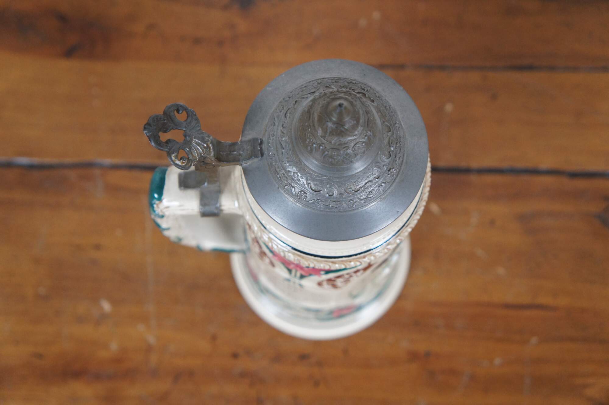Circa mid 20th century 1 1/2 liter German stoneware stein decorated in green, brown, pink and black with flowers and figures seated at a tavern table, one playing a mandolin. Panels on either side read "Der bleiht ein Narr sein Leben lang" (He'll be a fool all his life) and "Wer nicht leibt Wein Weib un Gesang" (Who doesn't love wine, women and singing). Marked "Germany" on base. Patterned tin lid. Marked Germany on base.