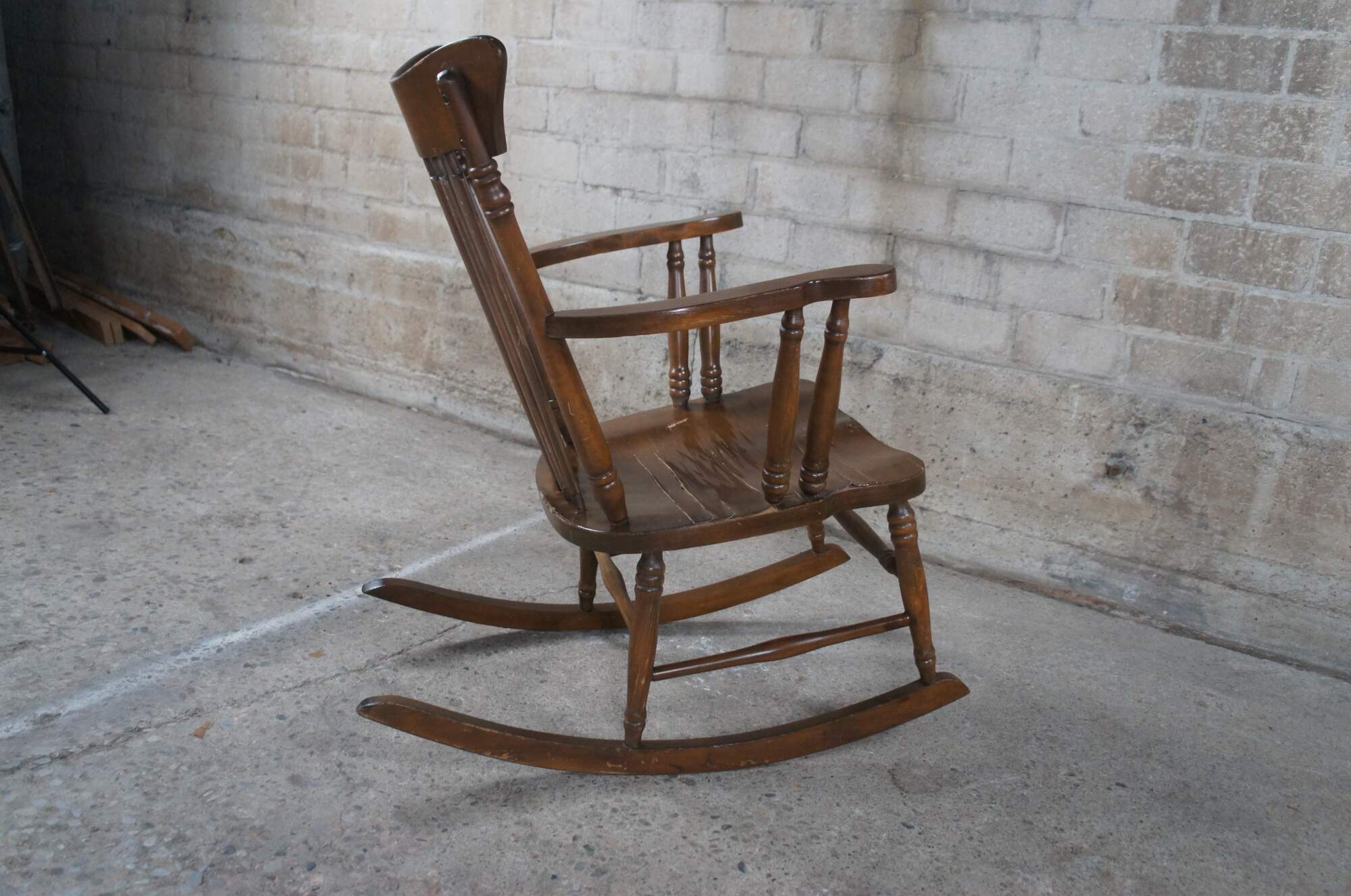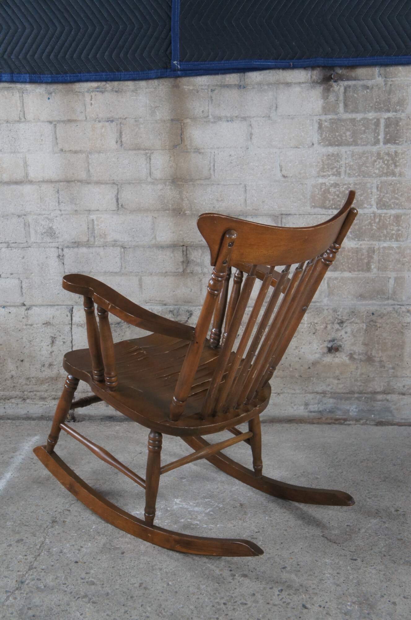A lovely rocking chair from the first half of the 20th century. Made from maple with a combination of Windsor and farmhouse styling. Features a contoured crest rail, slat back and saddle seat. Features turned arm supports and stretchers. Includes Cushion