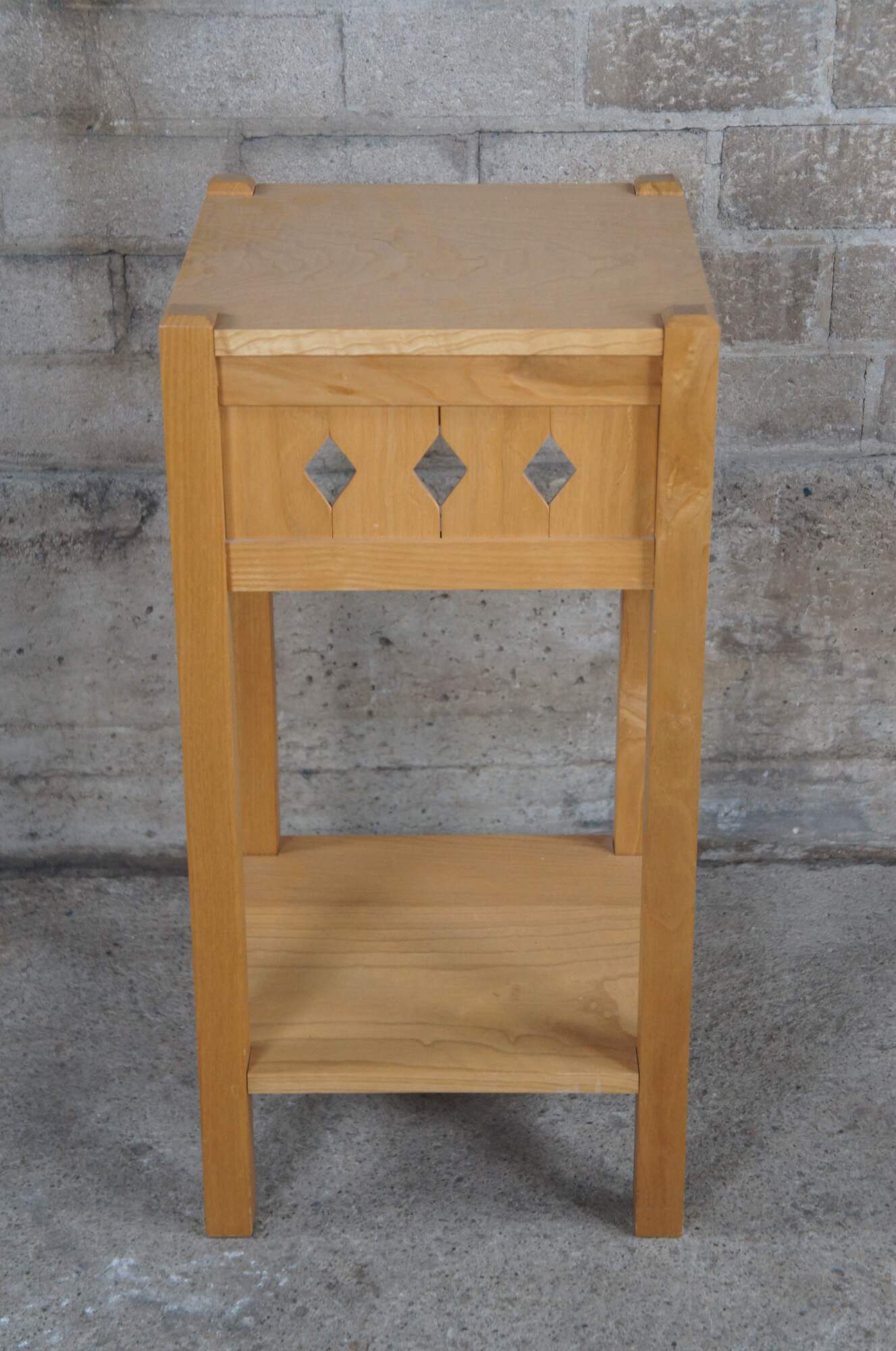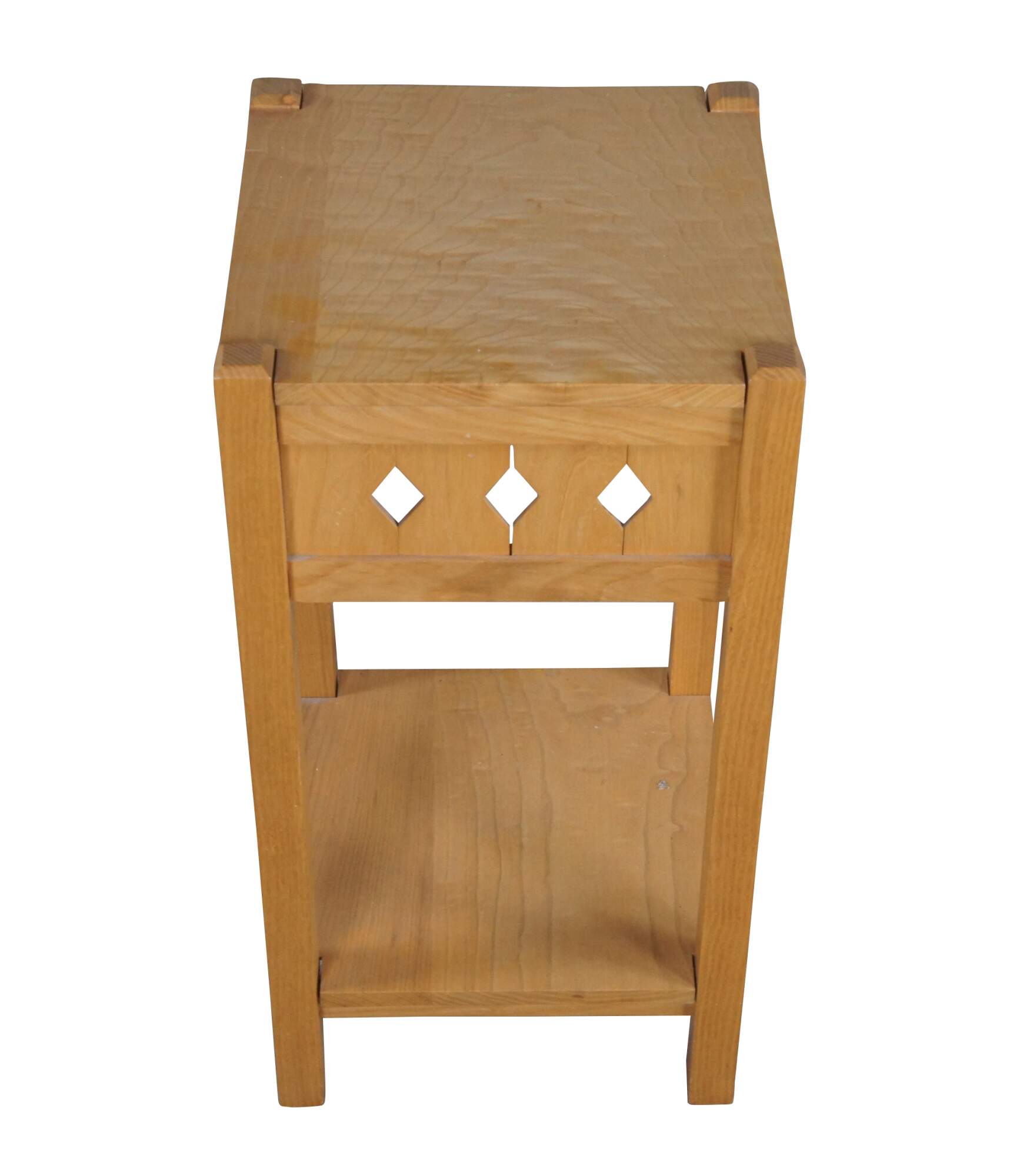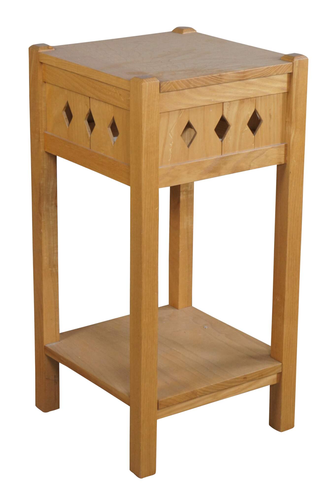 Pair of Late 20th century mission/arts & crafts inspired table by Matthew Baker of Dayton, Ohio. A square two tier design with diamond pierced apron. Made from Ash with a (quilted ash) curly ash top. In the manner of California Arts & Crafts. After the Douglas Fir Square Side Table, a copy of Brooks Furniture Co design.
