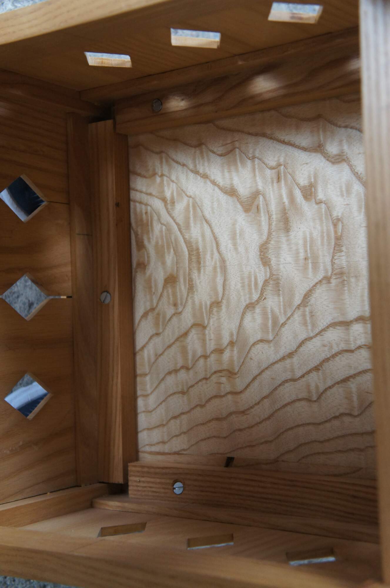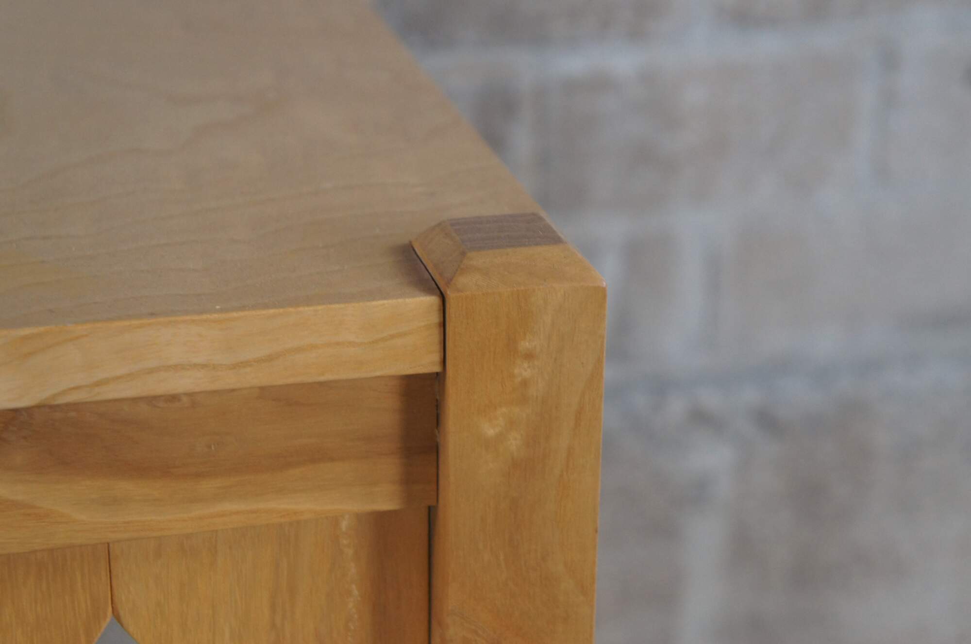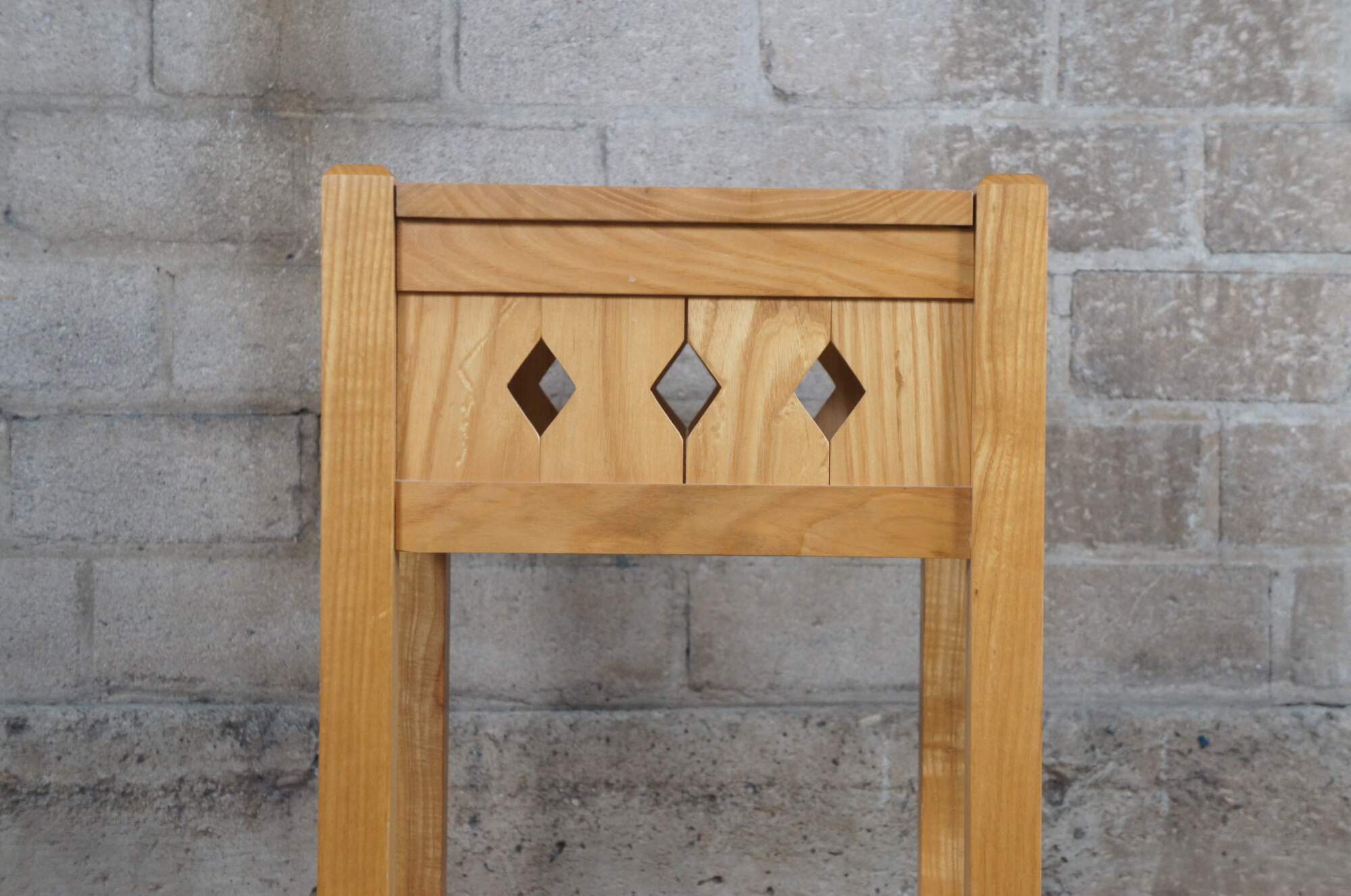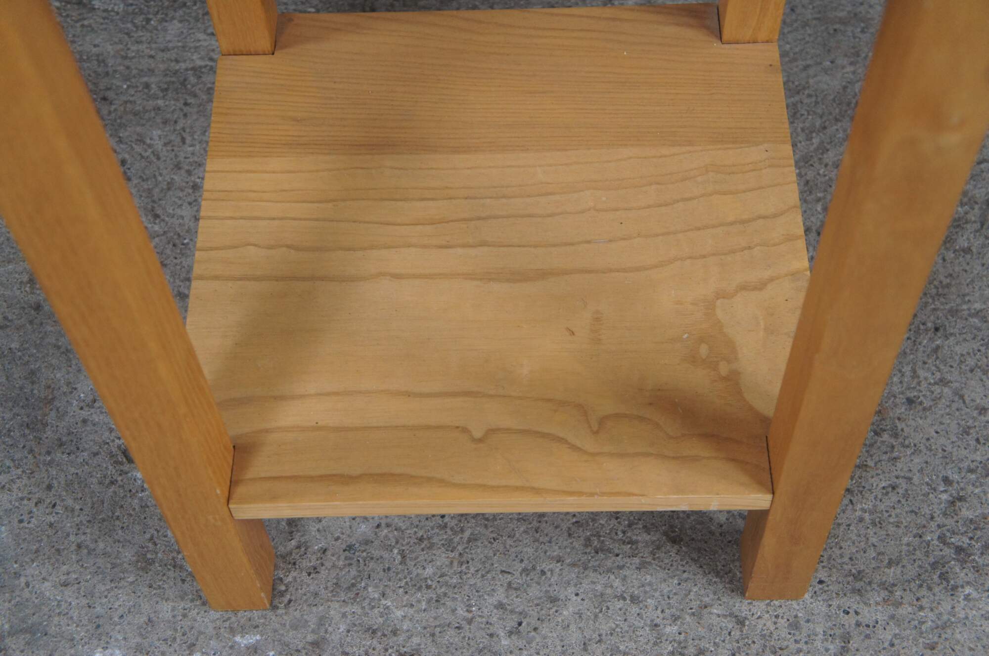 Pair of Late 20th century mission/arts & crafts inspired table by Matthew Baker of Dayton, Ohio. A square two tier design with diamond pierced apron. Made from Ash with a (quilted ash) curly ash top. In the manner of California Arts & Crafts. After the Douglas Fir Square Side Table, a copy of Brooks Furniture Co design.