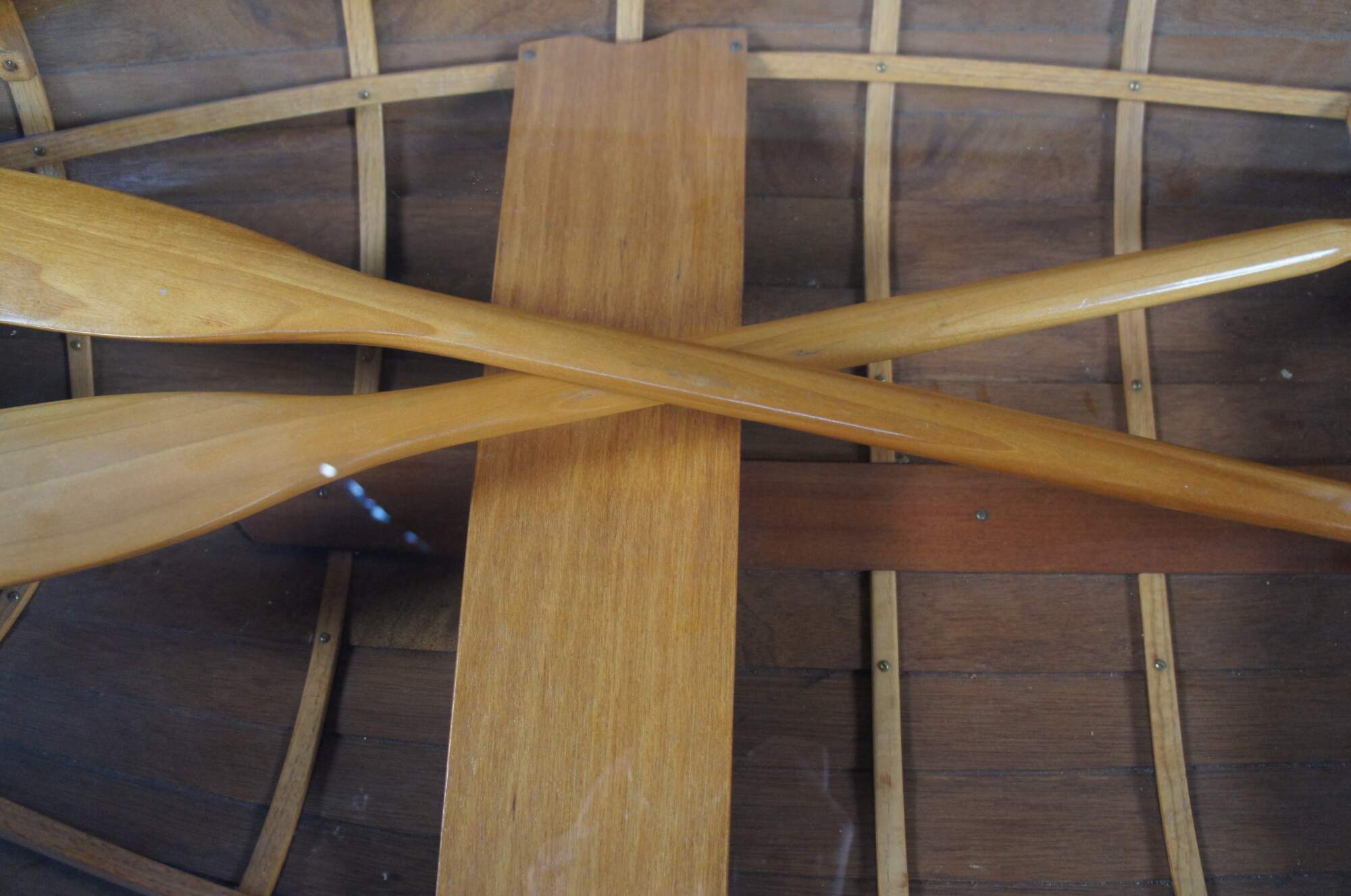 Vintage scaled down row boat or dinghy coffee / cocktail Table. Handmade from oak with beautifully stained and painted wood with brass screws, a custom glass top, oars and sturdy wood stand. Marked along backside. Brass plate reads "Handcrafted by Wood-N-Stuff Inc., #639." The perfect centerpiece for a water-themed room.