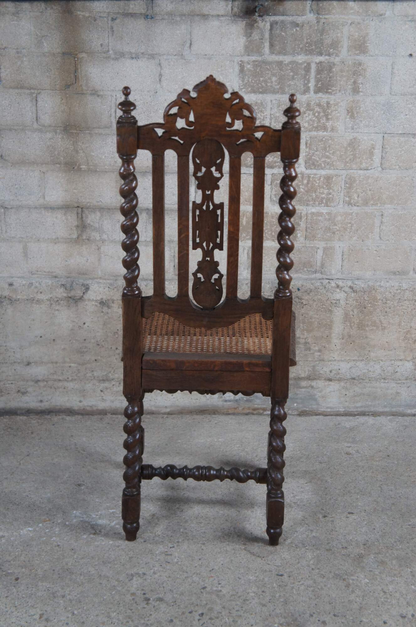 Set of 3 Antique French Renaissance dining chairs. Beautifully crafted with oak frames carved in a Baroque manner with pierced backs and barley twist supports. Features woven cane seats neatly framed by a beveled and carved wooden seat frame. Each chair is supported by turnip feet.