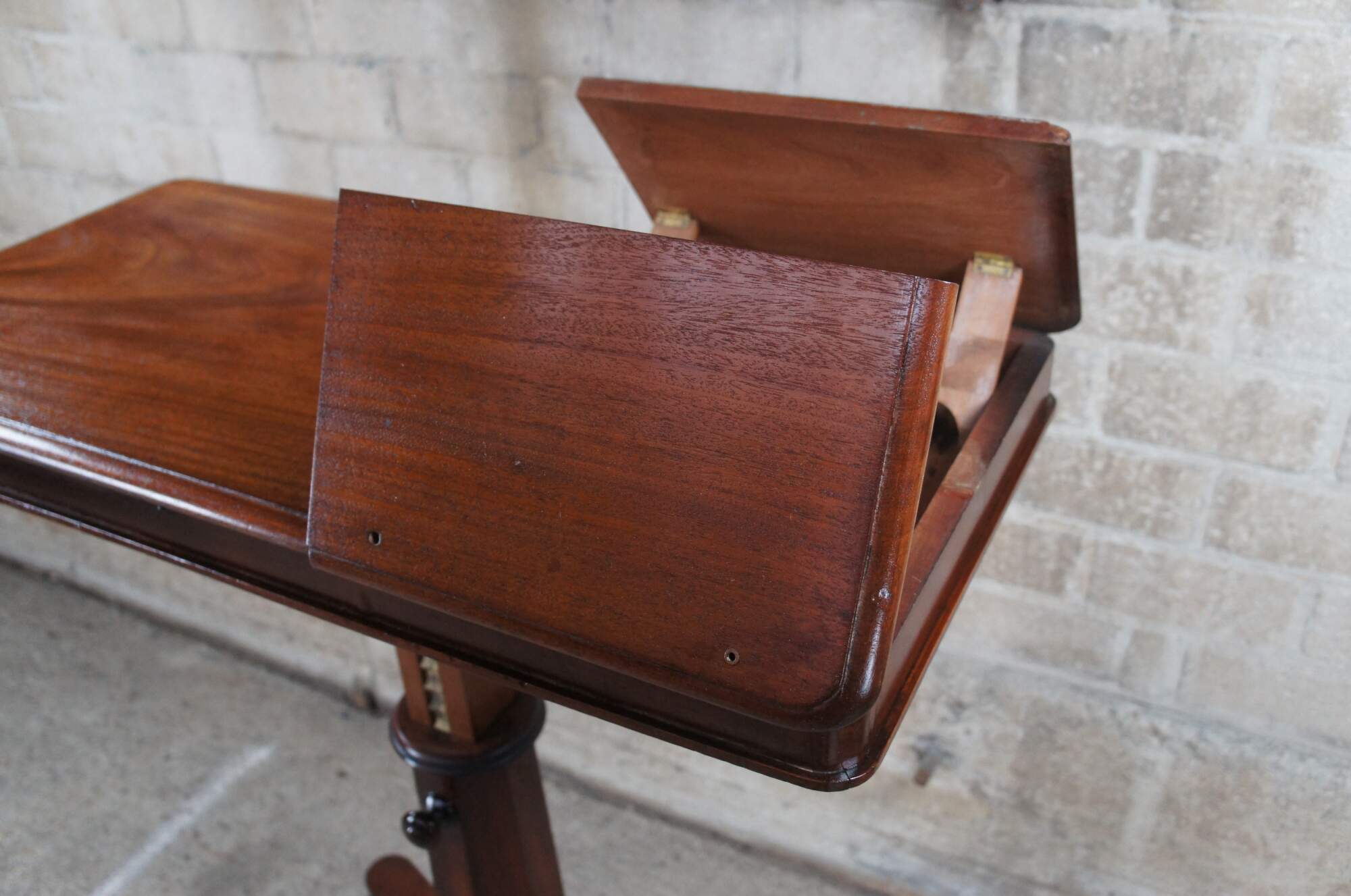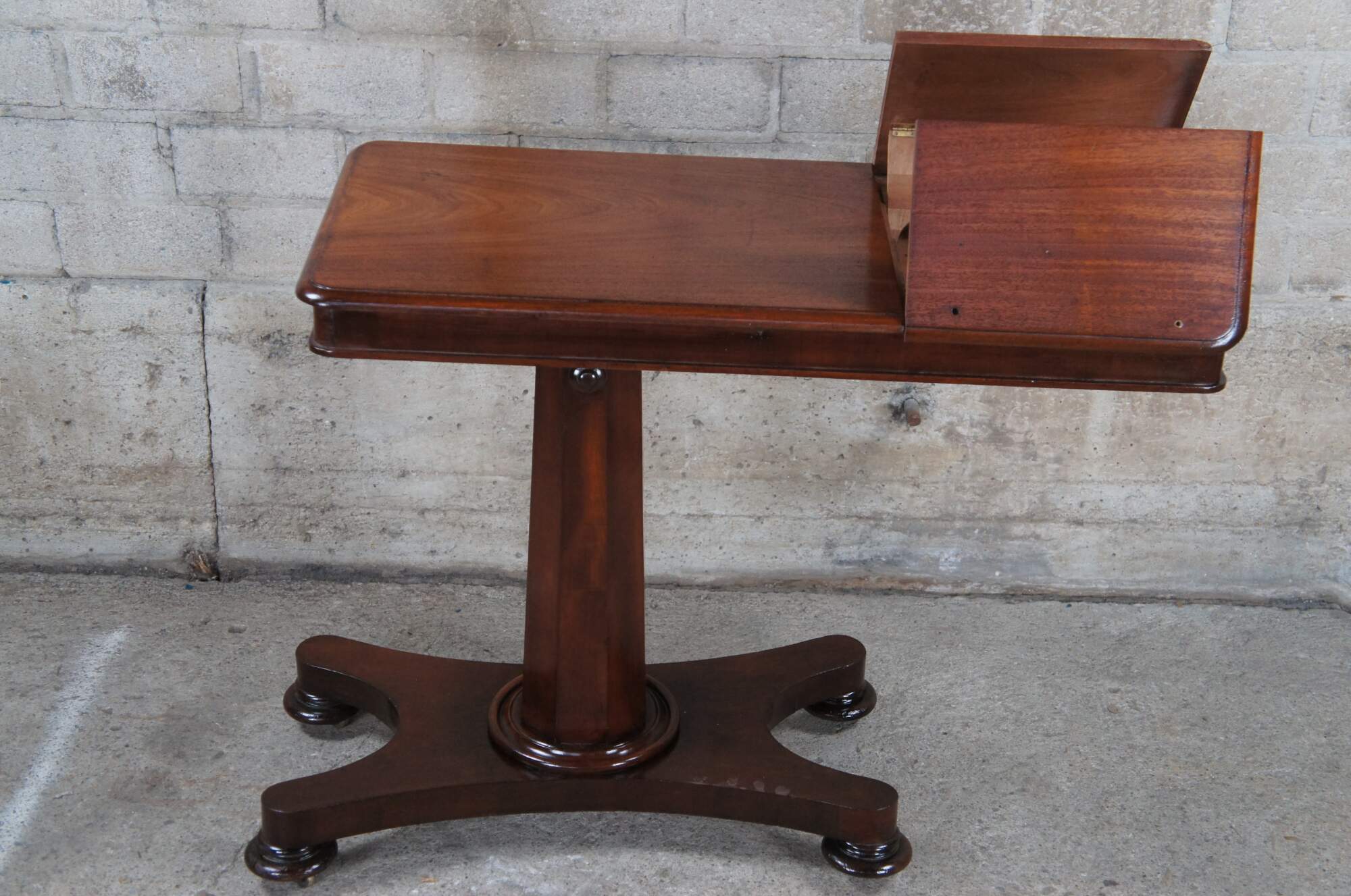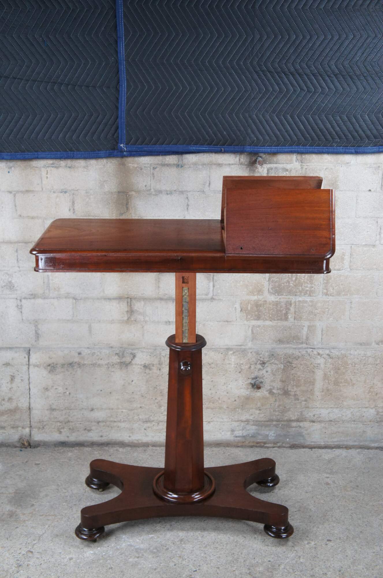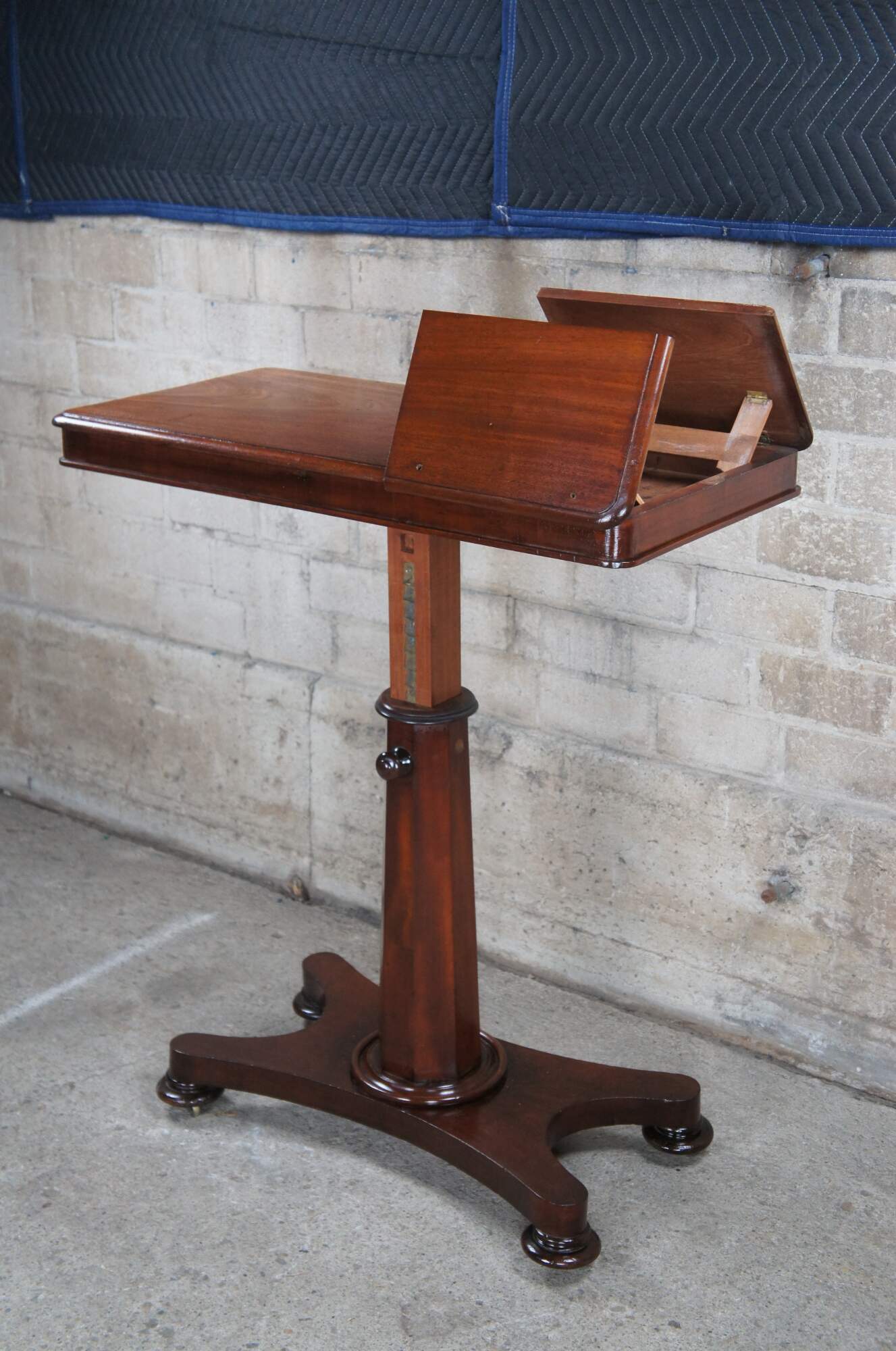 An impressive William IV era mahogany Invalids table. Features a rectangular sliding top with a pair of ratcheted reading slopes to one side, over an adjustable octagonal stem above a shaped quadripartite base over flared bun feet with metal casters. Each slope has a small hole with brass insert towards the base for tray / reading shelf attachments. The tables versatile size allows for use as a console, lectern or duet music stand.