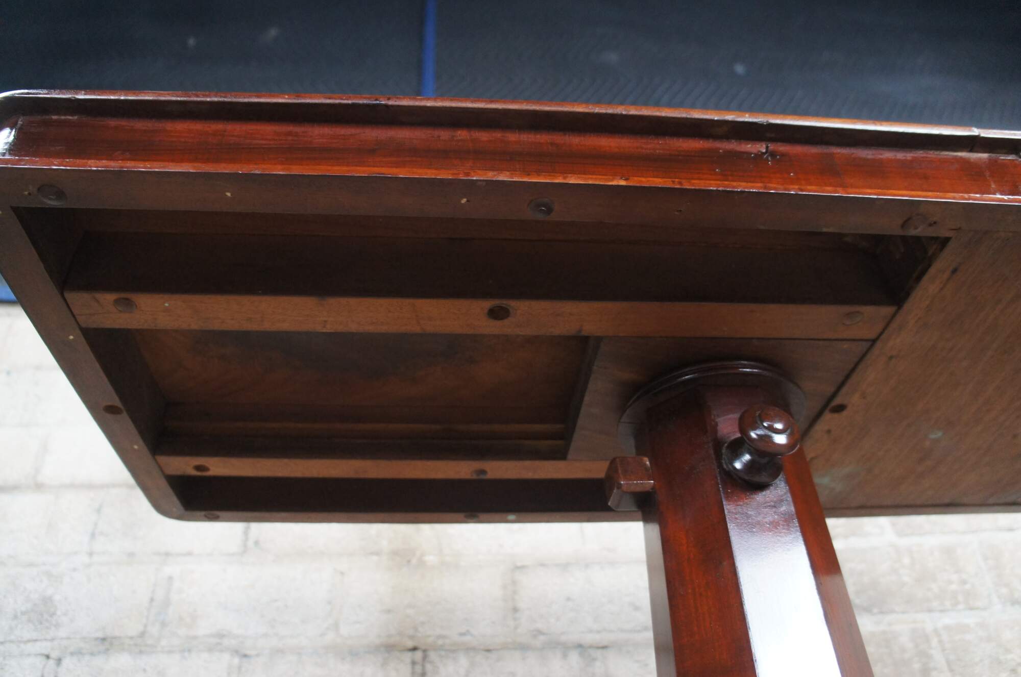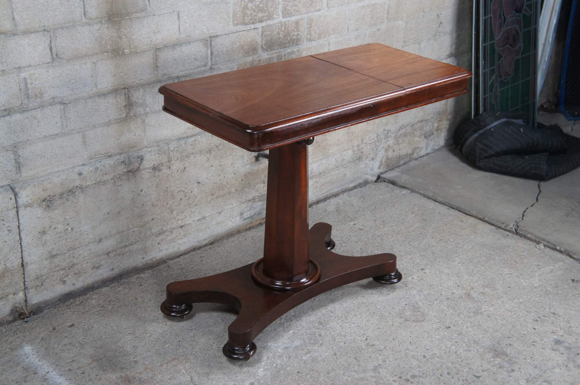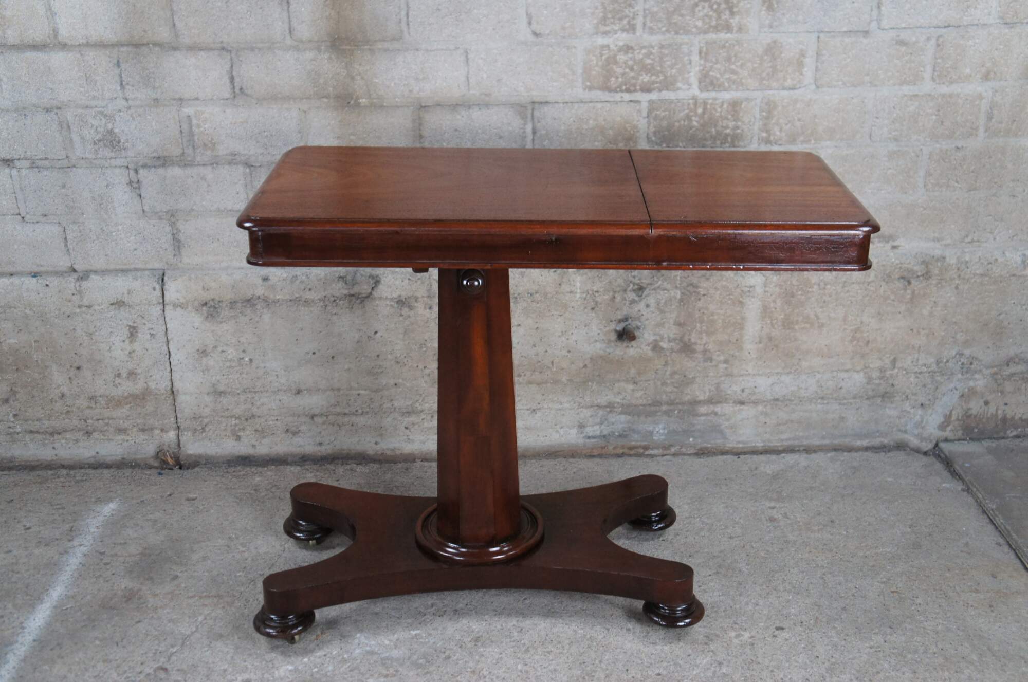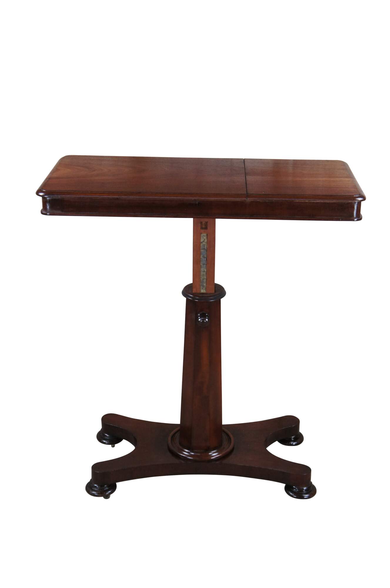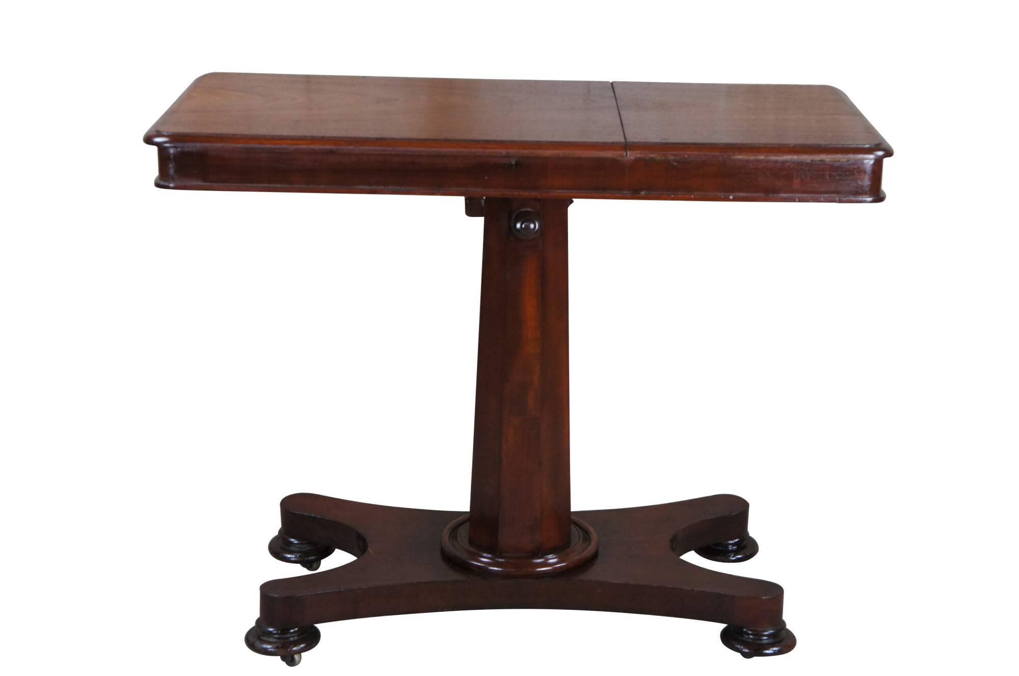 An impressive William IV era mahogany Invalids table. Features a rectangular sliding top with a pair of ratcheted reading slopes to one side, over an adjustable octagonal stem above a shaped quadripartite base over flared bun feet with metal casters. Each slope has a small hole with brass insert towards the base for tray / reading shelf attachments. The tables versatile size allows for use as a console, lectern or duet music stand.