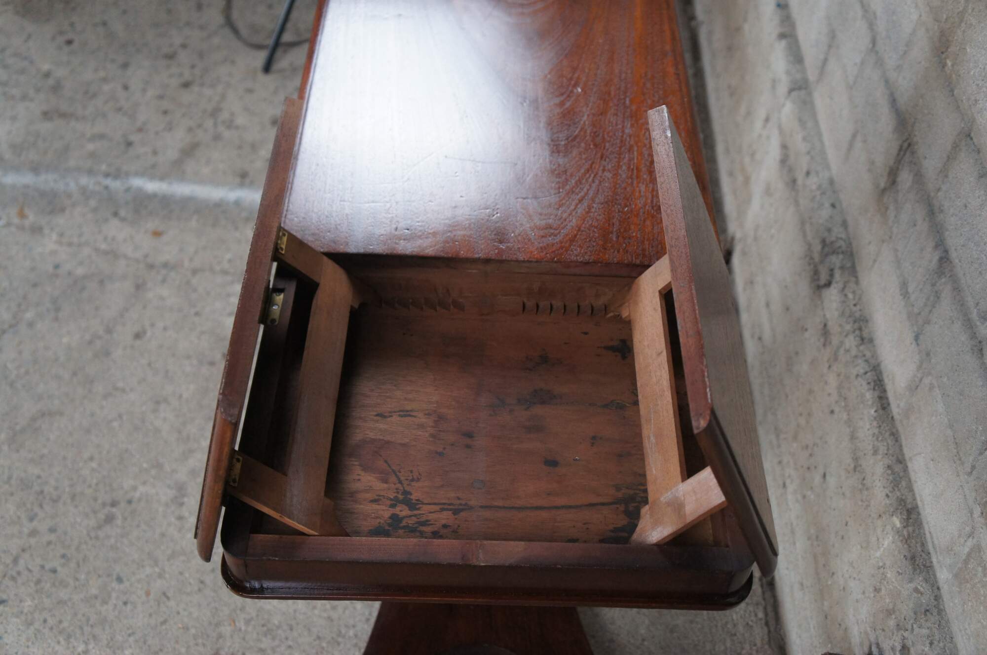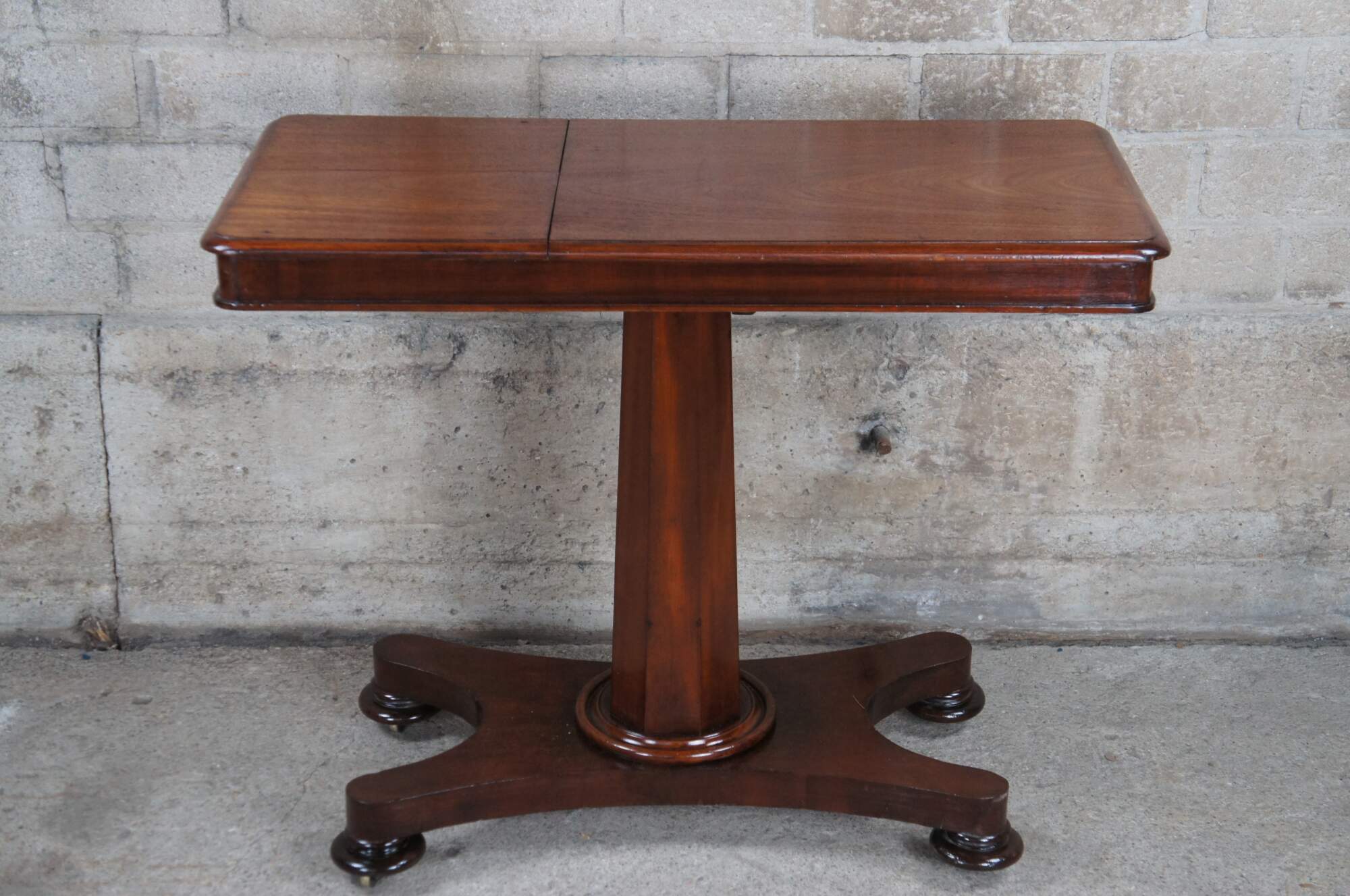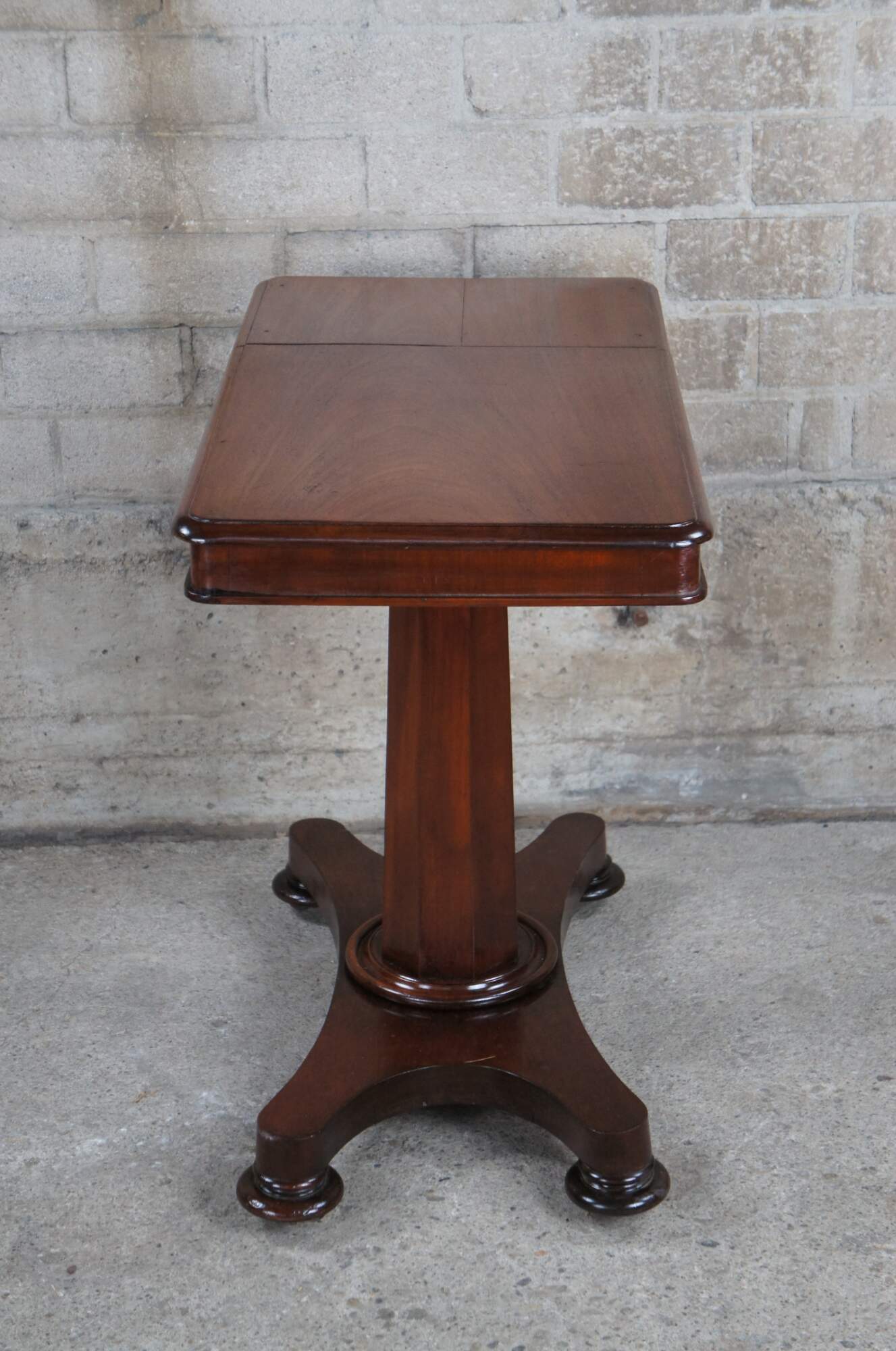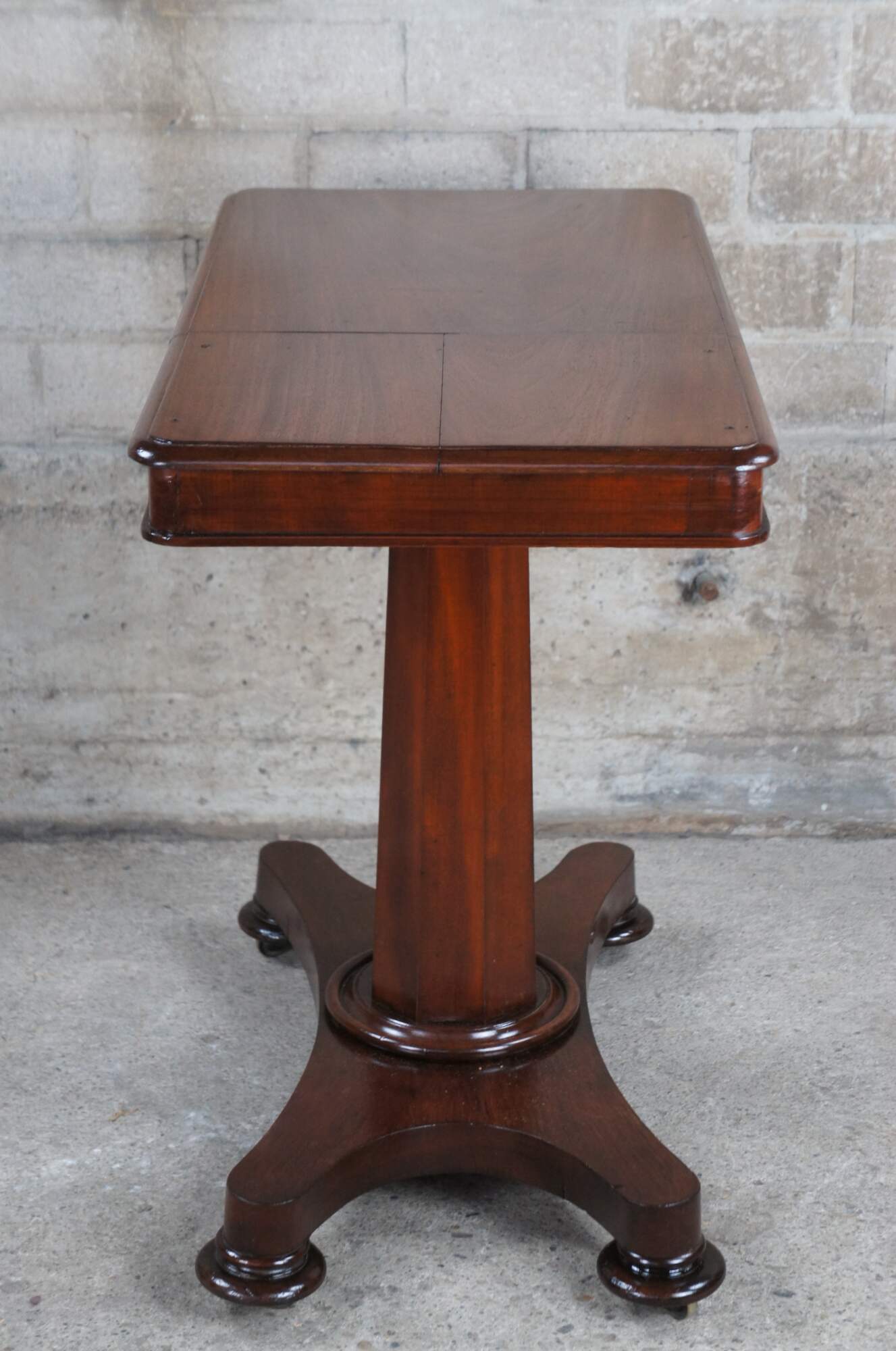 An impressive William IV era mahogany Invalids table. Features a rectangular sliding top with a pair of ratcheted reading slopes to one side, over an adjustable octagonal stem above a shaped quadripartite base over flared bun feet with metal casters. Each slope has a small hole with brass insert towards the base for tray / reading shelf attachments. The tables versatile size allows for use as a console, lectern or duet music stand.