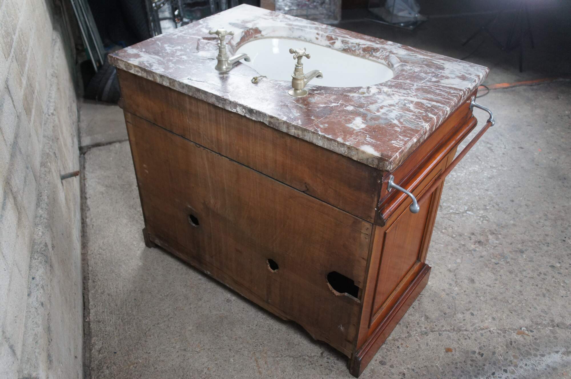 An exceptional Victorian Era bathroom vanity. Made from walnut with red and white vein marble top. Features a porcelain delta sink with hot and cold spigot. The cabinet has a traditional form with spandrels leading to fluting along the stiles and paneled doors that open via brass hardware with rear catch. Includes towel bar off the left side