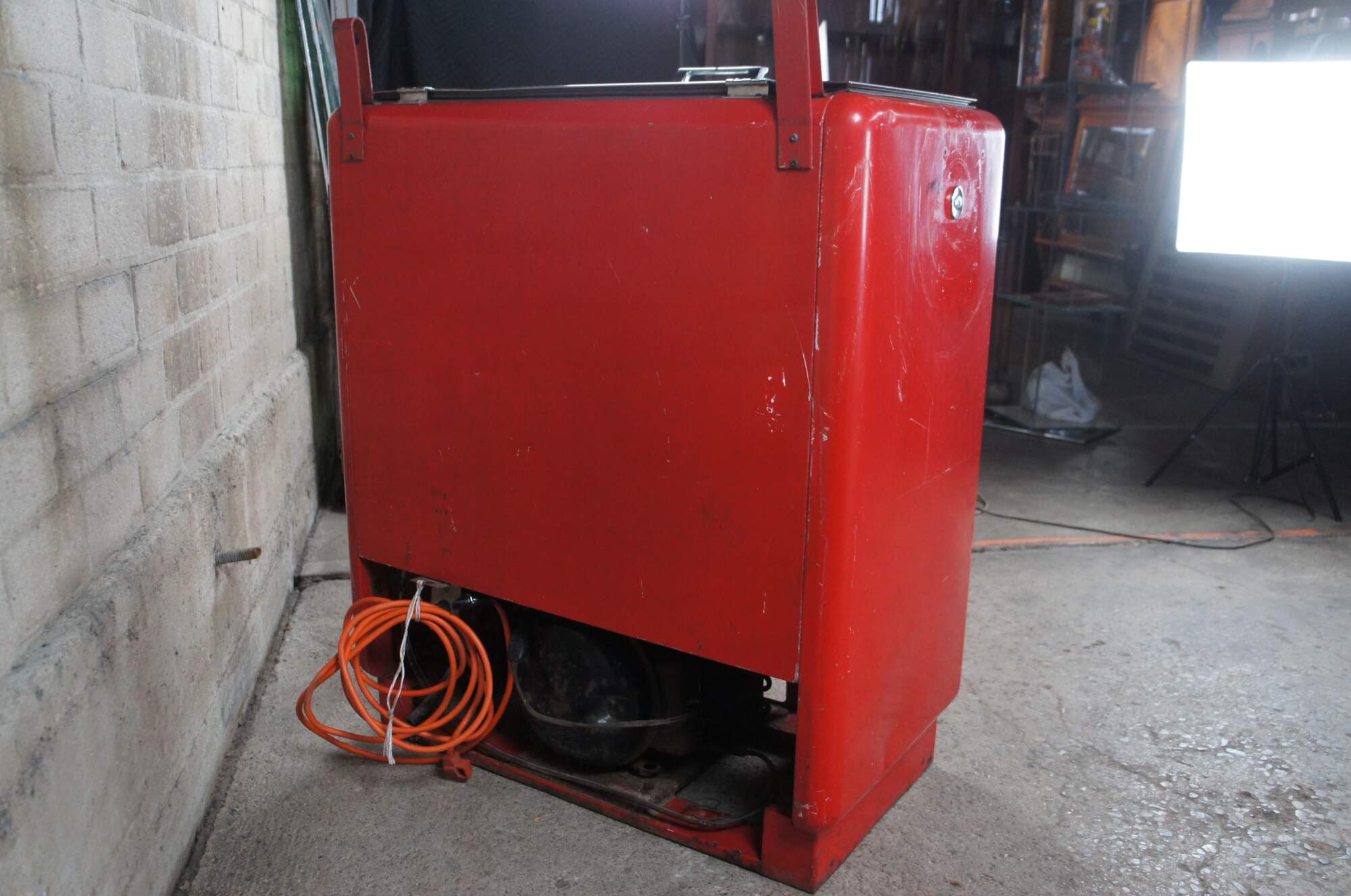 On the outside, it had a chromed top lid with a chrome handle. On the front, it had the fishtail Coca-Cola logo used after 1958 on some machines. It also had a bottle opener and catcher on the front left side and a Glasco metal plate logo near the top right corner.
