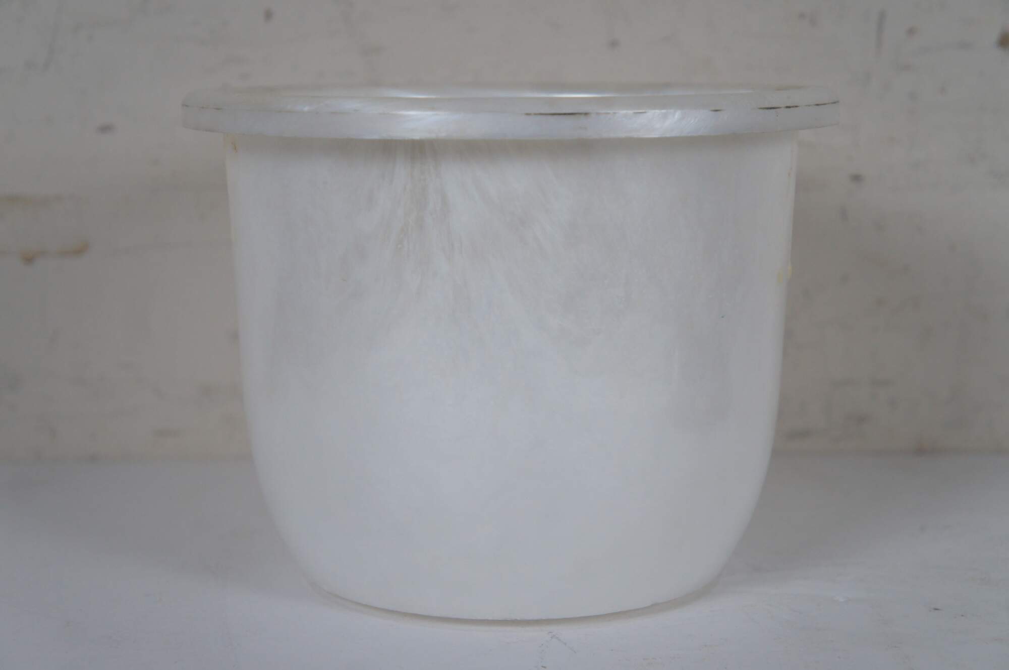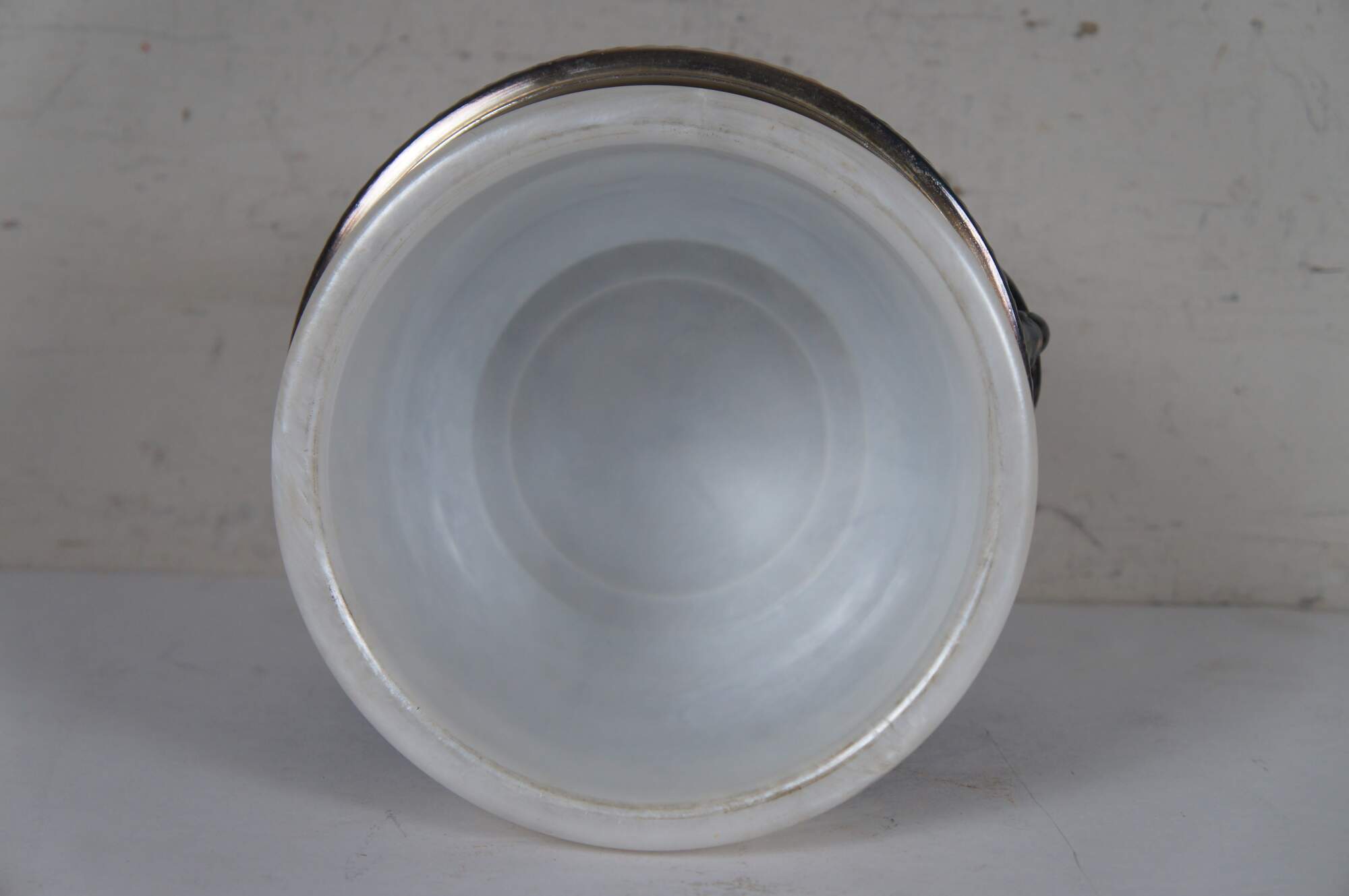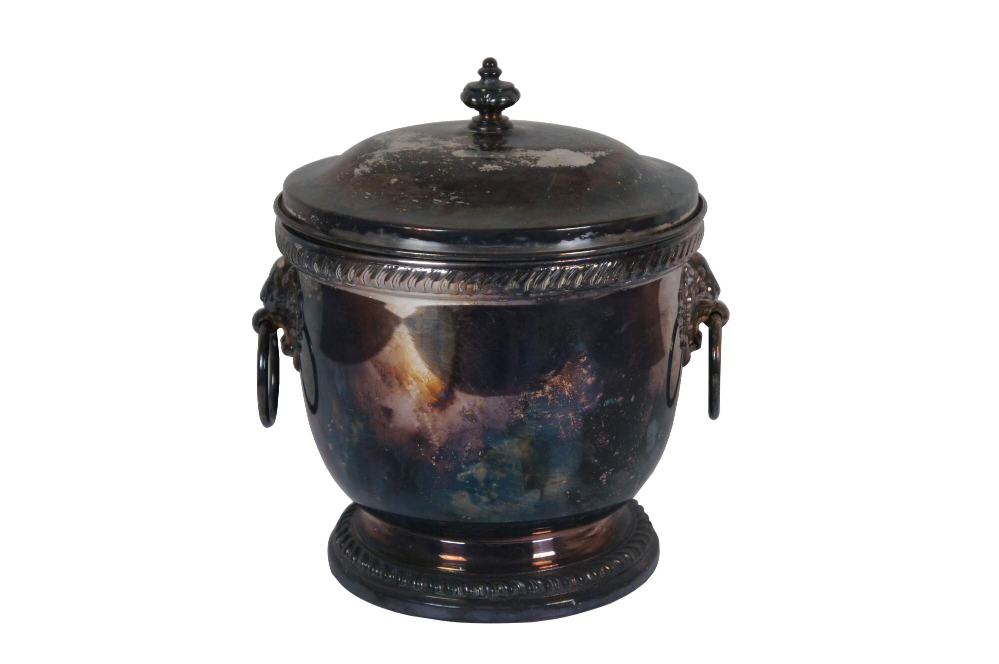 Vintage Silver Plated Copper ice bucket with white plastic insert by Poole silver Company, numer 3700. Features winged lion's heads holding ring handles, rope twist details, and vase shaped finial.