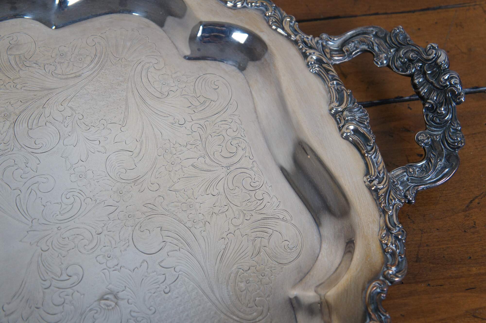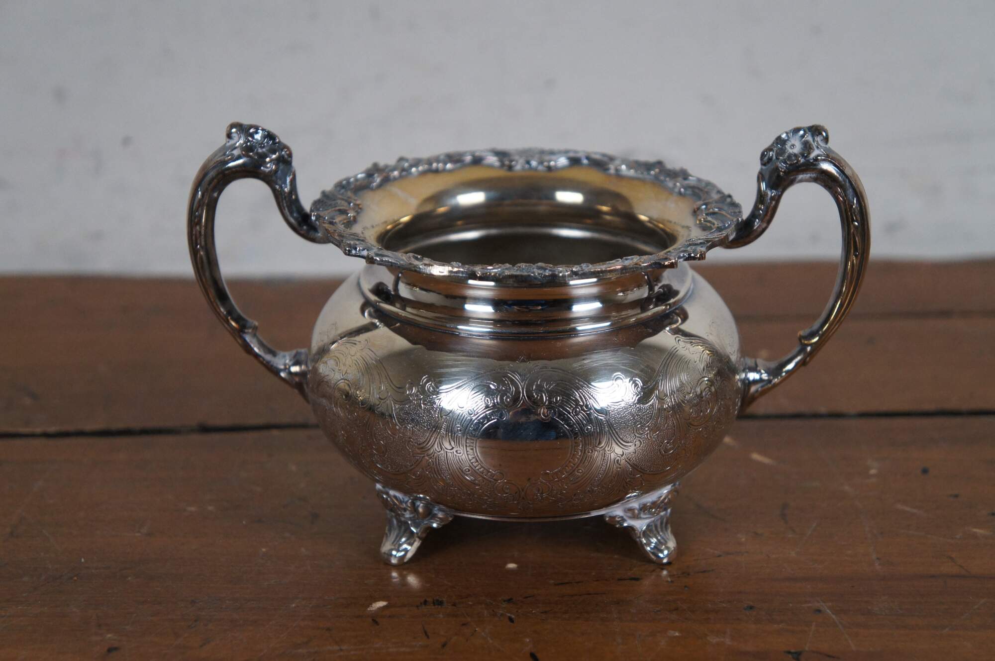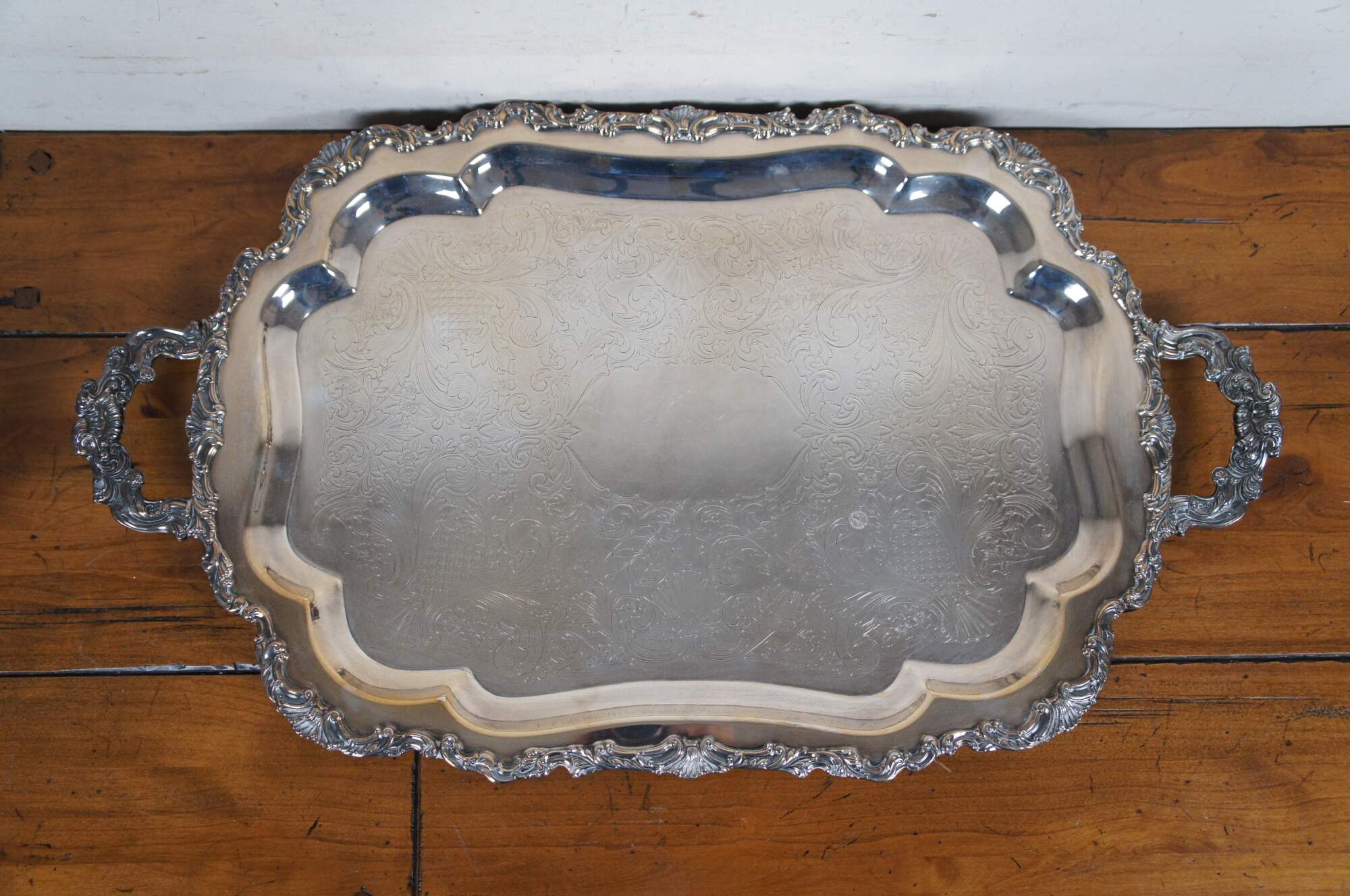 Mid century 6 piece Sheffield Design Reproduction by Community silver plate tea set, including a large handled / footed tray, tea pot and coffee pot with hinged lids, cream pitcher, waste pot, and lidded sugar bowl. Decorated with molded and etched scallops / florals.