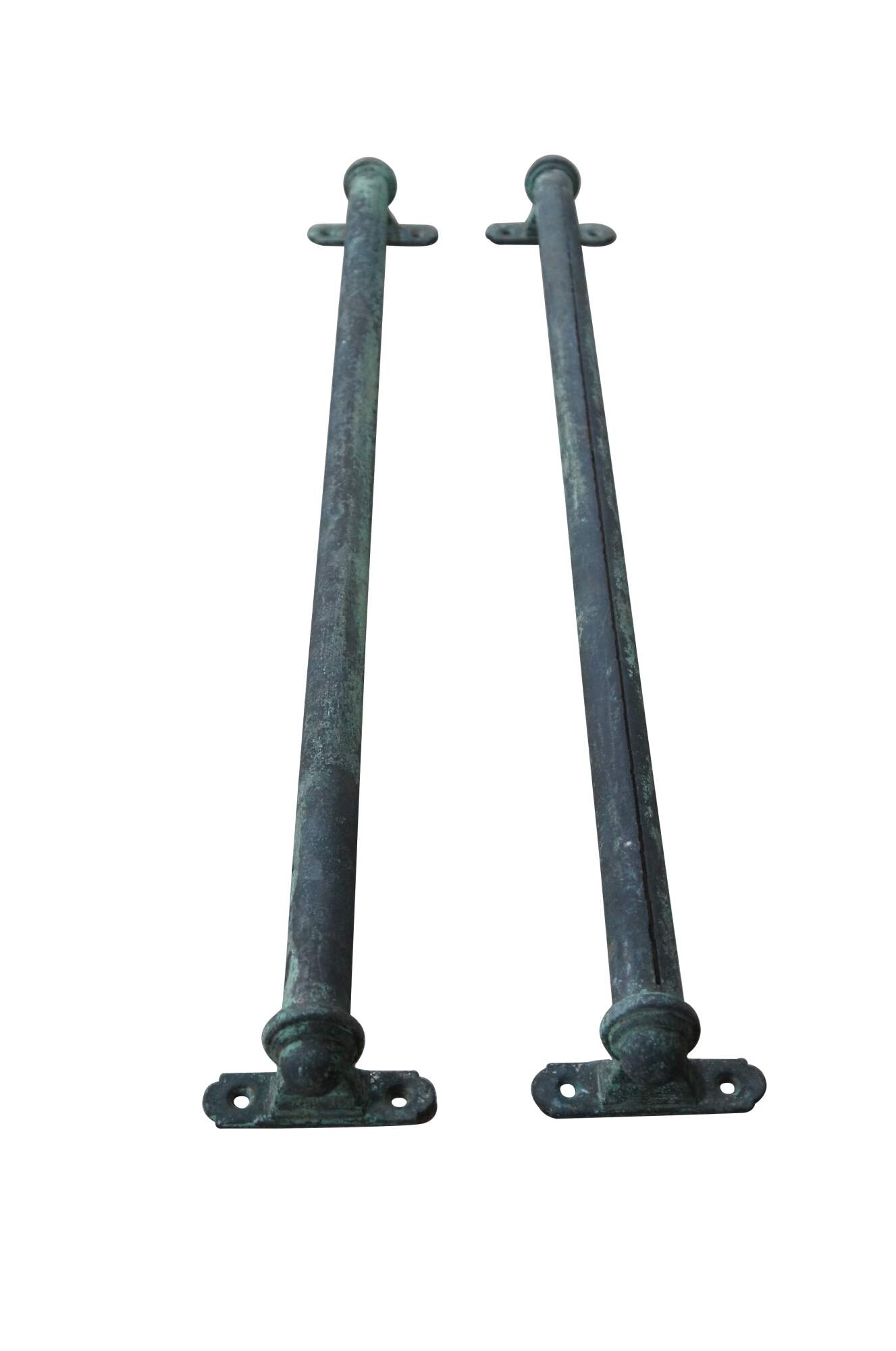 Pair of antique brass shower rods. Features ornate brackets with tubular style brass centers.