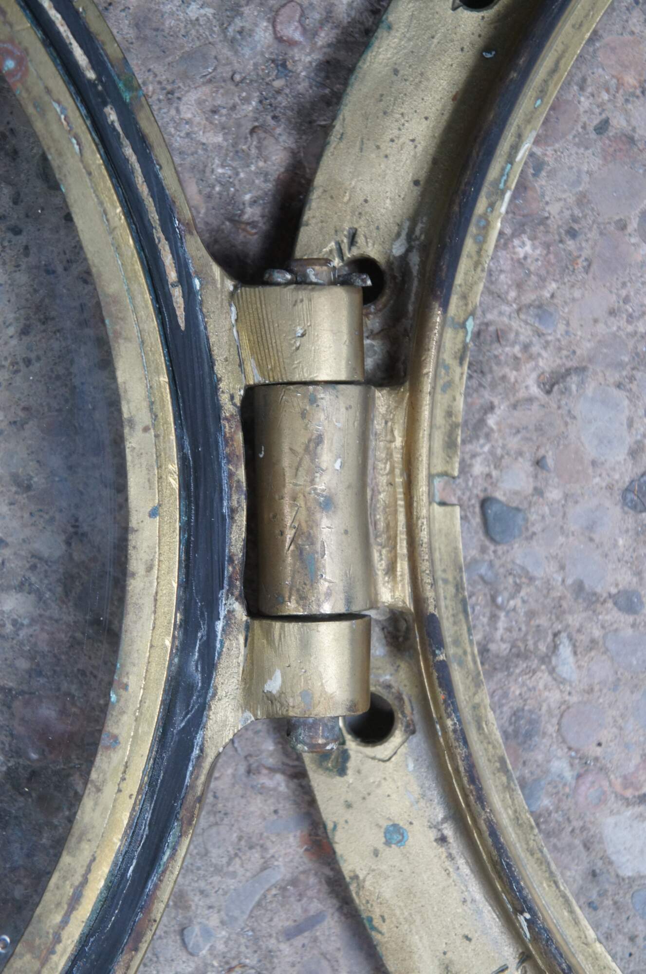Extremely unique original large antique heavy solid bronze maritime Ship's Porthole or Hatch. The majority are rather simple and made from aluminum or nickel plated rather than heavy bronze like this unique specimen. The vast majority of portholes on the market today are modern or reproduction's. This aged beauty is complete with original green glass and 3 dogs. High quality construction and hefty weight. Includes Sekurit Weather Glass.