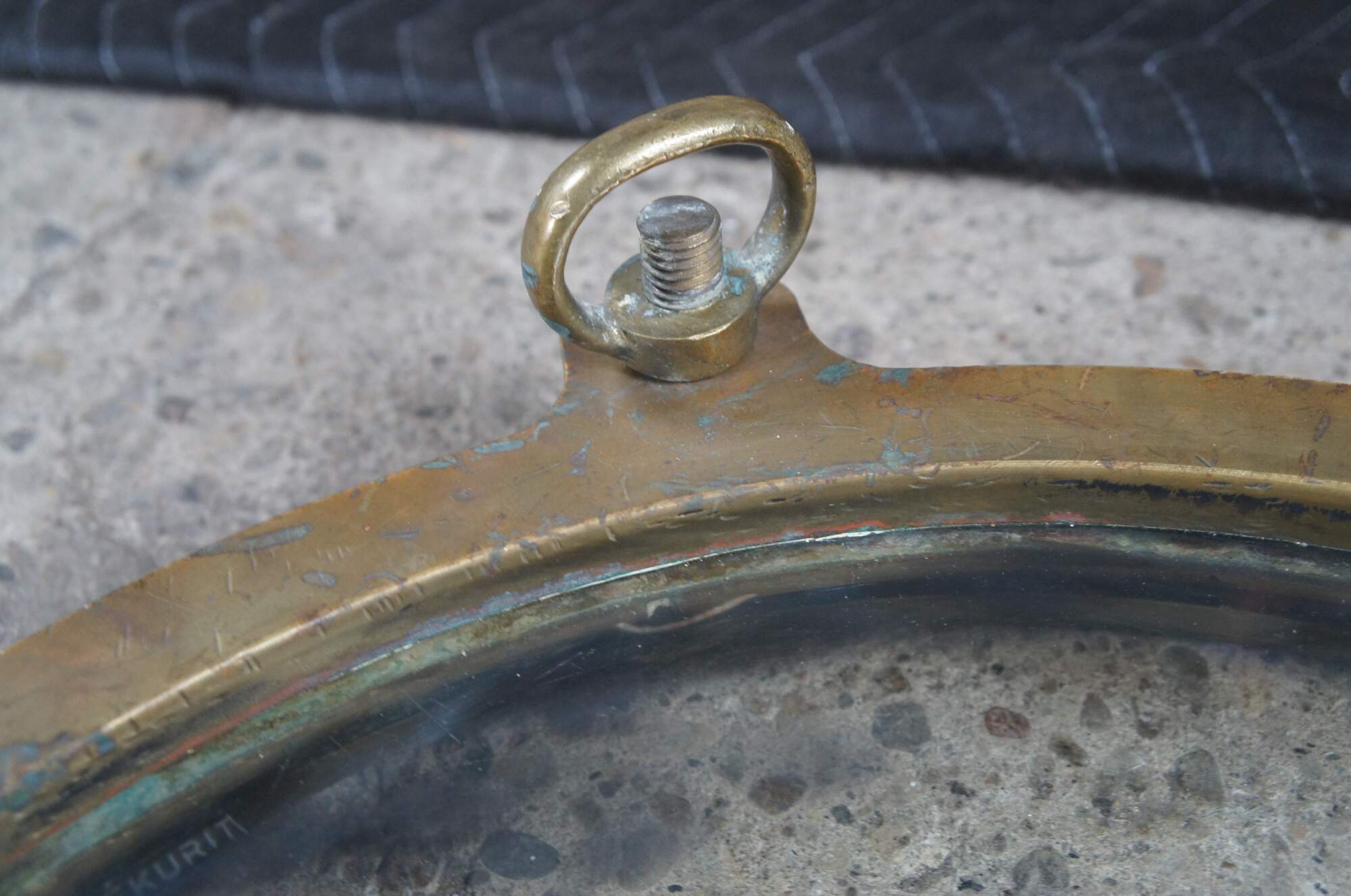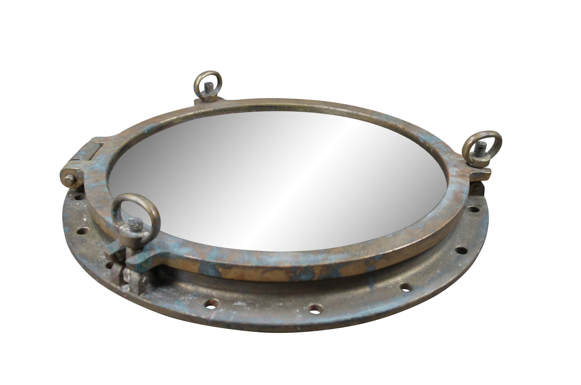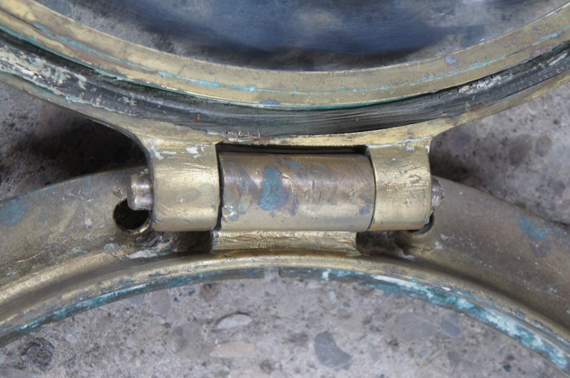 Extremely unique original large antique heavy solid bronze maritime Ship's Porthole or Hatch. The majority are rather simple and made from aluminum or nickel plated rather than heavy bronze like this unique specimen. The vast majority of portholes on the market today are modern or reproduction's. This aged beauty is complete with original green glass and 3 dogs. High quality construction and hefty weight. Includes Sekurit Weather Glass.