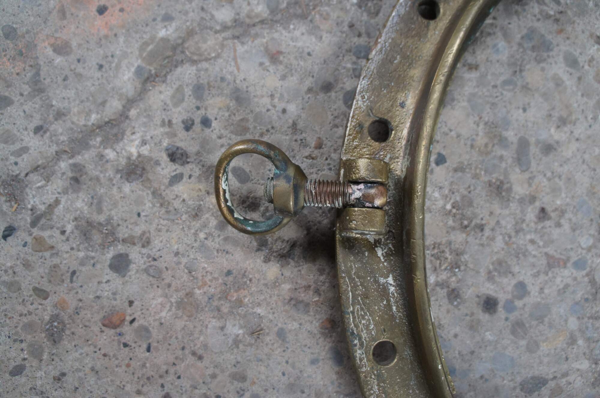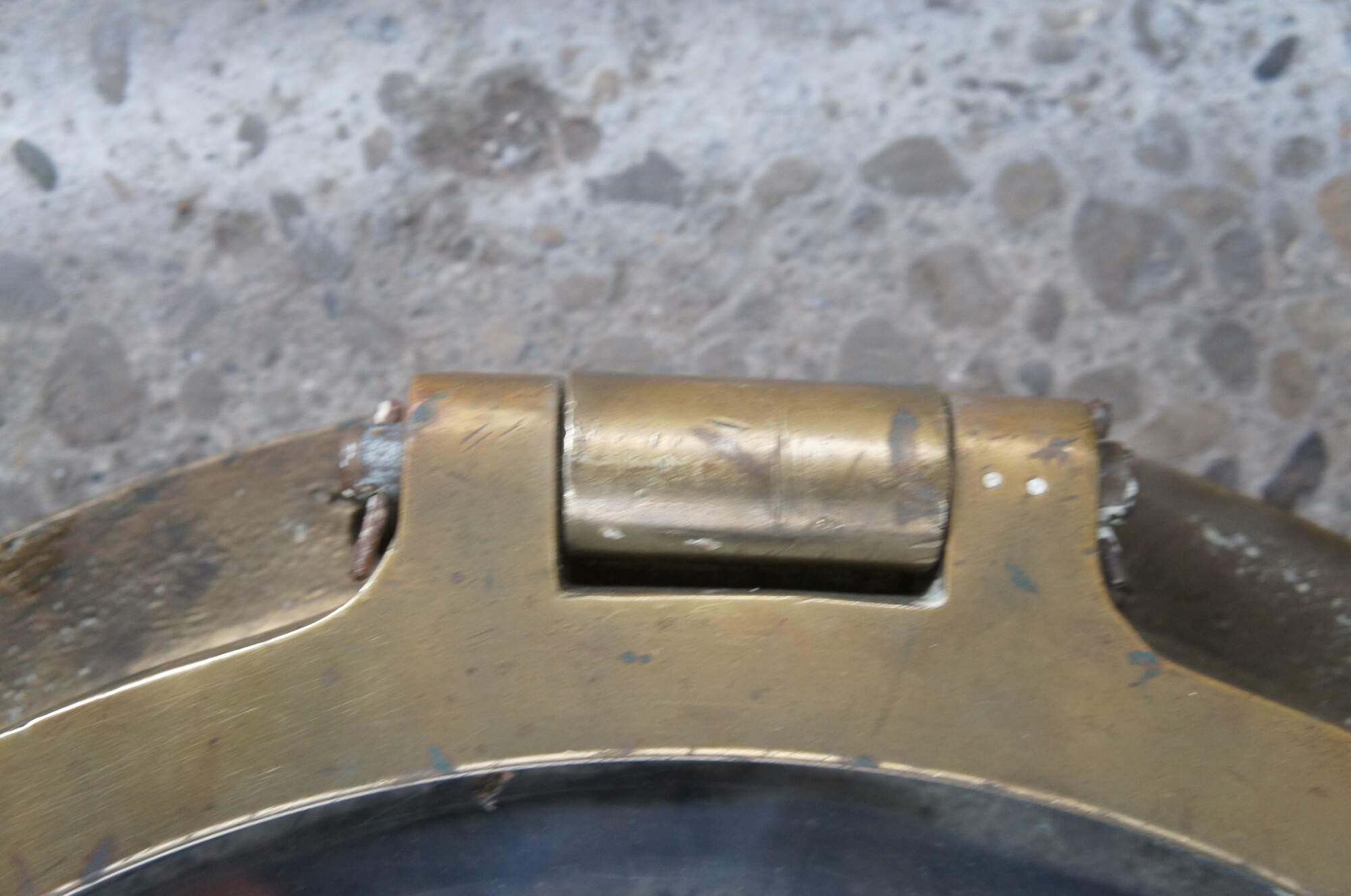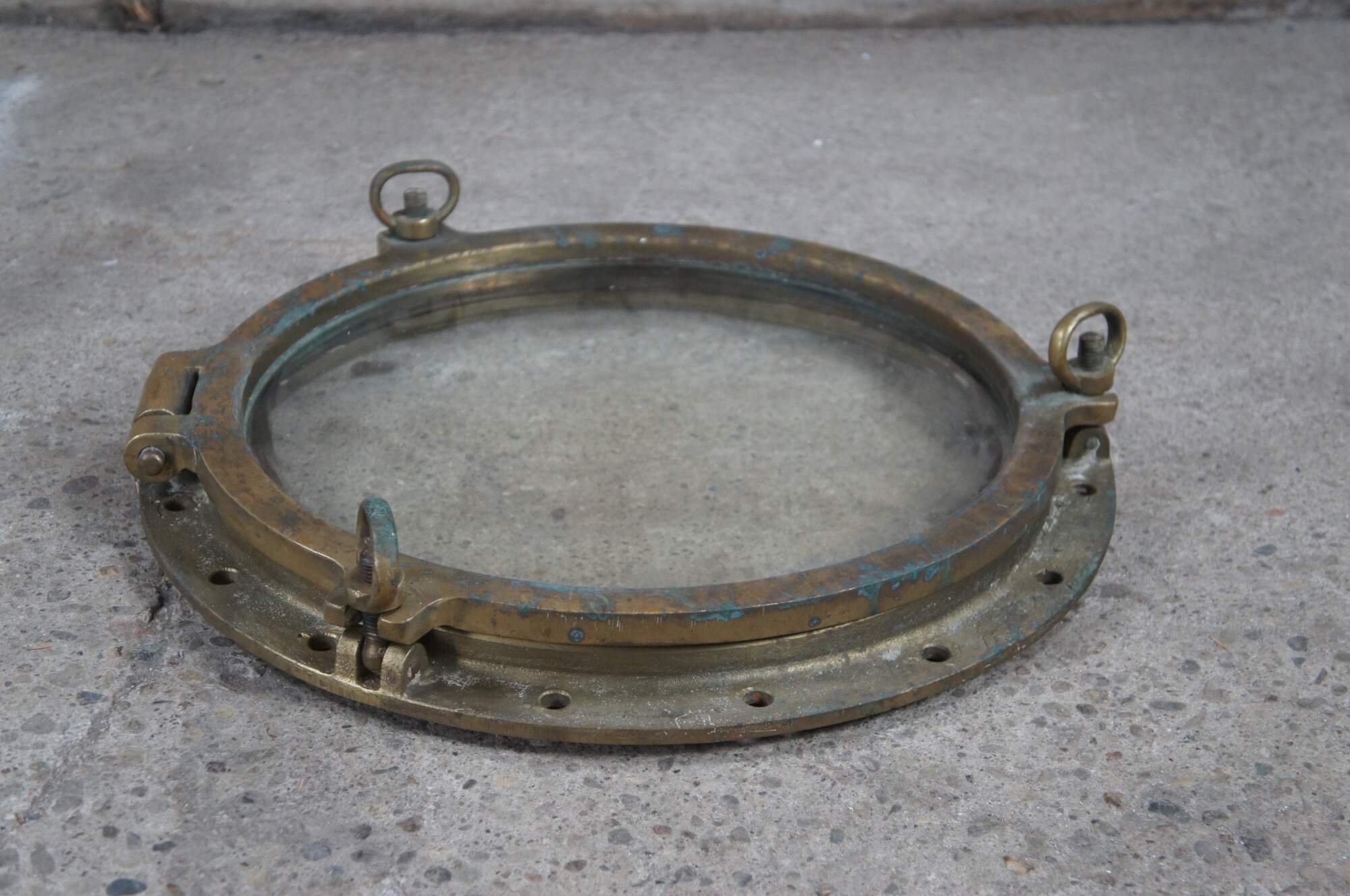 Extremely unique original large antique heavy solid bronze maritime Ship's Porthole or Hatch. The majority are rather simple and made from aluminum or nickel plated rather than heavy bronze like this unique specimen. The vast majority of portholes on the market today are modern or reproduction's. This aged beauty is complete with original green glass and 3 dogs. High quality construction and hefty weight. Includes Sekurit Weather Glass.