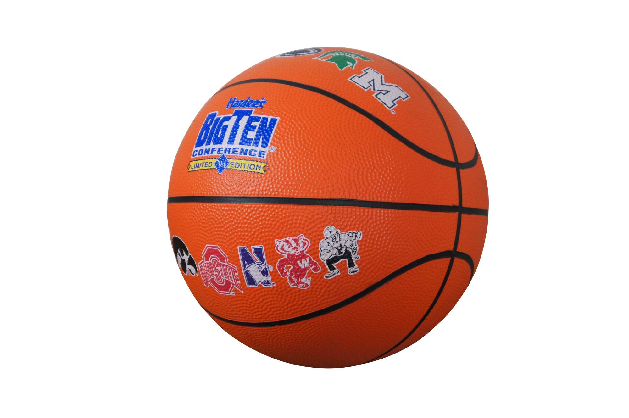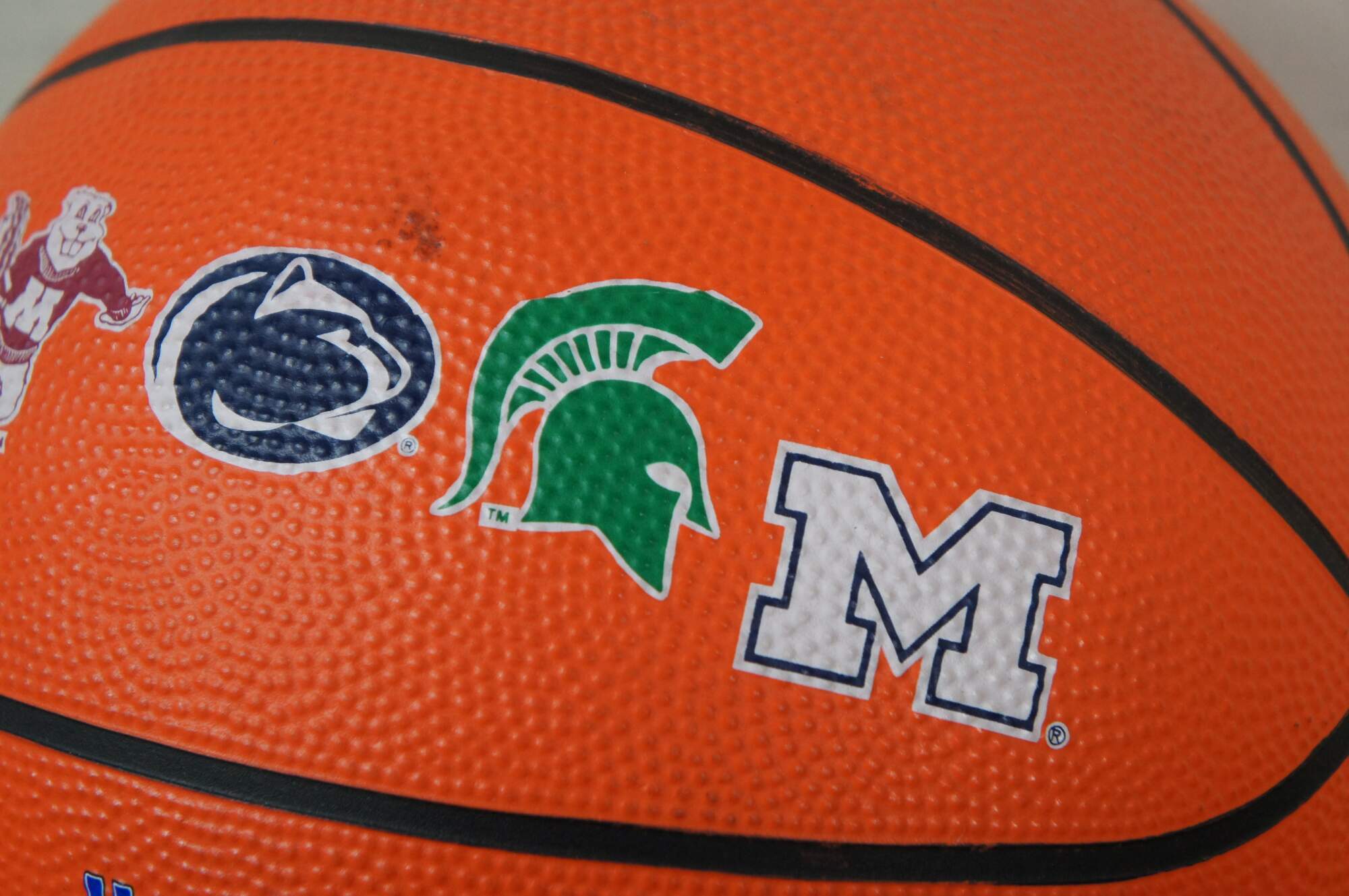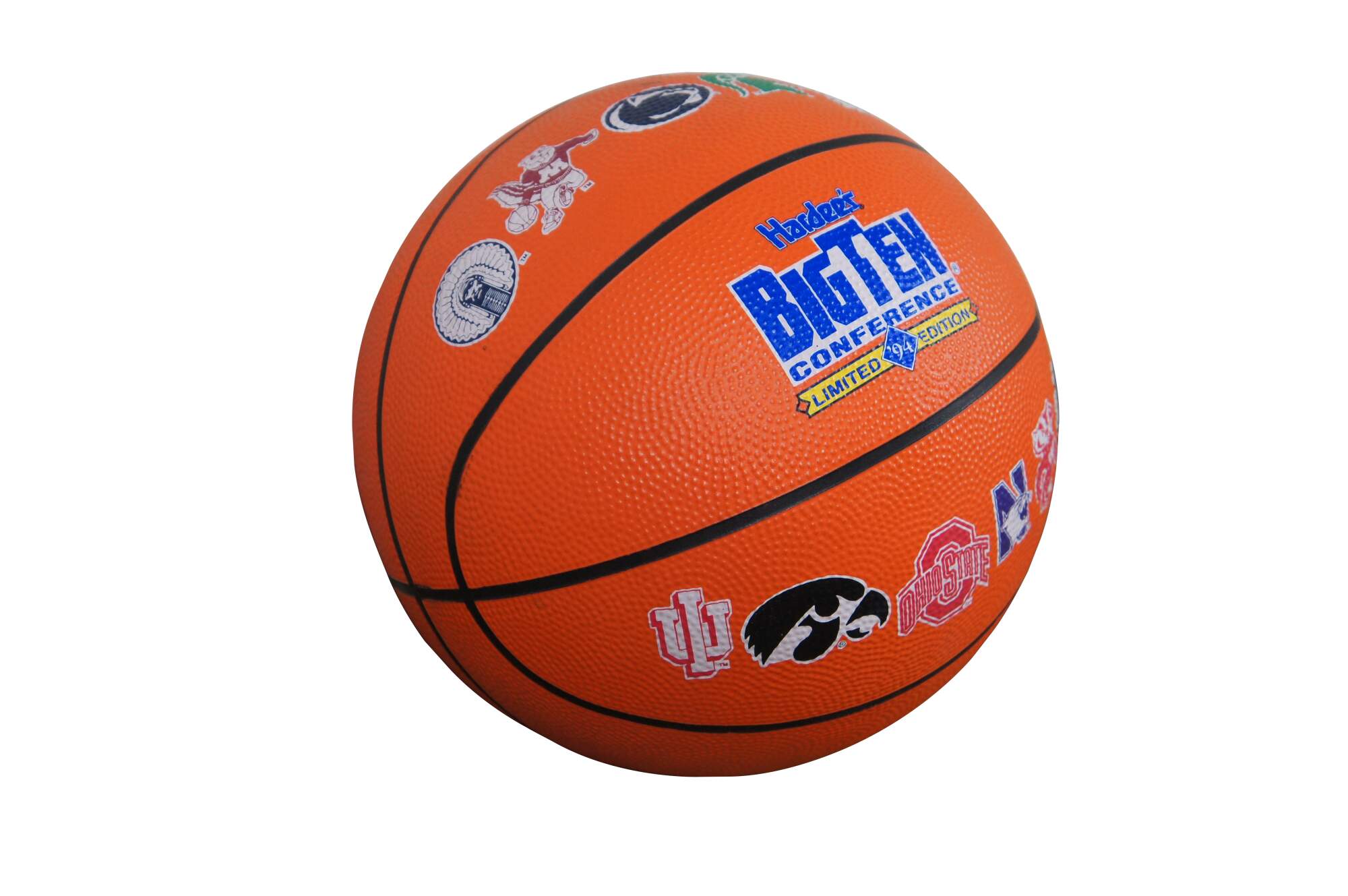 Vintage 1994 Limited Edition Big Ten Conference sponsered by Hardee's full size souvenir basketball - traditional orange and black with Big Ten Conference team logos. Produced by Hutch. Made in Thailand. Indiana Hoosiers IU, Iowa Hawkeyes, Ohio State Buckeyes OSU, Northwestern Wildcats, Wisconson Badgers, Purdue Boilermakers, Illinois Fighting Illini, Minnesota Golden Gophers, Penn State Nittany Lions, Michigan State Spartans, Michigan Wolverines.