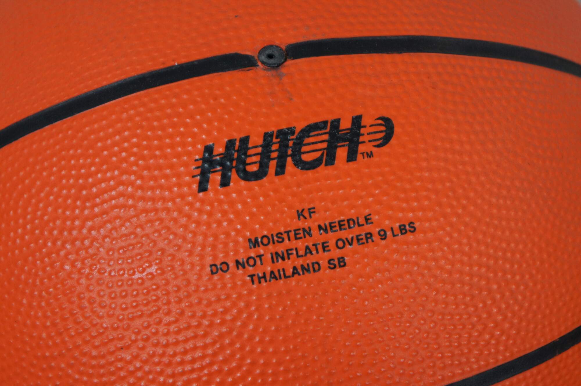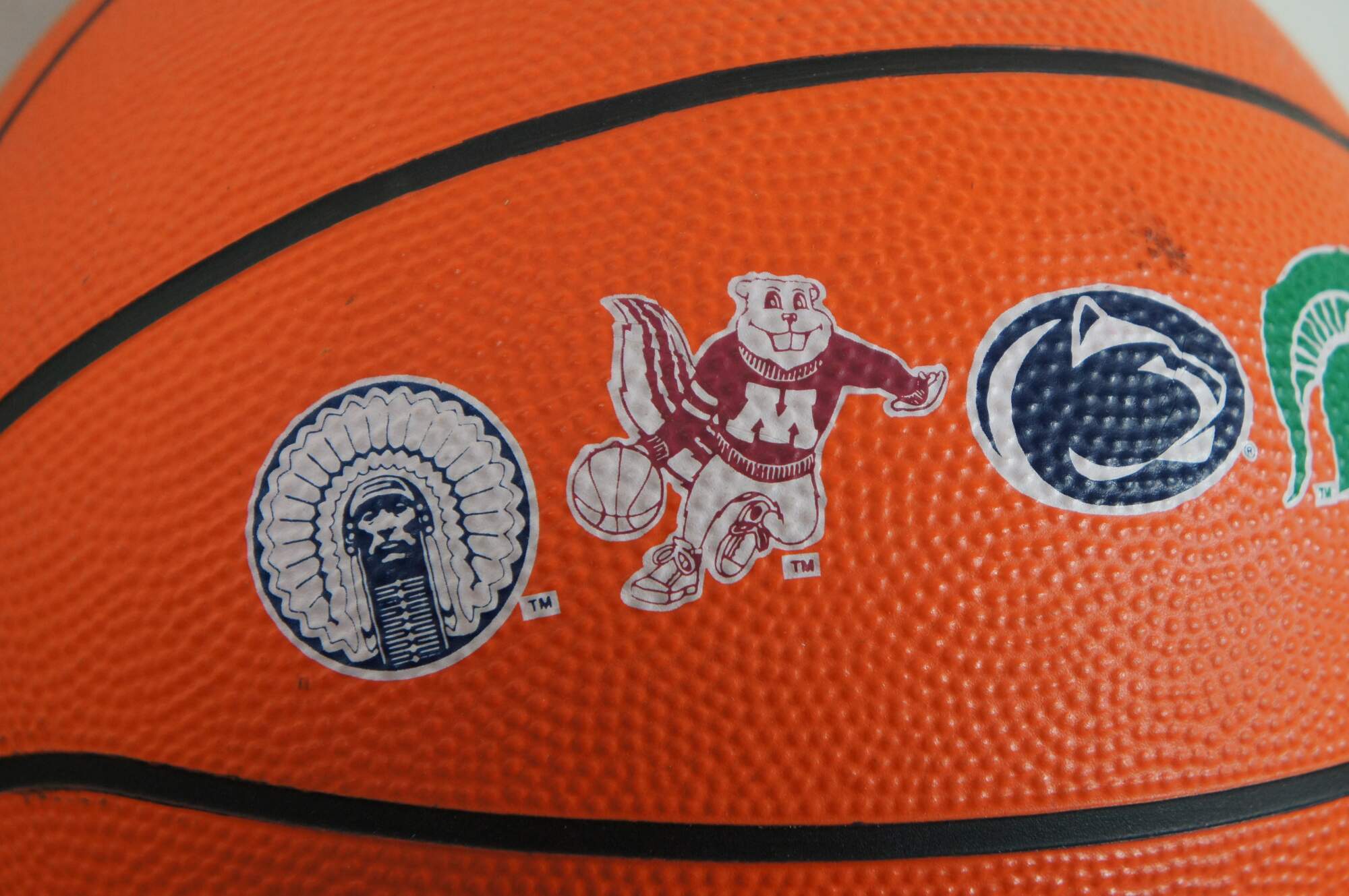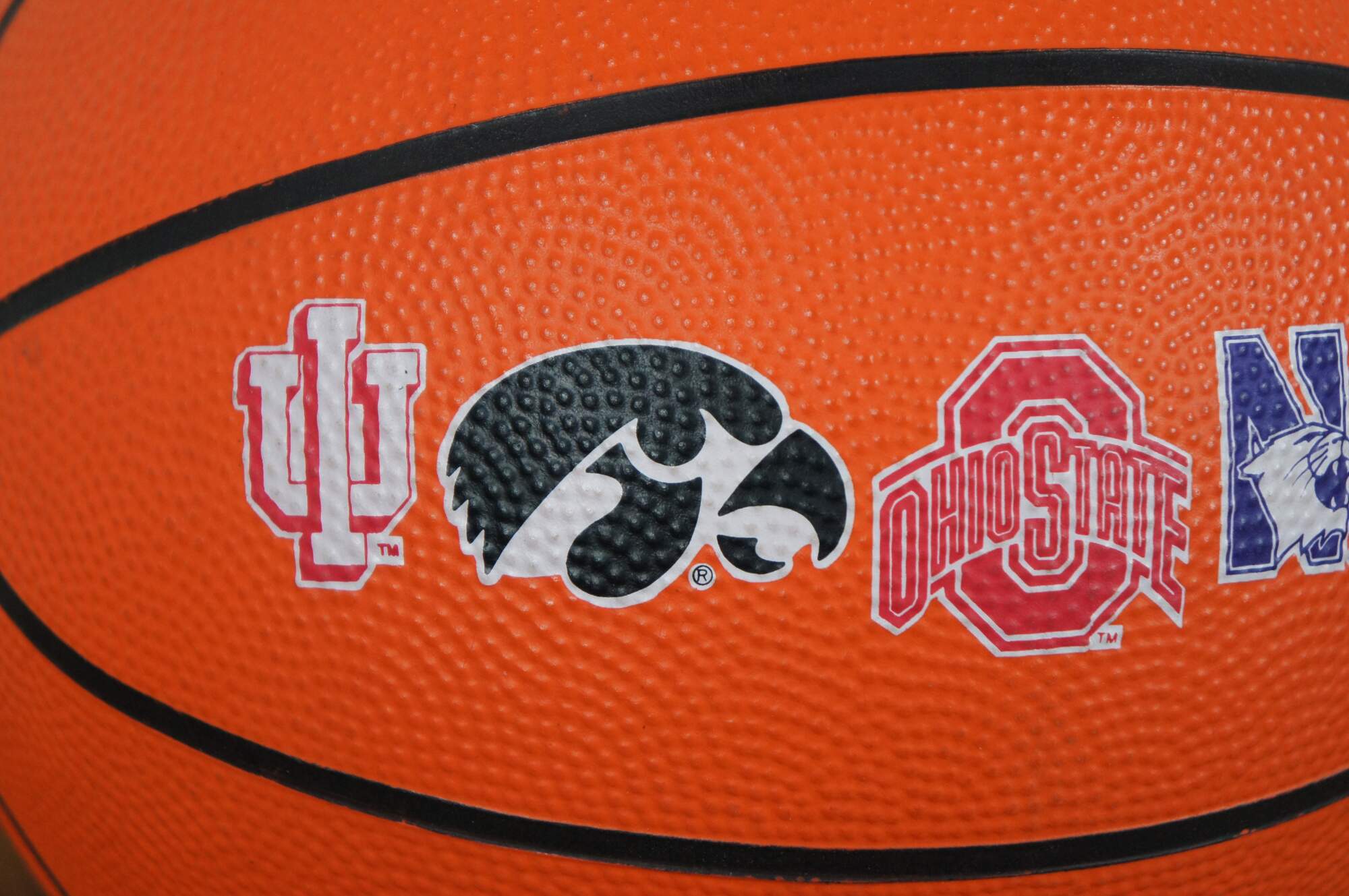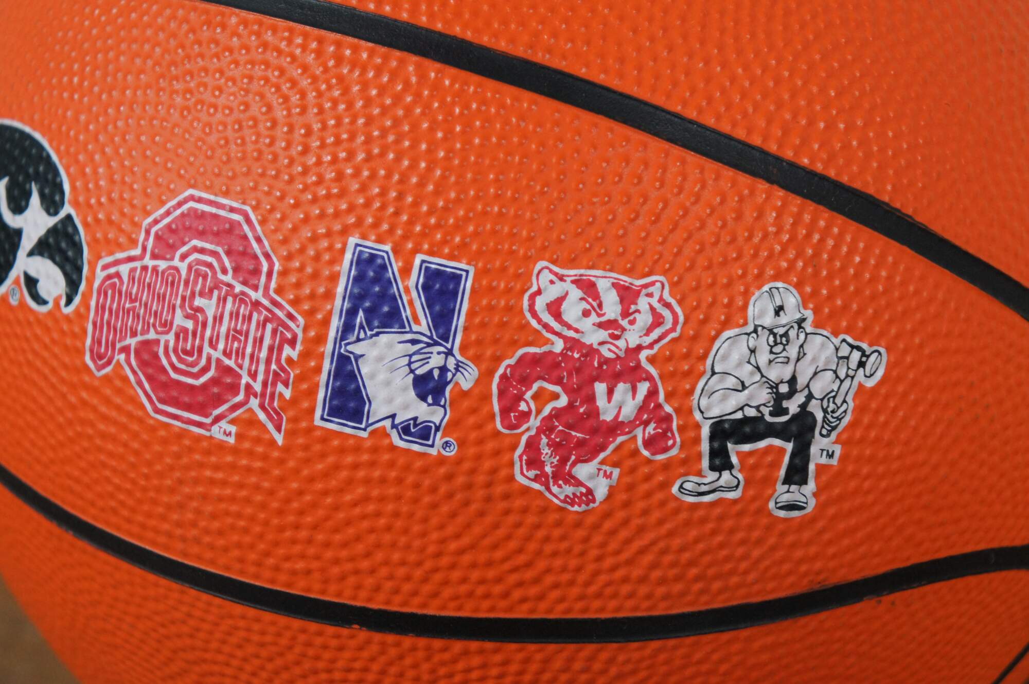 Vintage 1994 Limited Edition Big Ten Conference sponsered by Hardee's full size souvenir basketball - traditional orange and black with Big Ten Conference team logos. Produced by Hutch. Made in Thailand. Indiana Hoosiers IU, Iowa Hawkeyes, Ohio State Buckeyes OSU, Northwestern Wildcats, Wisconson Badgers, Purdue Boilermakers, Illinois Fighting Illini, Minnesota Golden Gophers, Penn State Nittany Lions, Michigan State Spartans, Michigan Wolverines.