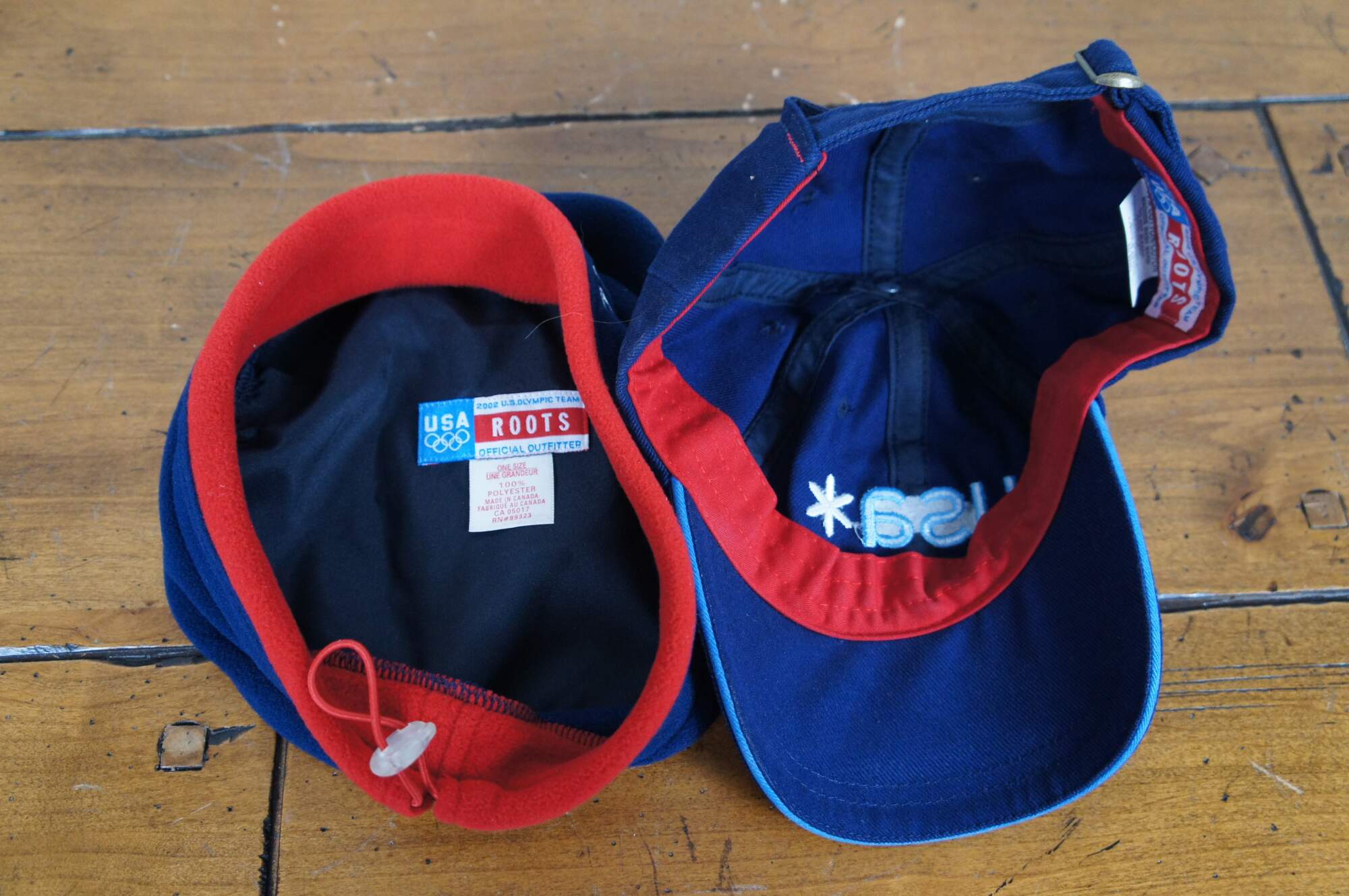 Pair of Team USA hats from the 2002 Winter Olympics in Salt Lake City. One fleece beret and one ball cap. Produced by Roots - Official Outfitter of the 2002 Olympics.