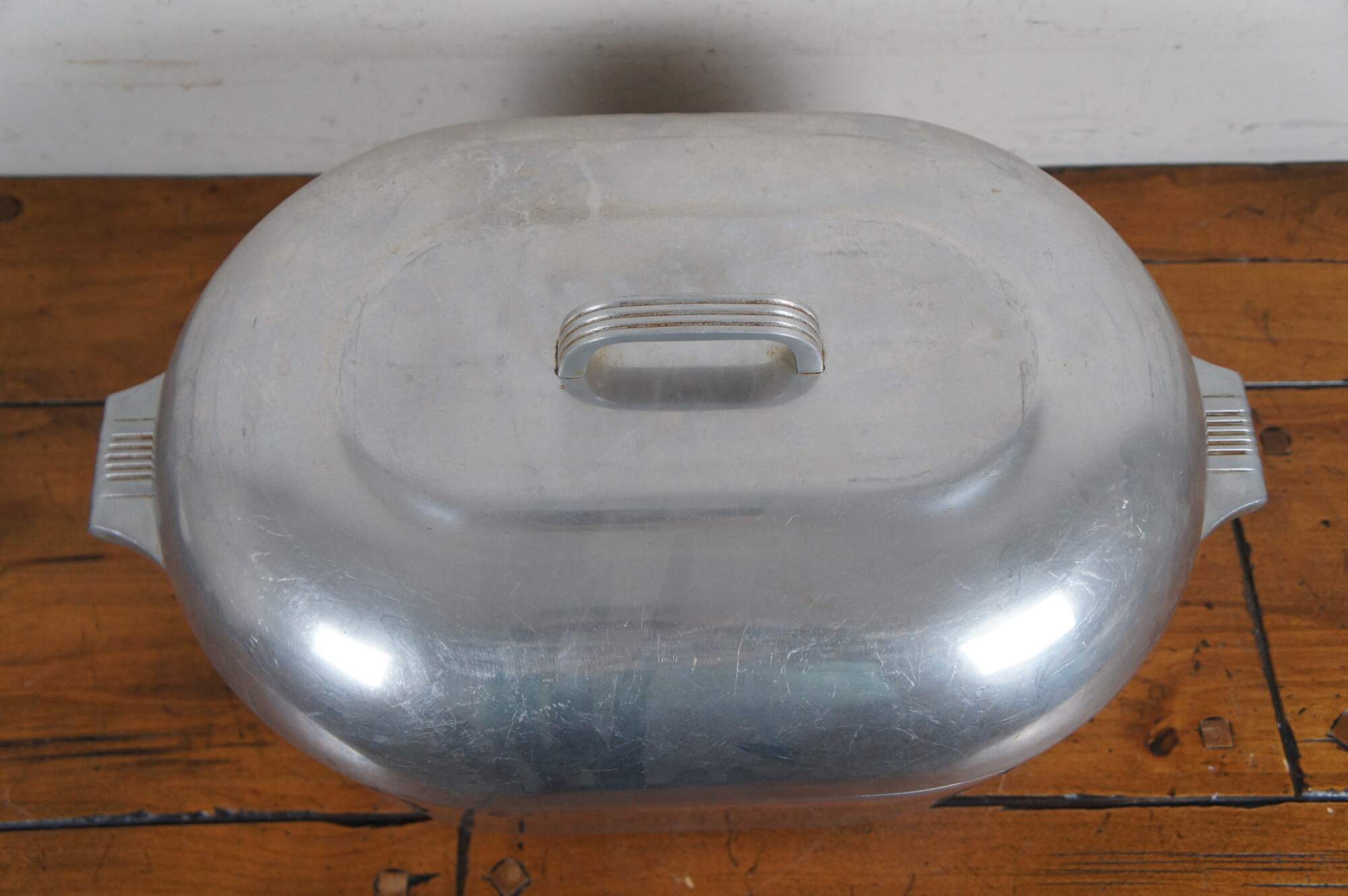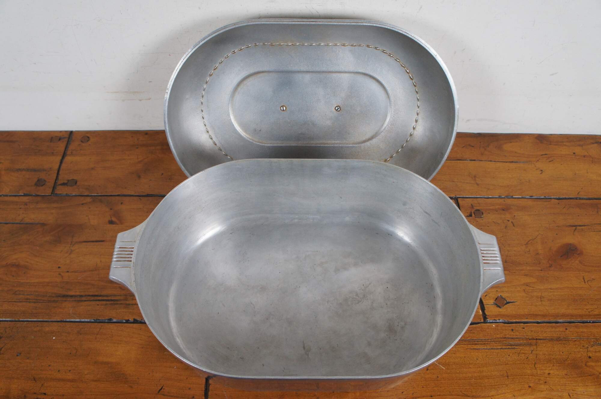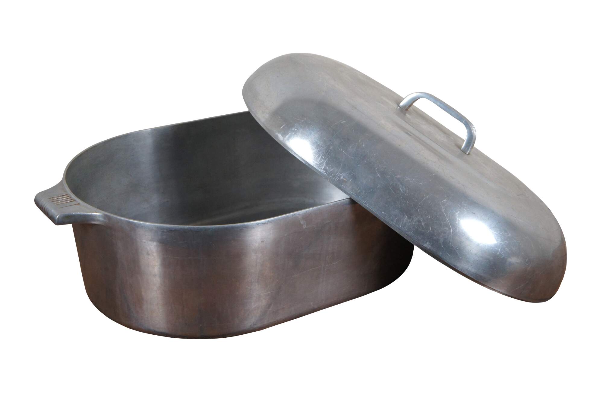 Early to mid 20th century Wagner Ware Magnalite number 4269 extra large, 17 quart aluminum turkey roaster / dutch oven featuring simple art deco styling on the base and lid handles.