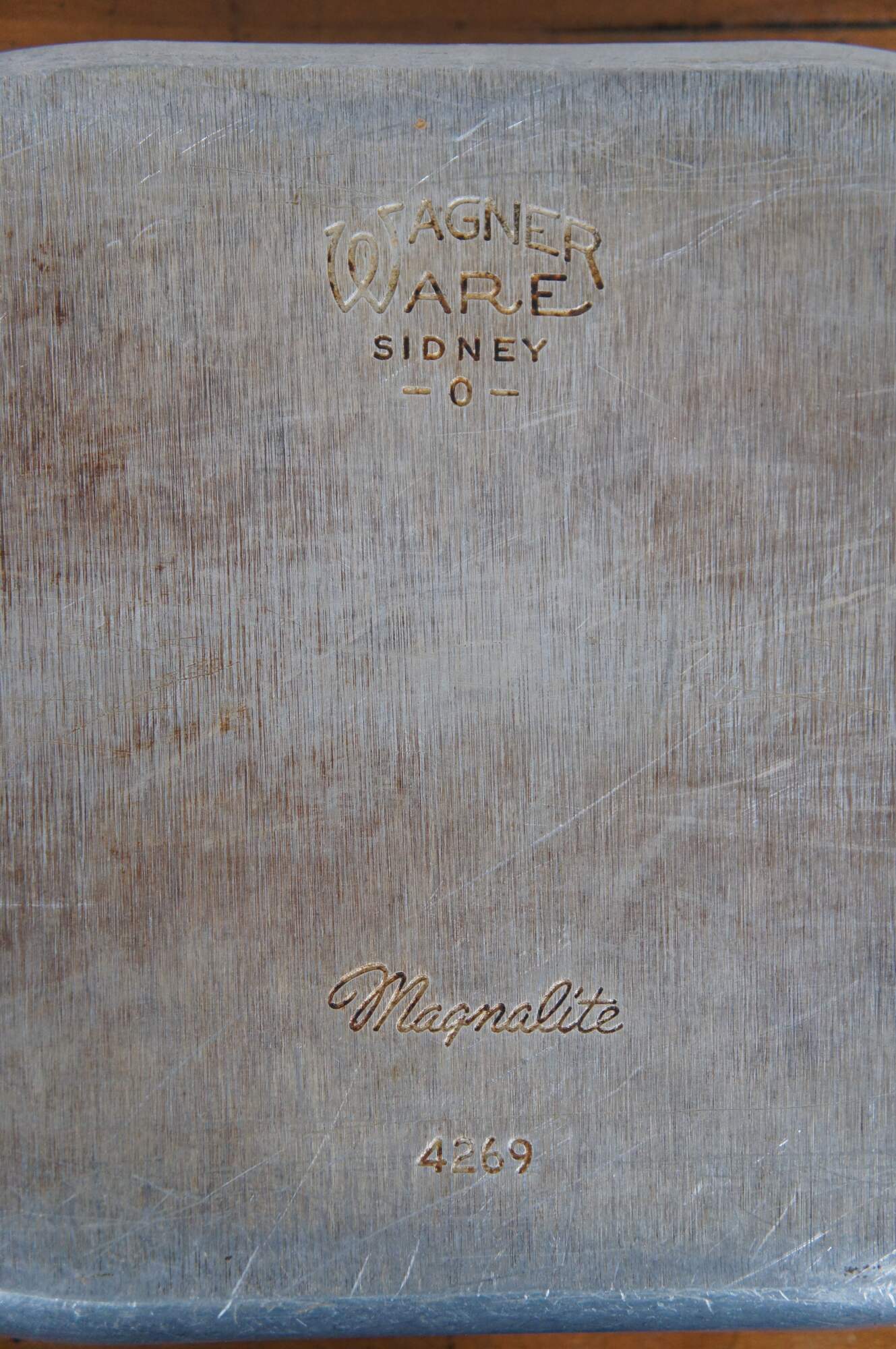 "The Wagner Manufacturing Company was founded by the brothers Milton M. and Bernard P. Wagner in Sidney, Shelby County, Ohio. The company was incorporated in 1891. The principal owners were Bernard, Milton, Louis, and William Wagner. The brothers were joined by R.O. Bingham, who had in the past worked at the Marion Stove Works and the Sidney Manufacturing Company, who became superintendent of the company. At first producing only cast-iron products, the company added nickel-plated ware in 1892. In 1894 Wagner was one of the first to make aluminum cookware. The company acquired their competitor Sidney Hollow Ware from Phillip Smith in 1897. A third brother, William H. Wagner, joined the company to run this operation. In 1903 Sidney Hollow Ware was sold back to Smith. By 1913 Wagner was distributing its products globally. Wagner grew into a major manufacturer of cast iron and aluminum products, selling in the US and Europe. Brand names included Wagner Ware, National, Long Life, Wardway and Ward's Cast Iron. The "Magnalite" line of cast aluminum products was introduced in the early 1930s, made from a patented aluminum alloy. Starting in 1946 the heirs of the founding Wagner brothers divested their holdings in the company. The Randall Company of Cincinnati, Ohio, a car parts manufacturer, bought the Wagner Manufacturing Company in 1952. In 1957 Randall's Wagner division acquired Griswold Manufacturing from McGraw-Edison. In 1959 Randall was itself acquired by Textron. Textron sold the Wagner and Griswold lines to General Housewares Corporation (GHC) in 1969. In 1996 GHC sold rights to the Wagner and Griswold lines to Slyman Group. After being allowed to fall into receivership, in 2000 the Wagner and Griswold trademarks were bought by the American Culinary Corporation of Willoughby, Ohio. As of 2014 American Culinary claimed to market products branded Wagner, Wagnerware, Magnalite and Griswold; though there were no reports of any Wagner Ware products actually being sold." (Source: Wikipedia)