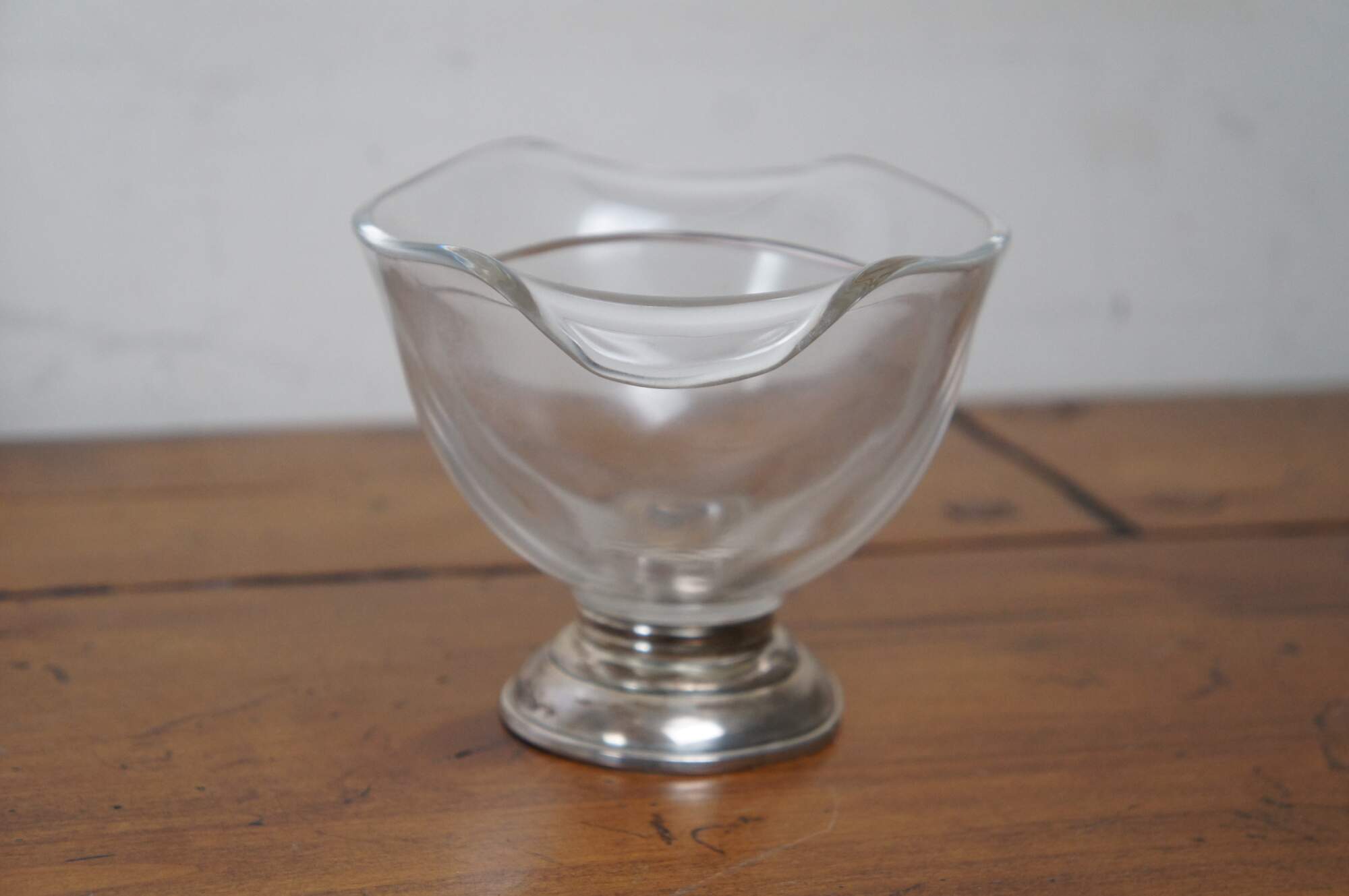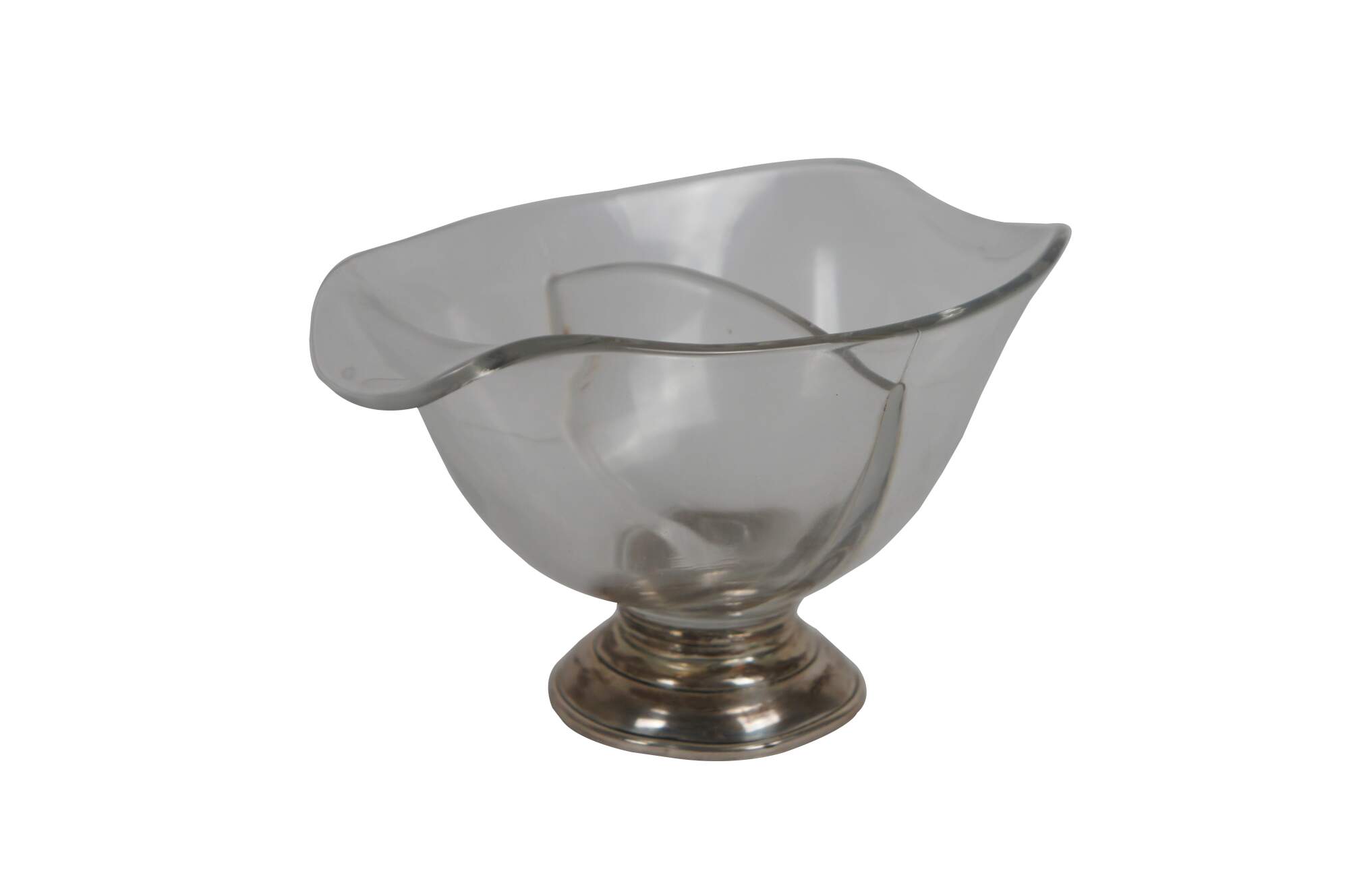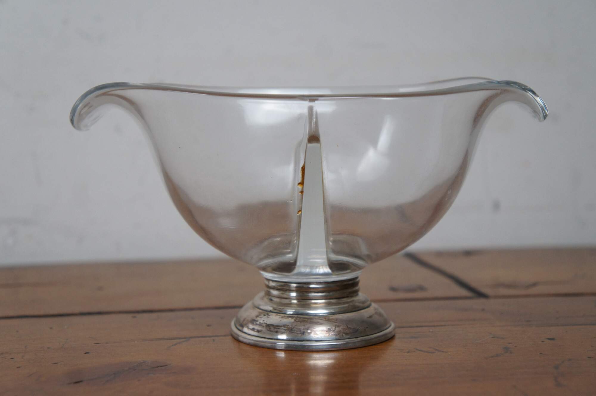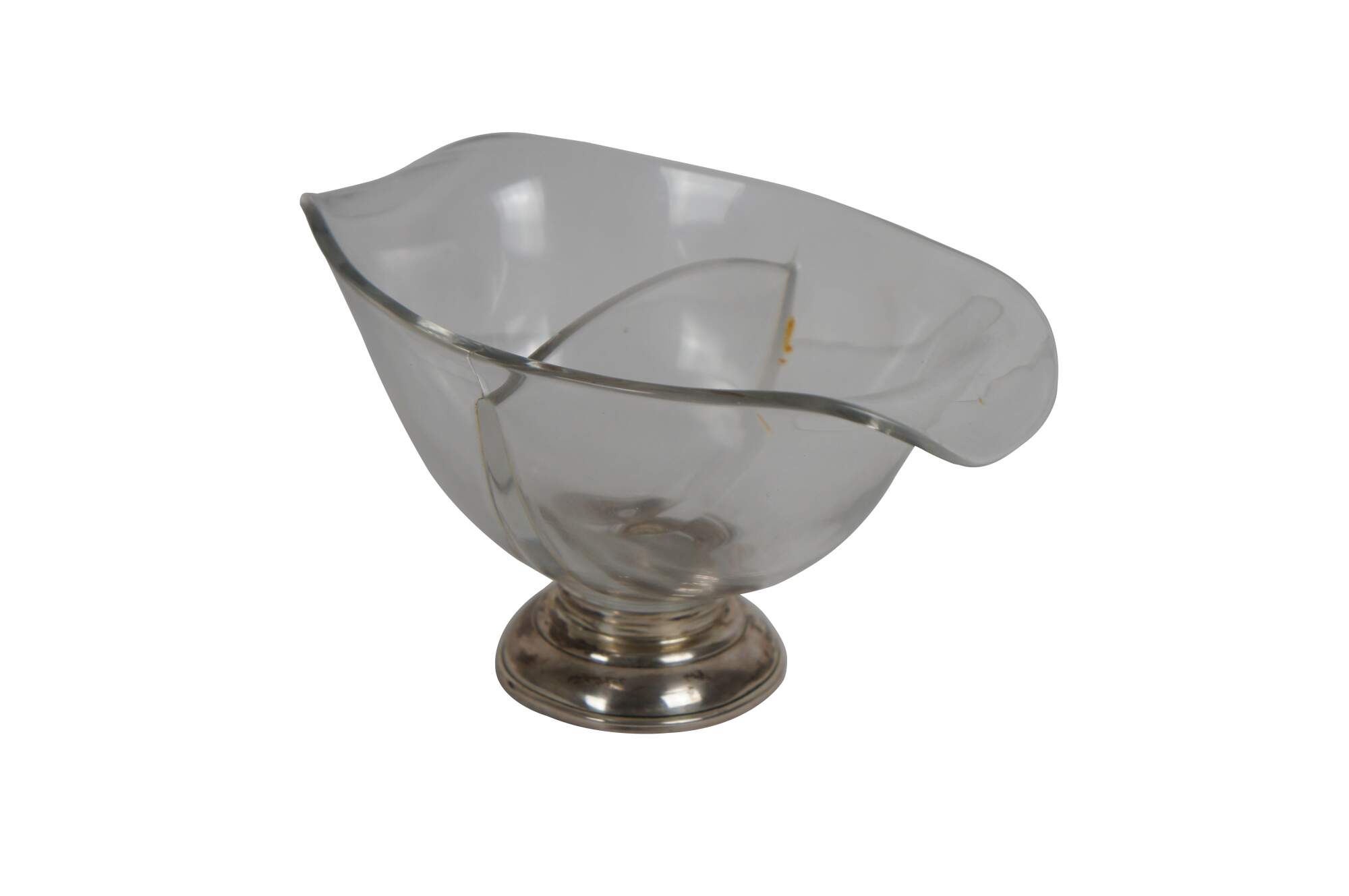 Vintage plain glass candy / nut dish featuring a boat shape with sloping lips at either end, divided into two sections, with a sterling silver pedestal base. Marked B-I Sterling.