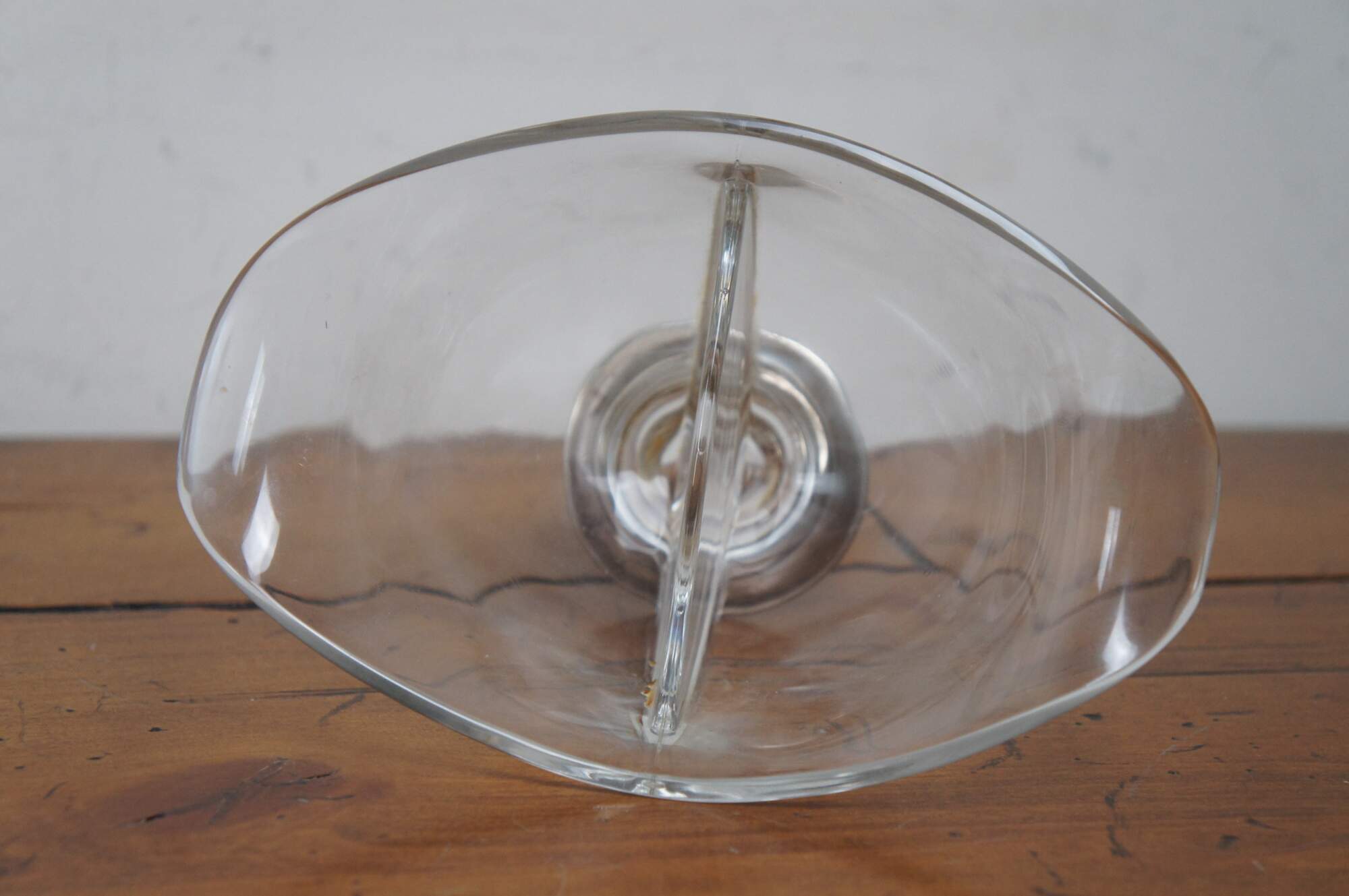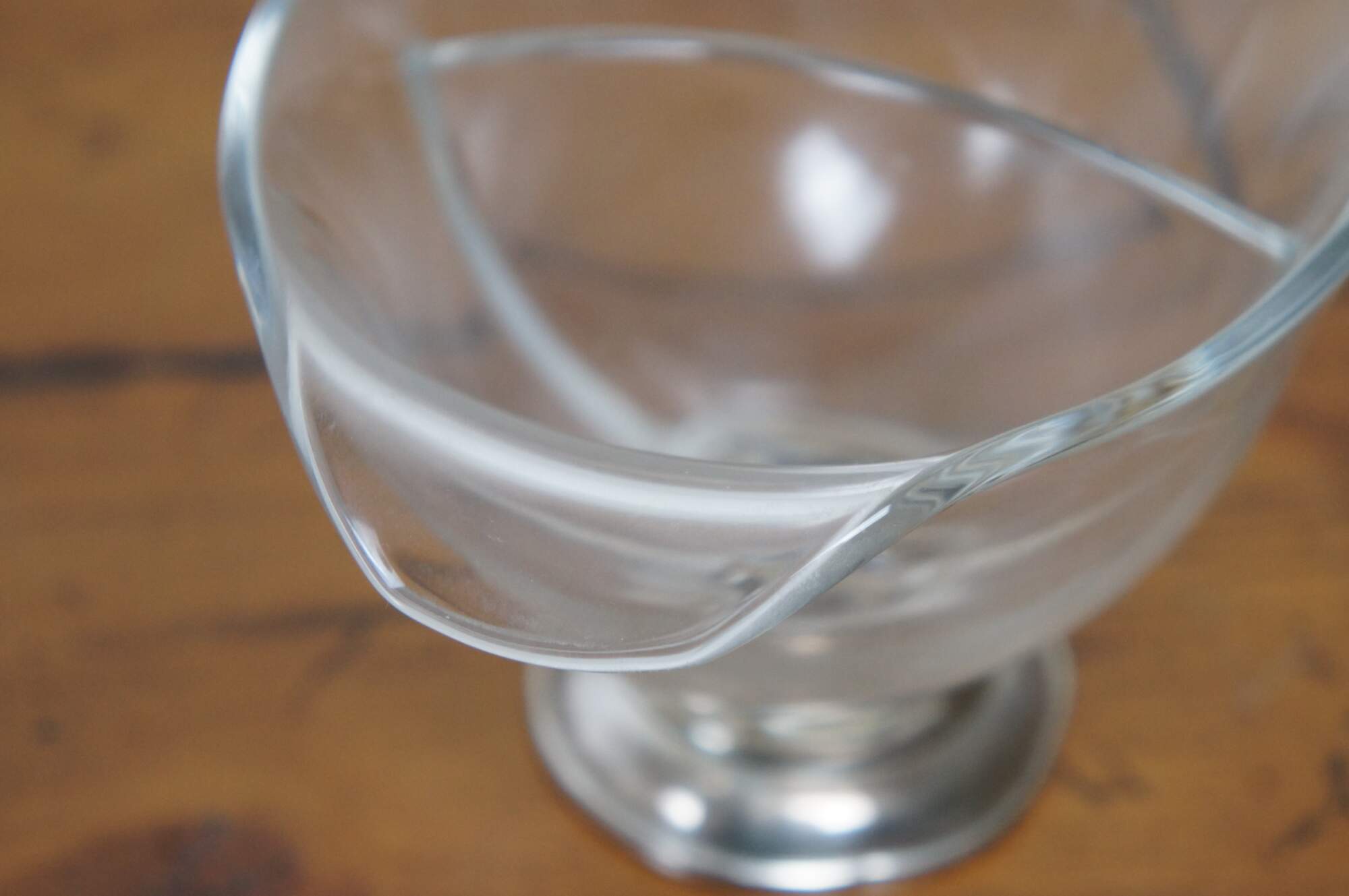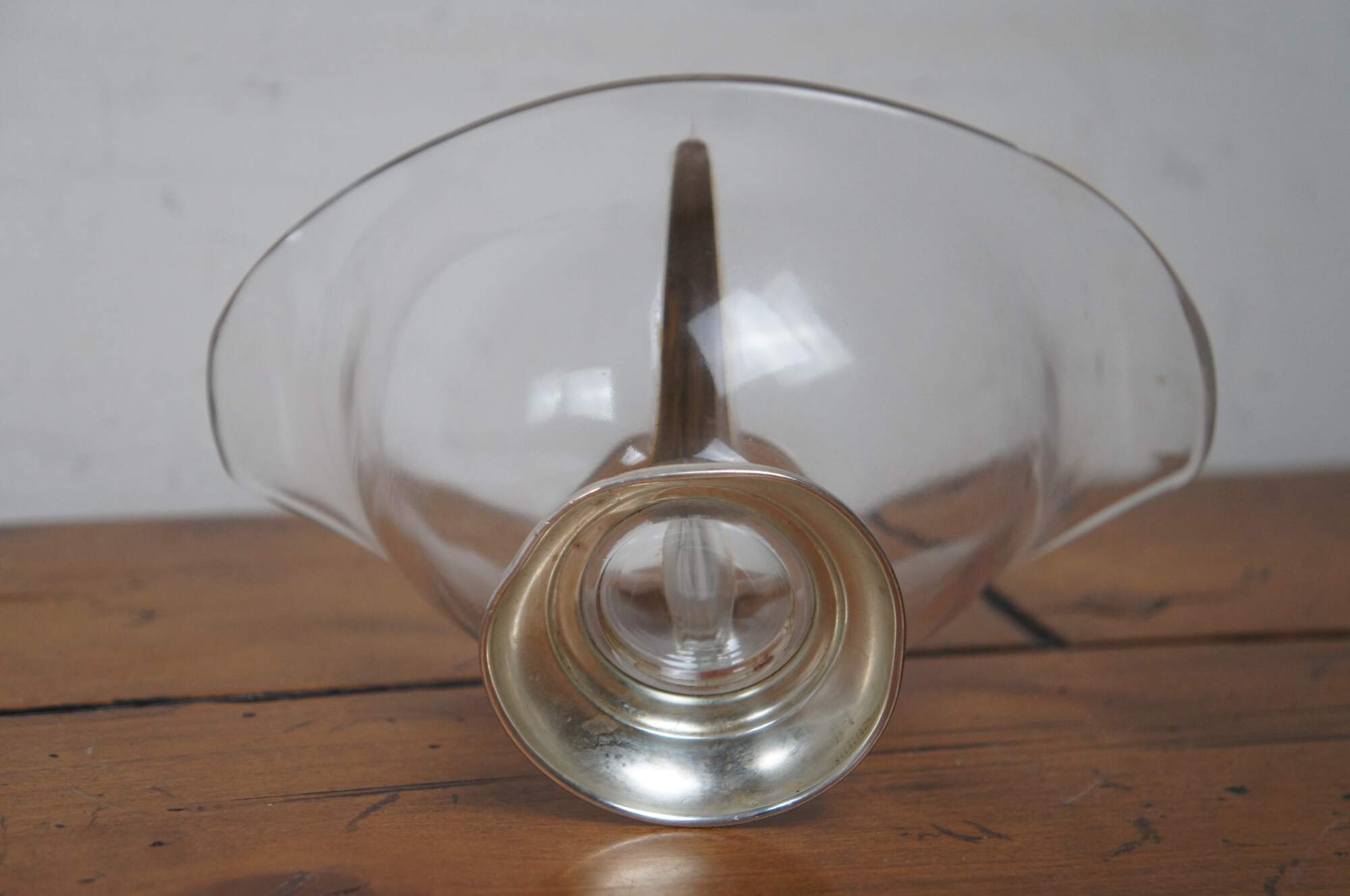 Vintage plain glass candy / nut dish featuring a boat shape with sloping lips at either end, divided into two sections, with a sterling silver pedestal base. Marked B-I Sterling.