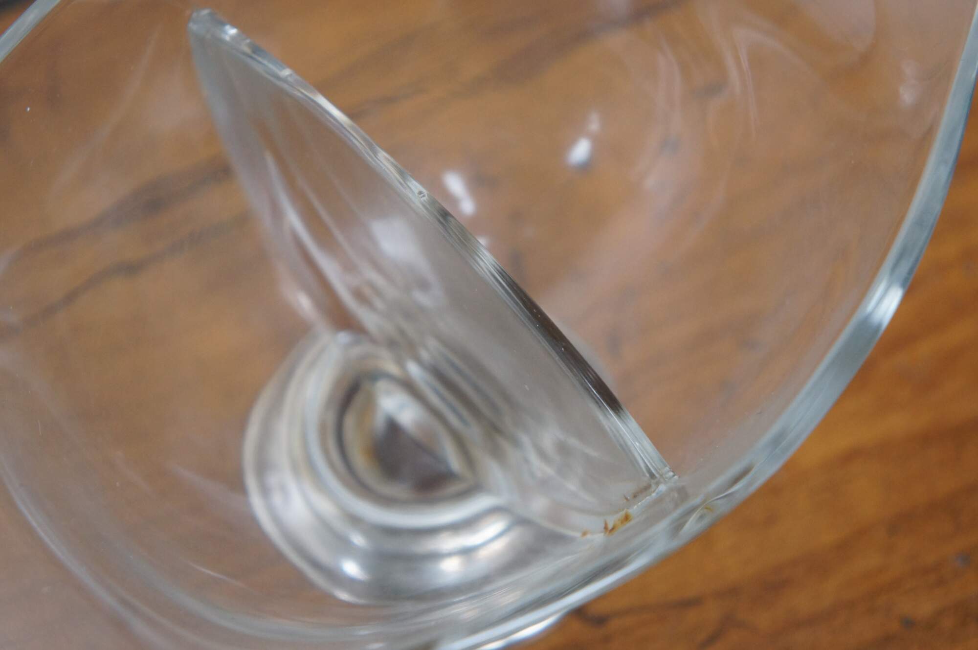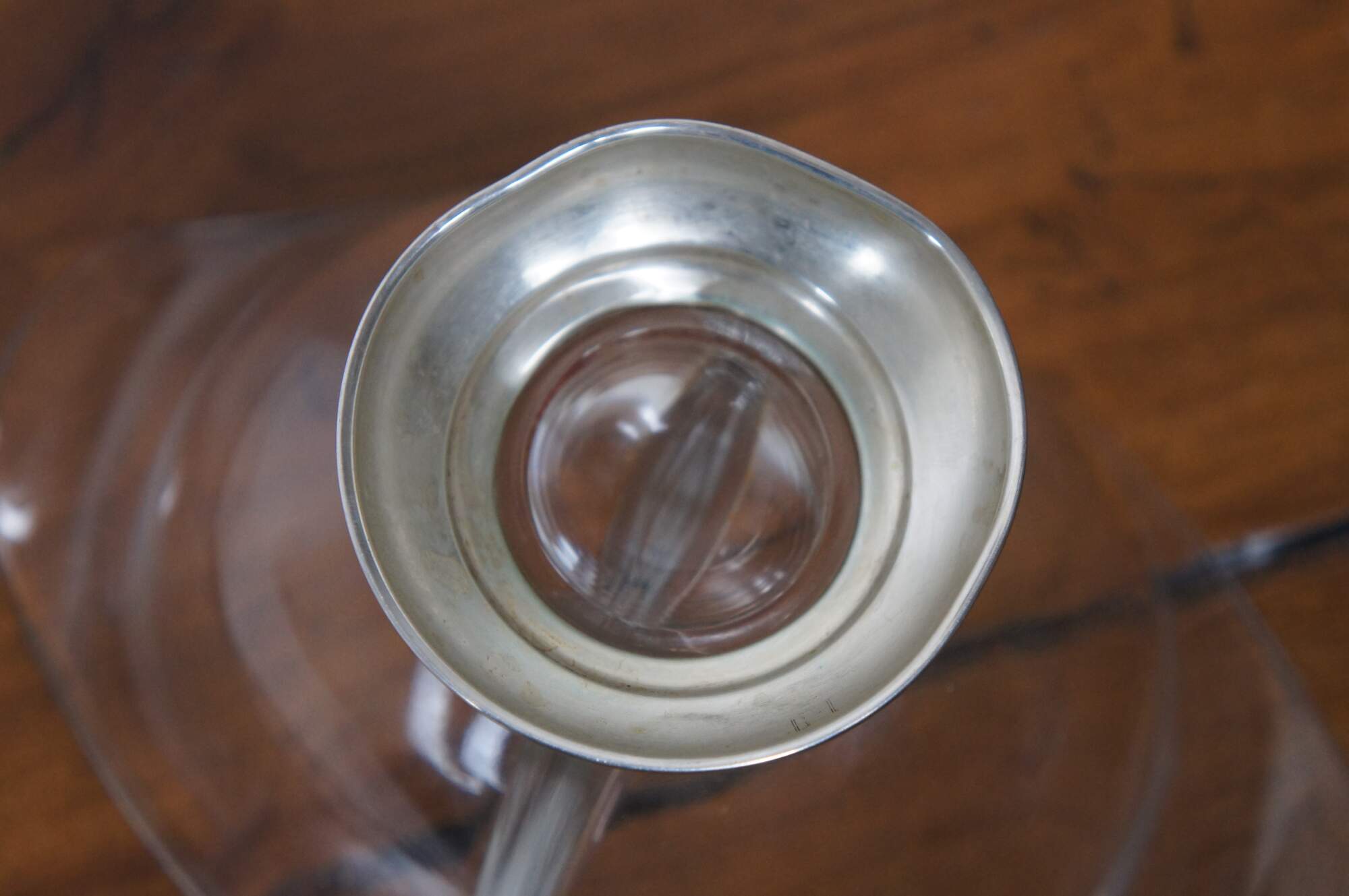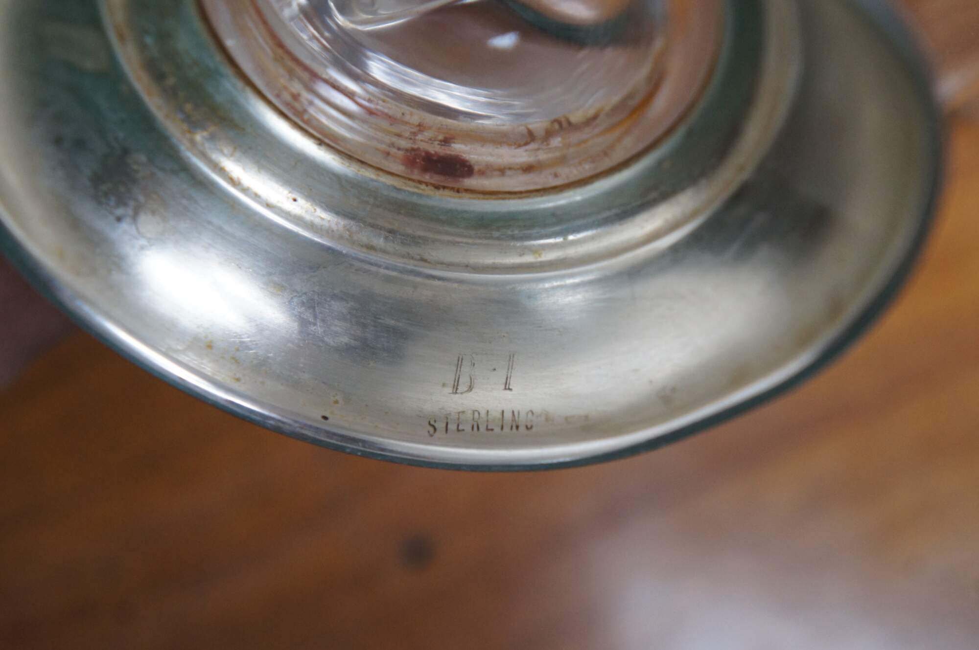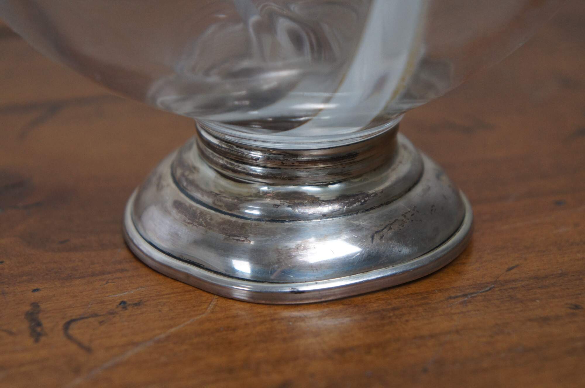 Vintage plain glass candy / nut dish featuring a boat shape with sloping lips at either end, divided into two sections, with a sterling silver pedestal base. Marked B-I Sterling.