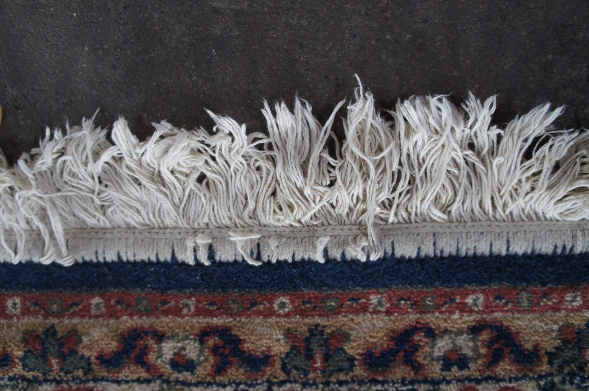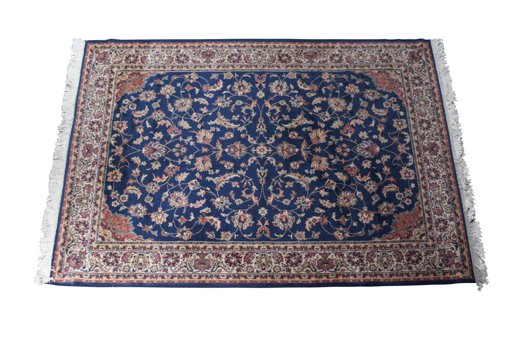 A beautiful blue floral all over area rug. Features an interlaced patter of creme, beige, reds and greens. Polypropylene BCF