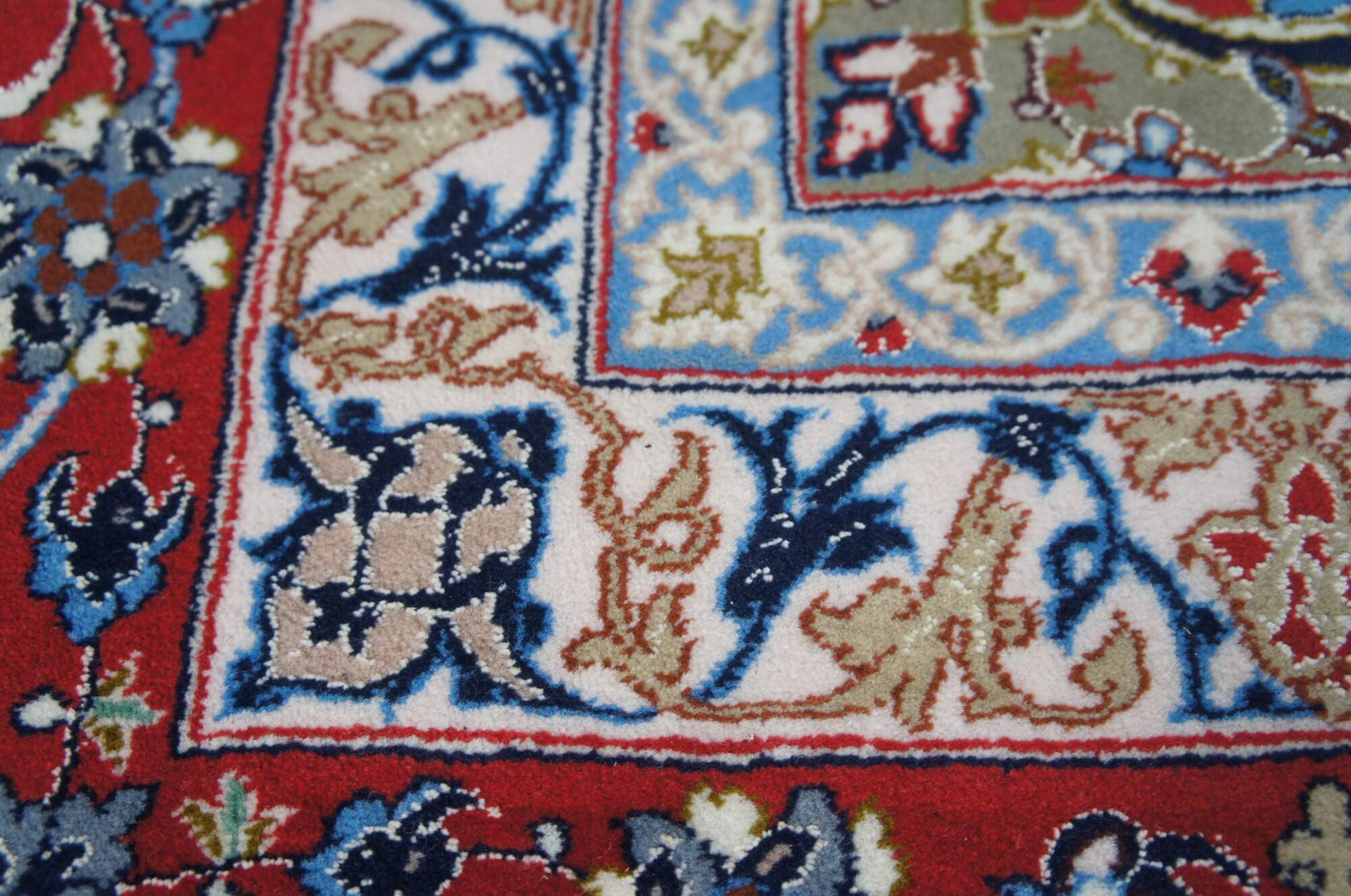 Vintage fine Persian Nain rug or carpet. Made of silk and wool featuring floral all over design with central medallion. 484 knots per square inch. Reds, blues, beige, white, tan, greens, pinks, browns.